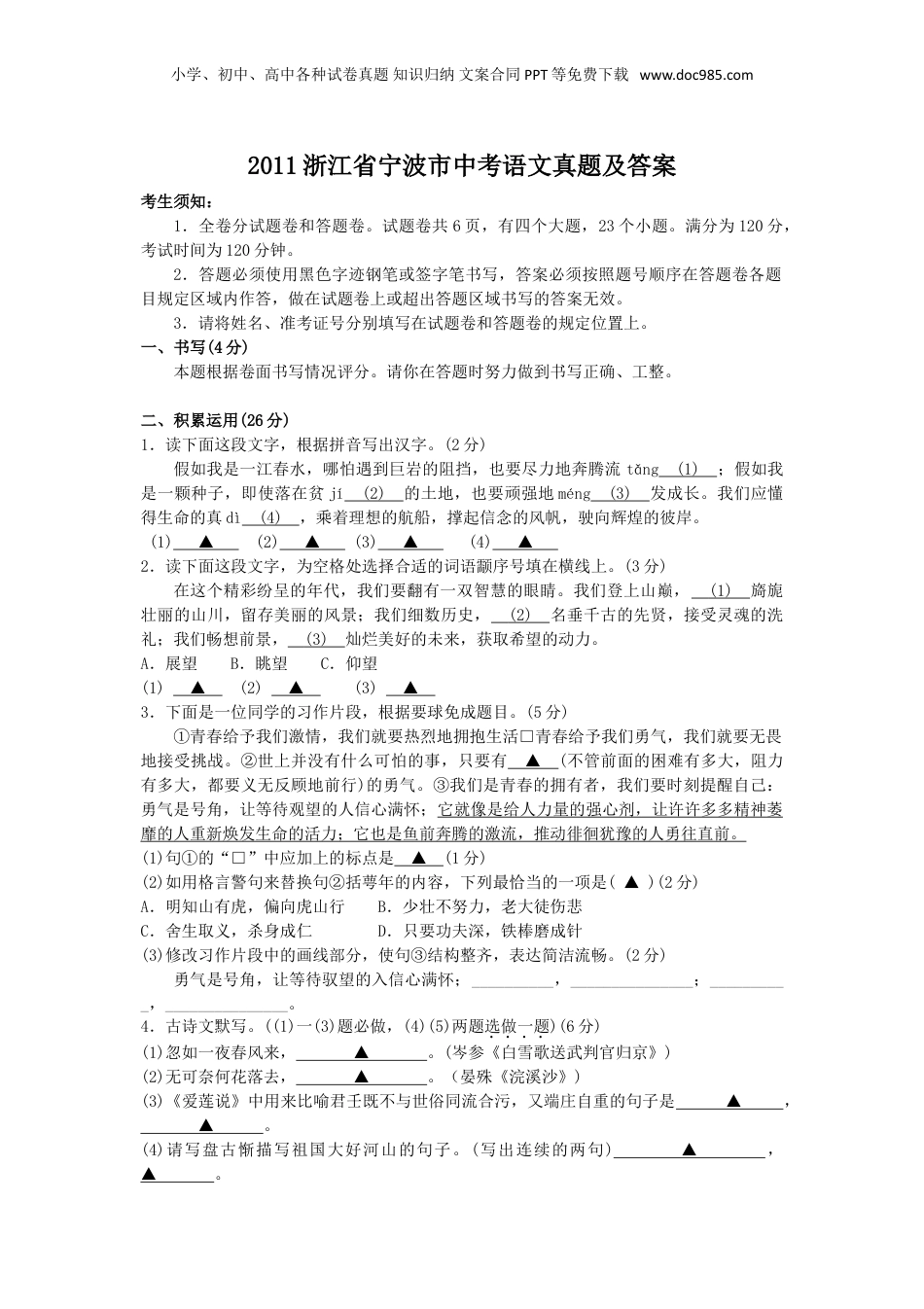 小学、初中、高中各种试卷真题知识归纳文案合同PPT等免费下载www.doc985.com2011浙江省宁波市中考语文真题及答案考生须知:1.全卷分试题卷和答题卷。试题卷共6页,有四个大题,23个小题。满分为120分,考试时间为120分钟。2.答题必须使用黑色字迹钢笔或签字笔书写,答案必须按照题号顺序在答题卷各题目规定区域内作答,做在试题卷上或超出答题区域书写的答案无效。3.请将姓名、准考证号分别填写在试题卷和答题卷的规定位置上。一、书写(4分)本题根据卷面书写情况评分。请你在答题时努力做到书写正确、工整。二、积累运用(26分)1.读下面这段文字,根据拼音写出汉字。(2分)假如我是一江春水,哪怕遇到巨岩的阻挡,也要尽力地奔腾流tǎng(1);假如我是一颗种子,即使落在贫jí(2)的土地,也要顽强地méng(3)发成长。我们应懂得生命的真dì(4),乘着理想的航船,撑起信念的风帆,驶向辉煌的彼岸。(1)▲(2)▲(3)▲(4)▲2.读下面这段文字,为空格处选择合适的词语颥序号填在横线上。(3分)在这个精彩纷呈的年代,我们要翻有一双智慧的眼睛。我们登上山巅,(1)旖旎壮丽的山川,留存美丽的风景;我们细数历史,(2)名垂千古的先贤,接受灵魂的洗礼;我们畅想前景,(3)灿烂美好的未来,获取希望的动力。A.展望B.眺望C.仰望(1)▲(2)▲(3)▲3.下面是一位同学的习作片段,根据要球免成题目。(5分)①青春给予我们激情,我们就要热烈地拥抱生活□青春给予我们勇气,我们就要无畏地接受挑战。②世上并没有什么可怕的事,只要有▲(不管前面的困难有多大,阻力有多大,都要义无反顾地前行)的勇气。③我们是青春的拥有者,我们要时刻提醒自己:勇气是号角,让等待观望的人信心满怀;它就像是给人力量的强心剂,让许许多多精神萎靡的人重新焕发生命的活力;它也是鱼前奔腾的激流,推动徘徊犹豫的人勇往直前。(1)句①的“□”中应加上的标点是▲(1分)(2)如用格言警句来替换句②括萼年的内容,下列最恰当的一项是(▲)(2分)A.明知山有虎,偏向虎山行B.少壮不努力,老大徒伤悲C.舍生取义,杀身成仁D.只要功夫深,铁棒磨成针(3)修改习作片段中的画线部分,使句③结构整齐,表达简洁流畅。(2分)勇气是号角,让等待驭望的入信心满怀;__________,_______________;__________,_______________。4.古诗文默写。((1)一(3)题必做,(4)(5)两题选做一题)(6分)(1)忽如一夜春风来,▲。(岑参《白雪歌送武判官归京》)(2)无可奈何花落去,▲。(晏殊《浣溪沙》)(3)《爱莲说》中用来比喻君壬既不与世俗同流合污,又端庄自重的句子是▲,▲。(4)请写盘古惭描写祖国大好河山的句子。(写出连续的两句)▲,▲。小学、初中、高中各种试卷真题知识归纳文案合同PPT等免费下载www.doc985.com(5)请写出古诗诃中抒发爱国情怀的句子占(写出连续前两句)▲,▲。5.名著阅读。(4分)根据一位同学阅读《海底两万里》等两部名著后写的读书笔记,请你按要求填空。【读书笔记一】情节概括A.孤身斗舰队,奇招灭火灾B.风暴中偏航,麦田里获救C.遭冰山封路,陷缺氧危机D.海底观美景,洋面见海滩(1)上述情节中,出自《海底两万里》的有(▲)(▲)(只填序号)【读书笔记二】人物点评A.他,知识渊博,机智勇敢,沉着果断。他是二个神秘浪漫的人,也是一个反抗压迫、支持正义的战士。B.他,心地善良,刚毅勇敢,酷爱真理。他是一个外科医生,也是一个喜欢冒险、渴望自由的航海家。(2)上述点评中,点评尼摩船长的一项是(▲)6.综合性学习。(6分)近日,学校开展“走近‘海上丝缚乏路’”活动,请你参加并完成以下任务。活动一:下面是陈教授与学生的一段对话,请在横线处补写恰当的内容。(2分)学生:陈教授,您好!我是校报小记者,想请您介绍一下“海上丝绸之路”。陈教授:好的!“海上丝绸之路”指的是古代海上的重要贸易通道。当时我国的商人从东南沿海港口出发,将中国的丝绸、陶瓷、荼叶等物产通过船只运往海外,又带回了香料、毛织品、玻璃器皿、象牙等异域珍品。学生:_________________________________________________________________陈教授:这个问题提得好!“海上丝绸之路”的开通,不仅对当时国内外市场的开拓、农...