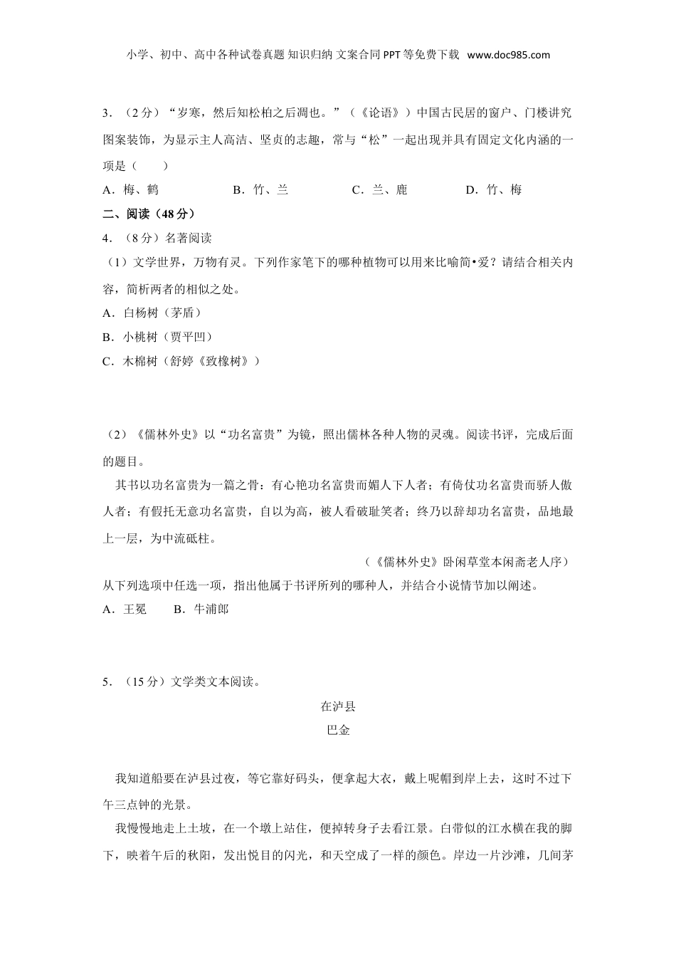 小学、初中、高中各种试卷真题知识归纳文案合同PPT等免费下载www.doc985.com2019年浙江省丽水市中考语文试卷一、积累(14分)1.(4分)阅读下面文字,根据语境完成后面的题目。吹号者从铺散着稻草的地面上起来了,他不埋怨自己是睡在如此潮湿的泥地上,他轻jié____地绑好了裹腿,他用冰冷的水洗过了脸,他看着那些发出困fá____的鼾声的同伴,于是他伸手携去了他的号角;门外依然是一片黝黑,黎明没有到来,那□醒他的是他自己对于黎明的过于殷切的想望。(节选自《艾青诗选•吹号者》)(1)根据拼音写出相应的汉字。轻jié困fá(2)加点字“埋”在文中读音正确的一项是A.máiB.mán(3)填入文中□正确的一项是A.惊B.警2.(8分)古诗文名句默写。春去春回几番景,花开花落总关情。春水初生,白居易信马踏春钱塘湖畔,“①浅草才能没马蹄”,一个姹紫嫣红的春天款款而至;夏花绚烂,周敦颐流连荷池。“予独爱②,濯清涟而不妖”,君子之风盈盈其间;秋风萧瑟,秋瑾小住京华,“③,秋容如拭”,知音难觅的孤独涌上心头;北风卷地,冬雪骤降,岑参戌守边塞,“④,”,以想象化冬为春,奇情逸发。而当落花时节,好友王昌龄左迁龙标,即便潇洒如李白,也不免在“⑥”时生出几分伤感;然而,也总有人能跳出落英伤怀的窠臼,龚自珍就以“⑦,⑧”赋予了落花别样的情意。小学、初中、高中各种试卷真题知识归纳文案合同PPT等免费下载www.doc985.com3.(2分)“岁寒,然后知松柏之后凋也。”(《论语》)中国古民居的窗户、门楼讲究图案装饰,为显示主人高洁、坚贞的志趣,常与“松”一起出现并具有固定文化内涵的一项是()A.梅、鹤B.竹、兰C.兰、鹿D.竹、梅二、阅读(48分)4.(8分)名著阅读(1)文学世界,万物有灵。下列作家笔下的哪种植物可以用来比喻简•爱?请结合相关内容,简析两者的相似之处。A.白杨树(茅盾)B.小桃树(贾平凹)C.木棉树(舒婷《致橡树》)(2)《儒林外史》以“功名富贵”为镜,照出儒林各种人物的灵魂。阅读书评,完成后面的题目。其书以功名富贵为一篇之骨:有心艳功名富贵而媚人下人者;有倚仗功名富贵而骄人傲人者;有假托无意功名富贵,自以为高,被人看破耻笑者;终乃以辞却功名富贵,品地最上一层,为中流砥柱。(《儒林外史》卧闲草堂本闲斋老人序)从下列选项中任选一项,指出他属于书评所列的哪种人,并结合小说情节加以阐述。A.王冕B.牛浦郎5.(15分)文学类文本阅读。在泸县巴金我知道船要在泸县过夜,等它靠好码头,便拿起大衣,戴上呢帽到岸上去,这时不过下午三点钟的光景。我慢慢地走上土坡,在一个墩上站住,便掉转身子去看江景。白带似的江水横在我的脚下,映着午后的秋阳,发出悦目的闪光,和天空成了一样的颜色。岸边一片沙滩,几间茅小学、初中、高中各种试卷真题知识归纳文案合同PPT等免费下载www.doc985.com屋,两只囤船,还有一列帆墙高耸的小舟。这些似乎全陷入静止的状态,但是来往的人却使它们活动了。一切于我都是十分亲切。我怀着轻快的心把它们全收入我的眼里。我望着四周景物渐渐地回复到静止的状态中,我才拔脚往坡上的城市走去。这是我第二次踏上泸县的土地,第一次还是在十七年前。那时我不过是十八九岁的少年,怀着一颗年轻的纯白的心。现在我重睹这个可爱的土地,我的心上已经盖满了人世的创伤我想我应该有了大的改变。但是站在一个掷“糖罗汉”的摊子跟前,听着从两个人手里先后掷下的骰子声,望着摊子上三四排长短不齐的糖人,我忽然觉得自己回到小孩的时代了那个把全部注意力放在碗里的孩子仿佛就是我。我留恋地在这个摊子前站了一刻钟光景,我感到一种幼稚的喜悦。那个孩子空着手走开了,他讲话用的是我极其熟习的声音。这声音引着我走了大半条街。我跟着小孩走,好像在追自己的影子,我似乎一跳就越过了二十年的长岁月。然而就只走了大半条街,就只有这么短短的快乐的时间!我突然被拉回来了,从远去了的年代回来了。一大片炸毁房屋的废墟横在我面前,全是碎砖破瓦,只有倾斜欲坠的断墙颓壁留下来,告诉我们人家的界限。焦炙的黑印涂污了粉白墙,孤寂的梁柱带着伤痕向人诉说昔日的繁荣和今日...