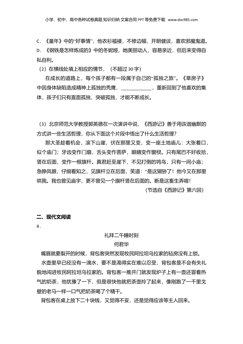 小学、初中、高中各种试卷真题知识归纳文案合同PPT等免费下载www.doc985.com2015年浙江省丽水市中考语文试卷一、填空题1.阅读下面一段文字,根据拼音写出相应的汉字。时间存在于日常生活中﹣﹣在(1)zhǎng了又枯的河流中,在候鸟的一次次迁徙中,在小孩子(2)xīxì的笑声中。我们和时间是一对相依相偎的伴侣,一起走到(3)dìlǎotiānhuāng。A、先天下之忧而忧(《岳阳楼记》)B、而不知太守之乐其乐也(《醉翁亭记》)C、乃丹书帛曰“陈胜王”(《陈涉世家》)D、闻寡人之耳者,受下赏(《邹忌讽齐王纳谏》)2.古诗文名句默写。(1)是故,教然后知困。(《所有嘉肴》)(2),无案牍之劳形。(刘禹锡《陋室铭》)(3)共看明月应垂泪,。(白居易《望月有感》)(4)莫道不消魂,。(李清照《醉花阴》)(5“”)行舟江上,吴均在富春江感受了急湍甚箭,猛浪若奔的汹涌气势,而王湾在北固山下领略了,的浩渺景象。(6)在纪念中国人民抗日战争胜利70周年的主题班会上,同学们一起吟诵文“天祥的《过零丁洋》,其中,”,不禁让我们想起中华民族的那段悲惨历史,也让我们进一步体会到个人前途与国家命运紧密相连的深刻道理。3.名著阅读(1)下面有关小说人物表述错误的一项是A.《格列佛游记》中的大人国国王,他思想深邃,主张和平,但受环境限制,对外界所知不多。B.《海底两万里》中的康赛尔,他忠心耿耿,性格沉稳,为人随和,对分类学入迷。小学、初中、高中各种试卷真题知识归纳文案合同PPT等免费下载www.doc985.comC“”.《童年》中的好事情,他衣衫褴褛,不修边幅,开朗健谈,喜欢邪魔鬼道。D.《钢铁是怎样炼成的》中的冬妮娅,她美丽动人,容易亲近,但后来变得自私自利。(2)在横线处填上相应的情节,(不超过30字)“”在成长的道路上,每个孩子都有一段属于自己的孤独之旅。《草房子》中因身体缺陷造成精神上孤独的秃鹰,,重新回到了他喜欢的集体,孩子们只有直面孤独,突破孤独,才能不断成长。(3)北京师范大学教授郭英德在一次演讲中说,《西游记》善于用诙谐幽默的方式讲一些生活哲理,你从下面这个片段中悟出了什么生活哲理?那大圣趁着机会,滚下山崖,伏在那里又变,变一座土地庙儿:大张着口,似个庙门;牙齿变作门扇,舌头变作菩萨,眼睛变作窗棂。只有尾巴不好收拾,竖在后面,变作一根旗杆。真君赶至崖下,不见打倒的鸨鸟,只有一间小庙;“急睁凤眼,仔细看知之,见旗杆立在后面,笑道:是这猢狲了!他今又在那里哄我。我也曾见庙宇,更不曾见一个旗杆竖在后面的。断是这畜生弄喧!(节选自《西游记》第六回)二、现代文阅读4.礼拜二午睡时刻何君华嘴唇就要裂开的时候,背包客突然发现牧民阿拉坦乌拉家的毡房没有上锁。水壶里早已经没有一滴水,要不是渴得实在难以忍受,背包客是不会有失礼貌地闯进牧民阿拉坦乌拉家的。背包客一推开门就发现炉子上有一壶还冒着热气的奶茶,他犹豫了一下,但是很快他就把茶壶拎了起来,像刚跑了一千里戈壁的老马一样一口气把奶茶喝了个精干。背包客在桌上放下二十块钱,又觉得不妥,还是觉得应该等主人回来。小学、初中、高中各种试卷真题知识归纳文案合同PPT等免费下载www.doc985.com这一等就是一天。阿拉坦乌拉带着他的羊群跑到遥远的乌日更草场去了,直到天完全黑下来才慢悠悠地回了家。“背包客听见屋外的动静,连忙起身走了出来。背包客抱歉地说:老大爷,实”在对不起,我见你家没有锁门,冒昧闯了进来,请你原谅。阿拉坦乌拉并不理会背包客的解释,自顾自把羊群赶进羊圈。背包客以为主人生气了,只能像一棵秋天的马连草一样局促地站在那里。“”等安顿好羊群,主人终于说话了:什么是锁?背包客这才发现,主人的门上根本没有锁。主人的话让背包客彻底震惊了。这简直令人难以置信,人类已经走到二十一世纪,竟然还有人不知道什么是锁。背包客试图给主人解释一番什么是锁,但是他马上陷入了困境,他发现给一个没见过锁的人解释什么是锁无异于给一个没见过马的人解释什么是套马一样困难。他只能勉强解释说,锁是一种工具,把它安在门上别人就进不来,只有用钥匙才能把它打开。一把锁只有一把钥匙,...