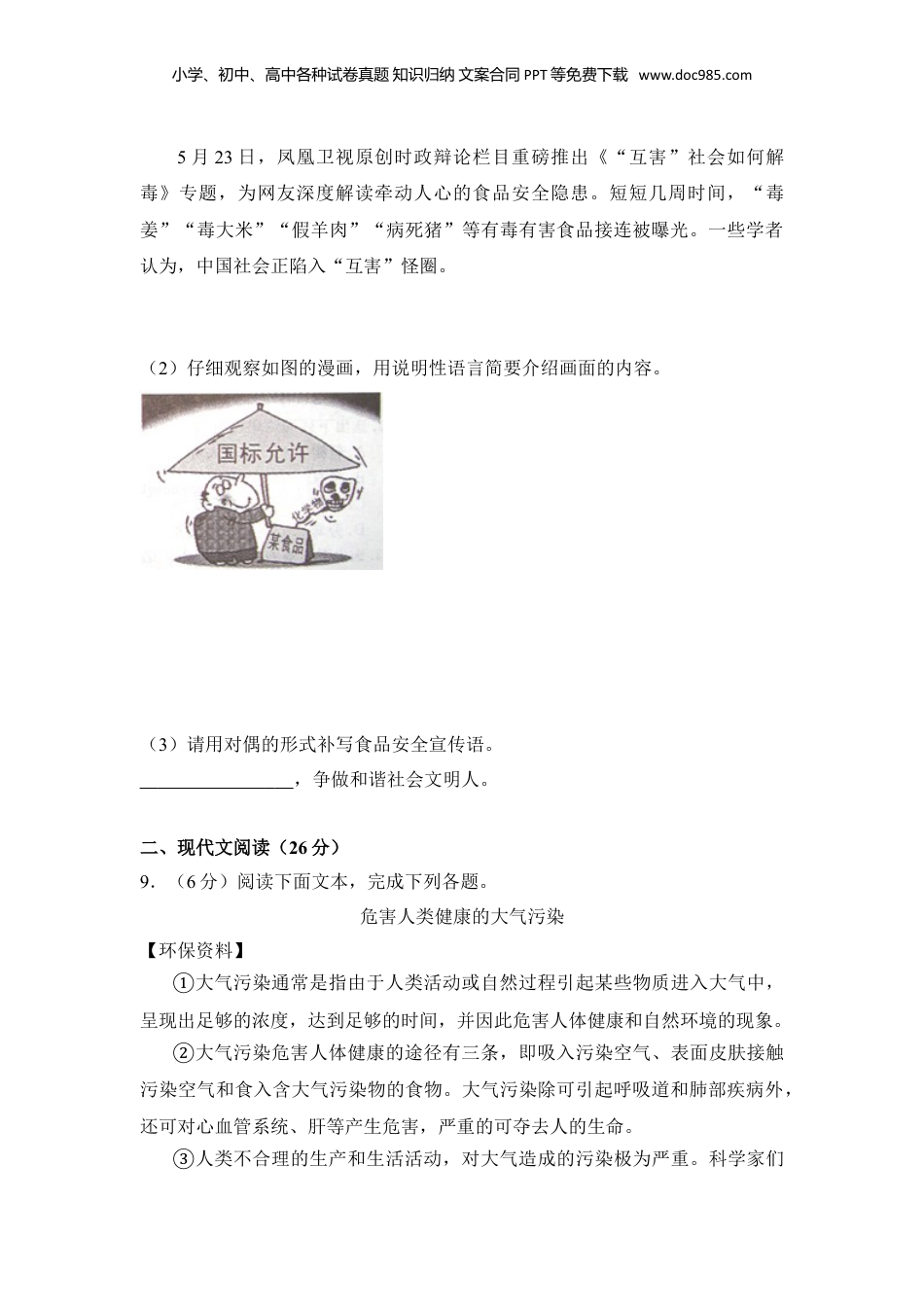 小学、初中、高中各种试卷真题知识归纳文案合同PPT等免费下载www.doc985.com2013年浙江省丽水市中考语文试卷一、语文知识积累与运用(24分)1.(2分)选出下列词语中加点字的读音完全正确的一项()A.诘责(jié)嫌恶(wù)叱咤风云(chà)B.绯红(fēi)黄晕(yùn)面面相觑(qù)C.慰藉(jí)仁立(zhù)广袤无垠(mào)D.鄙夷(bǐ)腼腆(diǎn)风雪载途(zài)2.(2分)选出下列词语中没有错别字的一项()A.轩榭骇人听闻饶恕毛骨耸然B.招徕沥尽心血告磬引颈受戮C.琐屑相形见拙苍茫重峦叠嶂D.旁骛一代天骄丘壑粗制滥造3.(2分)选出下列横线上依次填入词语最恰当的一项()(1)当白昼的一切迷雾都了以后,黑夜要你用另一种眼睛看这个世界。(2)我们不能于那片秋之收获,要把自己的汗水融入冬天的缓冲与再造,让我们憧憬的春天更富有魅力。(3)花一样的生命,一瓣一瓣地绽放她的美丽,使这个原本死寂荒凉的世界,充满快乐。A.消散沉醉五彩缤纷B.消逝沉醉姿态万千C.消散沉溺姿态万千D.消逝沉溺五彩缤纷4.(2分)选出下列句子中没有语病的一项()A.莫言获得诺贝尔文学奖之后,又默默地写了一本大约16万字左右的书。B.第27届浙江省青少年科技创新大赛注重培养青少年科学探究和创新实践。C.贝克汉姆在巴黎圣日耳曼队夺冠后宣布即将退役,停止20年的辉煌职业生涯。D.如今,年轻人喜欢上网购物,一些老年人也加入到“淘宝一族”的行列。5.(2分)选出下列横线上依次填入句子最恰当的一项。()不管你是何等渺小、卑微,你同样可以谱写生活的童话,创造生命的奇迹。小学、初中、高中各种试卷真题知识归纳文案合同PPT等免费下载www.doc985.com也许,正是因为有了你,世界才增添了一份色彩,眼泪,;仁慈,;同情,;关怀,。你要勇敢地对自己说:“我很重要,我就是一道风景。”①要为众生的苦难而发②温暖鳏寡孤独的凄凉③要为别人的悲伤而流④给予老弱病残的贫苦。A.④①③②B.③①④②C.③②④①D.④②③①6.(2分)选出下列关于名著的表述不正确的一项()A.《水浒》的作者是元末明初的施耐庵,小说塑造了众多草莽英雄的形象,表达了人们对平等与人人互爱的理想社会的向往B.《骆驼祥子》中的祥子来自农村,他老实,健壮、自尊好强,但经历了人生的三起三落后,变得麻木、狡猾、自暴自弃C.《海底两万里》中的“我”在海底散步时看到了灿烂的美景,并把心中的新奇感觉用一种约定的记号告诉了康塞尔D.《简•爱》中的罗切斯特先生在桑菲尔德庄园里拐弯抹角地试探简•爱的心思,最终两人互相倾吐衷肠,表白了爱意7.(6分)古诗文名句、俗语默写。(1)山重水复疑无路,。(陆游《游山西村》)(2),千里共婵娟。(苏轼《水调歌头》)(3)三人行,!择其善者而从之,其不善者而改之。(《论语•述而》)(4),得理一尺。(俗语)(5)李白的送别诗别有情味:《送孟浩然之广陵》中的“孤帆远影碧空尽,唯见长江天际流”,用浩浩东去的一江春水寄托对朋友的一片深情;《送友人》中的“,”用徐徐而下的一轮红日隐喻对朋友的惜别之情。8.(6分)综合性学习。某校九年级同学开展食品安全大讨论,请你参加并完成以下任务。(1)给下面一则新闻拟写标题。(不超过15字)小学、初中、高中各种试卷真题知识归纳文案合同PPT等免费下载www.doc985.com5月23日,凤凰卫视原创时政辩论栏目重磅推出《“互害”社会如何解毒》专题,为网友深度解读牵动人心的食品安全隐患。短短几周时间,“毒姜”“毒大米”“假羊肉”“病死猪”等有毒有害食品接连被曝光。一些学者认为,中国社会正陷入“互害”怪圈。(2)仔细观察如图的漫画,用说明性语言简要介绍画面的内容。(3)请用对偶的形式补写食品安全宣传语。,争做和谐社会文明人。二、现代文阅读(26分)9.(6分)阅读下面文本,完成下列各题。危害人类健康的大气污染【环保资料】①大气污染通常是指由于人类活动或自然过程引起某些物质进入大气中,呈现出足够的浓度,达到足够的时间,并因此危害人体健康和自然环境的现象。②大气污染危害人体健康的途径有三条,即吸入污染空气、表面皮肤接触污染空气...