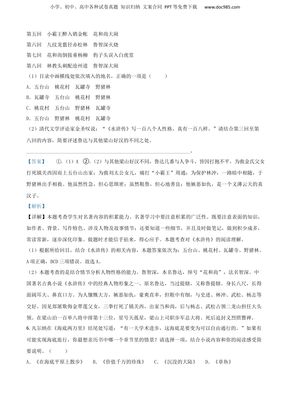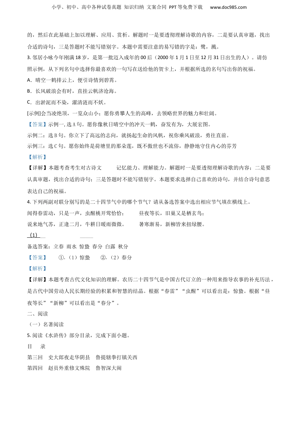 小学、初中、高中各种试卷真题知识归纳文案合同PPT等免费下载www.doc985.com2018年浙江省金华、丽水中考语文试题一、积累1.阅读下面文字,根据语境完成后面的题目。歌声如飘风,如一(lǚ)摇曳的游丝,在夜空中遥远地传来,渐行渐近,渐渐地清越,终于到了窗下,歌词也清晰可了。咿呀的桨声,夹着(jī)荡的水声,缓慢地为歌声击节。然后歌声又渐渐远去,渐渐地微弱,渐渐地模糊,终于轻烟般在静夜中消失。(摘自柯灵《枕畔歌声》)(1)根据拼音写出相应的汉字。一(lǚ)______(jī)_______荡(2)填入文中正确的一项是()A.辨B.辩(3)加点字“模”在文中读音正确的一项是()A.múB.mó【答案】①.(1)缕②.激③.(2)A④.(3)B【解析】【详解】(1)本题考查学生对字音、字形的掌握情况,辨析字形既要注意平时的积累,也要联系整个词语的意思。本题需要注意的字是:激。(2)“辨”有分辨、辨别之意;“辩”与说话有关,根据“清晰可____”可知此处应填“辨”,故选A。(3)“模”是多音字,根据“模糊”的意思,此处应读“mó”。故选B。2.古诗文名句默写。(1)子曰:“三军可夺帅也,________。”(《论语》)(2)云横秦岭家何在?_______。(韩愈《左迁至蓝关示侄孙湘》)(3)飞鸟本无意,却引情致起。吴均闲居山中,看“①___,云从窗里出”,欣然自在;陶渊明采菊东篱,见“山气日夕佳,②___”,悠然自失;李清照沉醉回舟,误入藕花深处,“③___”,欢快自由;欧阳修兴尽下山,“树林阴翳,④___,游人去而禽鸟乐也”,陶然自得;然杜甫于山河破碎之际,面对长安草木,却有“⑤___,⑥___”的慨叹。惊鸟本无情,有情的是写诗的他和读诗的你。【答案】①.(1)匹夫不可夺志也②.(2)雪拥蓝关马不前③.(3)①鸟向檐上飞④.②飞鸟相与还⑤.③惊起一滩鸥鹭⑥.④鸣声上下⑦.⑤感时花溅泪⑧.⑥恨别鸟惊心【解析】【详解】本题属于基础题,也是各地中考语文必考题。默写题不论分几种类型,都是以记忆、积累为根本小学、初中、高中各种试卷真题知识归纳文案合同PPT等免费下载www.doc985.com的,然后在此基础上加以理解、应用、赏析。解题时一是要透彻理解诗歌的内容,二是要认真审题,找出合适的诗句,三是答题时不能写错别字。本题中需要注意的易写错的字是:鹭,溅。3.邻居小咏今年刚满18岁,是第一批迈入成年的00后(2000年1月1日至12月31日出生的人)。请仿照示例,从下列名句中选择你最喜欢的一句写在送给他的贺卡上,并根据所选的名句写出你的祝福。A.晴空一鹤排云上,便引诗情到碧霄。B.长风破浪会有时,直挂云帆济沧海。C.出淤泥而不染,濯清涟而不妖。[示例]会当凌绝顶,一览众山小;愿你勇攀人生的高峰,去领略世界的魅力和壮阔。【答案】示例一,选A句。愿你像秋日晴空中的冲天一鹤,奋发有为,大展宏图。示例二:选B句。你立下了高远的志向,就扬起生命的风帆,祝你乘风破浪,勇往直前。示例三:选C句。愿你始终是荷塘里的那朵莲,既不傲世也不流俗,静静地守住内心的芬芳【解析】【详解】本题考查考生对古诗文的记忆能力、理解能力。解题时一是要透彻理解诗歌的内容;二是要认真审题,找出合适的诗句;三是答题时不能写错别字。本题要求选择自己喜欢的诗句,并结合诗句意思表达自己的祝福。4.下列两副对联分别写的是二十四节气中的哪个节气?请从备选答案中选出相应节气填在横线上。闻得春雷动,只是一声,虫醒桃开莺恰恰;昼夜等长,旧巢又是栖玄鸟;说来地气苏,正逢二月,牛耕日暖雨微微。暑寒渐易,新柳皆来扭绿腰。(1)_______备选答案:立春雨水惊蛰春分白露秋分【答案】①.(1)惊蛰②.(2)春分【解析】【详解】本题考查古代文化知识的理解。农历二十四节气是中国古代订立的一种用来指导农事的补充历法,是古代中国劳动人民长期经验的积累和智慧的结晶。根据“春雷”“虫醒”可以看出是:惊蛰。根据“昼夜等长”“新柳”可以看出是“春分”。二、阅读(一)名著阅读5.阅读《水浒传》部分目录,完成下面小题。目录第三回史大郎夜走华阴县鲁提辖拳打镇关西第四回赵员外重修文殊院鲁智深大闹小学、初中、高中各种试卷真题知识归纳文案合...