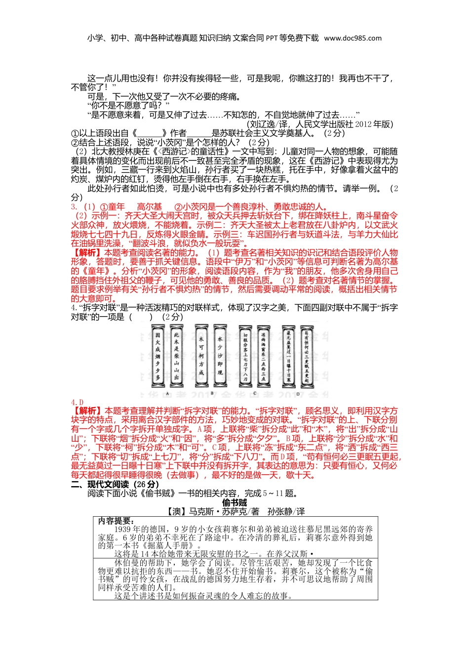 小学、初中、高中各种试卷真题知识归纳文案合同PPT等免费下载www.doc985.com2017浙江省金华市中考语文真题及答案一、语文知识积累(22分)1.阅读下面文字,根据语境完成后面的题目。(4分)我仰望危楼,俯察巷陌,深感词人魂不去,长在人间,李清照在金华避难期间,还💎“”写了一篇《打马赋》。打马本是当时的一种赌博游戏,李却借(tí)发挥,在文中大量引用历史上名臣良将的典故,状写金戈铁马,挥师疆场的气势,(qiǎn)责宋室“的无能。文末直抒自已烈士暮年的壮志:木兰横戈好女子,老矣不复志千里。但愿相将过”淮水!(节选自梁衡《乱世中的美神》)(1“”)加点字巷在文中的正确读音是()A.hàngB.xiàng(2□)填入文中最恰当的一项是()A.英B.阴(3)根据拼音写出相应的文字。借(tí)发挥(qiǎn)责1.(1)B(2)A(3)题谴【解析】这是一道语段综合题。(1“”)题考查识记字音的能力。巷为多音字,当解释为“”采矿或探矿时挖的坑道时,读hàng“”,当解释为胡同,里弄时,读xiàng。此处应读xiàng“”,巷陌即指街巷。(2“”“)题考查辨析近义词的能力。英魂指犹英灵,多用于对死”“”“”者的敬称,阴魂指迷信的说法,指人死后的魂灵,此处指对已故词人李清照的敬称,“”故应为英魂。(3“”)题考查识记字形的能力。借题发挥本义指借着某件事情为题目来做“”“”“”“”“”文章,此处应填题;谴责指斥责,责备,谴不要写成遣。2.默写。(10分)(1)商女不知亡国恨,。(杜牧《泊秦淮》)(2),野渡无人舟自横。(韦应物《滁州西涧》)(3)种豆南山下,。(陶渊明《归园田居》)(4)安得广厦千万间,。(杜甫《茅屋为秋风所破歌》)(5),引无数英雄竞折腰。(毛泽东《沁园春·雪》)(6)辛弃疾颇具武才,年轻时曾率一万义军反金投宋,但南宋政府却不重用他。赋闲渐老“的他难以驰骋疆场,只能,”(《破阵子·为陈同甫赋壮词以寄之》),凝视长剑,梦回沙场,聊以抒发杀敌报国之志。(7)董卿在《朗读者》里说:成为什么样的人,可能不在于我们的能力,而在于我们的选“择。,”“,这是范仲淹在何时忧何时乐这一问题上的选择;一箪食,一瓢饮,在陋巷,人不堪其忧,”,这是颜回在守道与享乐之间的选择。2.(10分)(1)隔江犹唱后庭花(2)春潮带雨晚来急(3)草盛豆苗稀(4)大庇天下寒士俱欢颜(5)江山如此多娇(6)梦里挑灯看剑梦回吹角连营(7)先天下之忧而忧后天下之乐而乐回也不改其乐【解析】本题考查默写古诗文名句的能力。(1)—(5)题为直接性默写,(6)(7)题为理解性默写,“”“”“”“”“”“”注意庭不要写成亭,庇不要写成屁,娇不要写成骄。“”“”“”注意庭庇娇等字的正确书写。3.名著阅读。(6分)(1)阅读语段,完成后面的题目。(4分)“我和伊万的友谊不断地增长;外祖母从早到晚都在忙家务事,我几乎整天跟着小茨”冈打转儿。当外祖父打我的时候,他仍然是用自己的手挡着鞭子,第二天,他把打肿的手伸给我看,埋怨说:“小学、初中、高中各种试卷真题知识归纳文案合同PPT等免费下载www.doc985.com这一点儿用也没有!你并没有挨得轻一些,可是我呢,你瞧这打的!我再也不干了,”不管你了!可是,下一次他又受了一次不必要的疼痛。“”你不是不愿意了吗?“…………”是不愿意来着,可是又伸了过去不知怎的,不自觉地就伸了过去(刘辽逸/译,人民文学出版社2012年版)①以上语段出自《》作者是苏联社会主义文学奠基人。(2分)②“”结合上述语段,说说小茨冈是个怎样的人?(2分)(2)北大教授林庚在《<西游记>的童话性》一文中写到:儿童对同一人物的想象,可能随着具体情境的变化而出现前后不一致甚至完全矛盾的现象,这在《西游记》中表现得尤为突出。例如,三藏一行来到火焰山,孙行者买了一块热糕,托在手中,好像拿着火盆中的灼炭、煤炉内的红钉,烫得他左手倒在右手,右手换在左手。此处孙行者如此怕烫,可是小说中也有多处孙行者不惧灼热的情节。请举一例。(2分)3.(1)①童年高尔基②小茨冈是一个善良淳朴、勇敢忠诚的人。(2)示例一:齐天大圣大闹天宫时,被众天兵押去斩妖台下,绑在降妖柱...