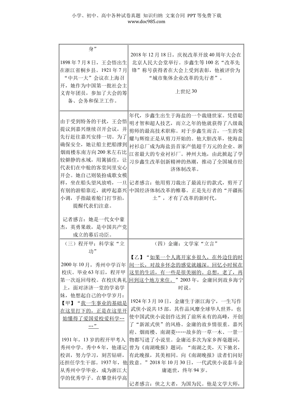 小学、初中、高中各种试卷真题知识归纳文案合同PPT等免费下载www.doc985.com2019年浙江省舟山市中考语文试卷题号一二三四五六总分得分一、语言表达(本大题共1小题,共10.0分)1.研学活动即将结束,小嘉、小舟觉得收获很大,打算围绕“访古探幽”或“重走‘一大路”主题,为学弟学妹做一个“南湖半日游”行程规划。请你借助右边的示意图,并结合答题过程中获得的信息,完成这个行程规划。要求:(1)设计一条路线,起点“会景园”。(2)安排三个符合景点特征的活动。(3)使用合理的表达方式。(4)不超过150字。二、其他(本大题共3小题,共15.0分)2.小舟阅读了研学方案,查阅了相关资料,对嘉兴南湖有了初步印象,写下了这样一段文字:南湖四季如画。春天,(nèn)____;夏日,荷花摇曳;秋季,菱香四yì____;寒冬,银装素裹。古往今来,文人雅士相聚南湖,或鸳鸯湖泛舟对弈,或烟雨楼吟诗作画,为南湖留下了许多脍炙人口的诗篇和美妙绝轮的画卷。正是他们浓浓的南湖(qíngjié)____,赋予了南湖深厚的人文底蕴。(1)书写时,有几个字词小舟用拼音代替,请你帮他补写。(2)小舟不小心写了一个错别字,请你找出来并帮他订正。3.漫步湖心岛,小嘉看到鉴亭旁边碑石上刻有“嘉禾八景诗”,摘录了其中三首,带领同学们开展“碑石探美,古诗寻意”活动。小学、初中、高中各种试卷真题知识归纳文案合同PPT等免费下载www.doc985.com(1)下面是小嘉与小舟的赏读对话,请你一起参与。小嘉:吟诵《汉塘春桑》,让我想到了赵师秀《约客》中的诗句“黄梅时节家家雨,____”。小舟:《杉闸风帆》中“一路东风吹酒醒”有豪放派词人____《定风波》中“____”的影子。小嘉:诗人常以“风雨”入诗,或营造萧条苍凉之境,如许浑的“____,____”;或勾起家国命运之思,如“____,____”。小舟:没错,而《南湖烟雨》却描绘了南湖烟波荡漾、清风送歌的美景,“棹歌”“水禽”“暮霭”,“____,____。实是欲界之仙都”。(2)小禾整理出了四组诗句,你觉得情感最相近的一项是____A.处处清溪处处桑,绿云低护古时塘。﹣﹣最爱湖东行不足,绿杨阴里白沙堤。B.苏州估客布帆轻,买醉枫桥趁晓晴。﹣﹣浊酒一杯家万里,燕然未勒归无计。C.云横秦岭家何在?雪拥蓝关马不前。﹣﹣山回路转不见君,雪上空留马行处。D.长风破浪会有时,直挂云帆济沧海。﹣﹣沉舟侧畔千帆过,病树前头万木春。4.小舟打开百度搜索,看到了《南湖晚报》的一个网页。他们值得被铭记他们是我们的父老前辈,是前贤;是无悔的殉道者,无我的奉献者;是不曾远去的坚毅背影,是无言的精神柱石。他们闪亮的名字永远值得被人铭记,他们的英勇事迹和伟大精神不断地激励我们前行。(一)王会悟:革命家“立(二)步鑫生:小学、初中、高中各种试卷真题知识归纳文案合同PPT等免费下载www.doc985.com身”1898年7月8日,王会悟出生在浙江省桐乡县。1921年7月“中共一大”会议在上海召开,她作为中国第一批社会主义青年团员,参加了大会的筹备、会务和保卫工作。2018年12月18日,庆祝改革开放40周年大会在北京人民大会堂举行。步鑫生等100名“改革先锋”称号获得者在大会上受到表彰,他被评价为“城市集体企业改革的先行者”。上世纪30由于受到特务的干扰,王会悟提议到嘉兴继续召开会议,并先行赶往嘉兴安排一切。为了确保安全,她让船主把船撑到烟雨楼东南方向200米左右比较僻静的水域,用篱插住,让代表们在中舱的客堂间里安心开会。她自己则装扮成歌女模样,坐在船头望风放哨,一旦有别的游船靠近,就哼起嘉兴小调,手指敲着舱门打节拍,提醒代表们注意。记者感言:她是一代女中豪杰,英勇果敢,是中国共产党成立的幕后功臣。年代,步鑫生出生于海盐的一个裁缝世家。凭借聪明才智和超人技艺,而立之年的他就获得了八级裁剪师的最高技术职称。对于步鑫生而言,一生的荣耀与辉煌正是从剪刀开始的。他大胆改革,使海盐衬衫总厂成为海盐县首家产值超千万元的企业、浙江省最大的专业衬衫厂。神州大地,由此掀起了学习步鑫生改革创新精神的热潮,推动了全国城市经济体制改革。记者感言:他用剪刀裁出了最流行的款式,剪开了中国经济体...