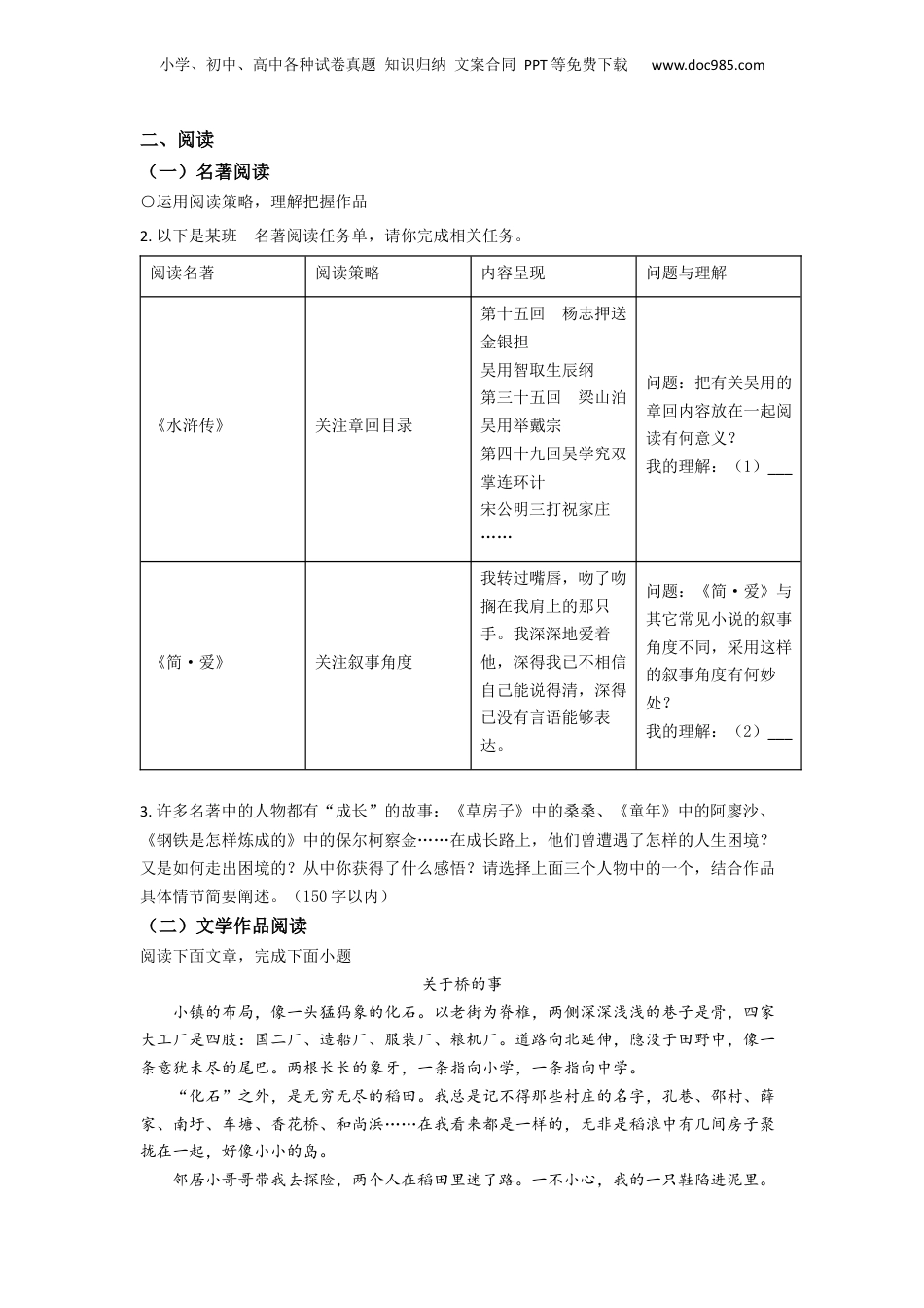小学、初中、高中各种试卷真题知识归纳文案合同PPT等免费下载www.doc985.com浙江省舟山市2018年初中学业水平考试一、积累1.①酒是激发创作灵感的源泉,酒是(cuī)生诗文书法的(jiào)母。自古以来,中国文人就与酒结下了不解之(yuán),留下了许多(guīlì)诗篇与书法珍品。②酒中有少年意气,王维诗句“(1),系马高楼垂柳边”,描写了少年游侠慷慨激昂,畅饮豪谈的情态;酒中有中年旷达,欧阳修谪居滁州,饮少辄醉,“(2),在乎山水之间也”,表现了他寄情山水,忘怀宠辱的洒脱。③酒中有生活美景,孟浩然与老友闲话农事,“(3),”,充满轻松惬意;酒中有浪漫想象,李白呼月伴影,“(4),”,排遣内心寂寞;酒中有报国雄心,辛弃疾拔剑细看,“(5),”,渴望重回沙场。④酒中还有书法佳话。晋代王羲之兰亭聚会,乘酒兴作《兰亭集序》,笔法道劲稳健,被称为“天下第一行书”;唐代张旭豪饮之后,挥毫落纸,字如龙蛇飞走,人称“草圣”。(1)根据拼音写出第①段中相应的汉字或词语。(cuī)____生(jiào)_____母不解之(yuán)_____(guīlì)_____(2)根据提示,默写②—③段中的名句。_________________________(3).根据第④段内容,下面书法作品中属王羲之行书的是(),属张旭草书的是()A.B.C.D.(4)完成下列表格。名句衔觞赋诗,以乐其志明月几时有,把酒问青天一壶浊酒喜相逢,古今多少事,都付笑谈中作品(1)____《水调歌头》《三国演义》作家陶渊明苏轼(3)___朝代东晋(2)___元末明初小学、初中、高中各种试卷真题知识归纳文案合同PPT等免费下载www.doc985.com二、阅读(一)名著阅读○运用阅读策略,理解把握作品2.以下是某班的名著阅读任务单,请你完成相关任务。阅读名著阅读策略内容呈现问题与理解《水浒传》关注章回目录第十五回杨志押送金银担吴用智取生辰纲第三十五回梁山泊吴用举戴宗第四十九回吴学究双掌连环计宋公明三打祝家庄……问题:把有关吴用的章回内容放在一起阅读有何意义?我的理解:(1)___《简·爱》关注叙事角度我转过嘴唇,吻了吻搁在我肩上的那只手。我深深地爱着他,深得我已不相信自己能说得清,深得已没有言语能够表达。问题:《简·爱》与其它常见小说的叙事角度不同,采用这样的叙事角度有何妙处?我的理解:(2)___3.许多名著中的人物都有“成长”的故事:《草房子》中的桑桑、《童年》中的阿廖沙、《钢铁是怎样炼成的》中的保尔柯察金……在成长路上,他们曾遭遇了怎样的人生困境?又是如何走出困境的?从中你获得了什么感悟?请选择上面三个人物中的一个,结合作品具体情节简要阐述。(150字以内)(二)文学作品阅读阅读下面文章,完成下面小题关于桥的事小镇的布局,像一头猛犸象的化石。以老街为脊椎,两侧深深浅浅的巷子是骨,四家大工厂是四肢:国二厂、造船厂、服装厂、粮机厂。道路向北延伸,隐没于田野中,像一条意犹未尽的尾巴。两根长长的象牙,一条指向小学,一条指向中学。“化石”之外,是无穷无尽的稻田。我总是记不得那些村庄的名字,孔巷、邵村、薛家、南圩、车塘、香花桥、和尚浜……在我看来都是一样的,无非是稻浪中有几间房子聚拢在一起,好像小小的岛。邻居小哥哥带我去探险,两个人在稻田里迷了路。一不小心,我的一只鞋陷进泥里。小学、初中、高中各种试卷真题知识归纳文案合同PPT等免费下载www.doc985.com小哥哥无奈,只好背着我走。太阳西沉,四野苍茫,我的肚子饿了,但并不害怕,风里有粮食的味道,稻田的气息让人安心。远处几缕炊烟升起,田埂上出现了几个小黑点大声呼喊我的名字,是着急的爸妈一路寻来。那年我六岁。如今我站在车流滚滚的路边,企图辨认当年探险的路线,哪里崴了脚,哪里掉了鞋,哪里踩到一条死蛇,哪里捉到一只硕大的蚂蚱。记忆没了参照物,像掌中的麻雀找不到着力点,扑腾着翅膀,飞不起来。只有那条小河还在。小河名叫夏驾河,河上有一座通济桥,建于康熙三十一年(1692年),桥洞是完美的半圆形。我出生那天,奶奶从桥顶扔下一个皮球。这是小镇的习俗,球有多大,男孩的胆子就有多大。儿时的我顽劣不羁,四处撒野闯祸——不知奶奶有没有后悔过,早知如此...