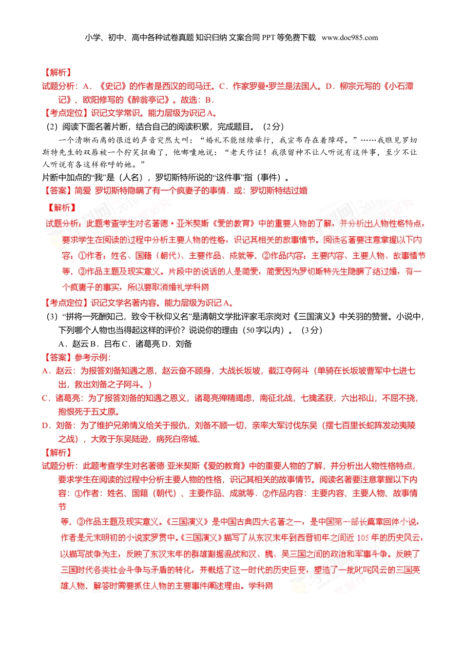 小学、初中、高中各种试卷真题知识归纳文案合同PPT等免费下载www.doc985.com一、语文知识积累(21分)1.根据拼音写出相应的汉字。(4分)互联网及社交媒体(jué)起的时代是新闻最多的时代,我们被(guǒ)挟在信息洪流中,看似享受着信息带给我们的便(jié),有时却未必看见真相。我们只有尽可能提高自身的媒介素养,保持独立思考的能力,才不会被舆论所迷(huò)。【答案】崛裹捷惑【解析】试题分析:此类型的题目考查学生的理解识记能力,考查等级为A。需要学生在平时多读课文,养成熟练地语感,注意读音,多积累词语,多读课下注释,多查字典等工具书。“”“”“崛起不要写作掘起,裹”“”“”“”“”“”挟不要写作裹胁,便捷不要写作便接,迷惑不要写作迷或【考点定位】识记并正确书写现代常用规范汉字。能力层级为识记A。2.古诗文名句默写。(8分)(1)博学而笃志,。(《<论语>十二章》)(2),天山共色。(吴均《与朱元思书》)(3),人约黄昏后。(欧阳修《生查子·元夕》)(4)拣尽寒枝不肯栖,,。(苏轼《卜算子·黄州定慧院寓居作》)(5)沧海横流方显英雄本色。民族危难之际,辛弃疾“,”抒发了建功立业的雄心壮志;被俘临刑之时,文天祥“,”展现出舍生取义的民族气节。【答案】(1)切问而近思(2)风烟俱静(3)月上柳梢头(4)寂寞沙洲冷(5)了却君王天下事,赢得生前身后名人生自古谁无死,留取丹心照汗青【解析】写错别字。【考点定位】识记文学常识。能力层级为识记A。3.文学常识与名著阅读(7分)(1)下列有关文学常识的标书,正确的一项是(2分)A.《史记》是我国第一部纪传体通史,作者是西汉史学家司马光。B.俄国作家契诃夫的小说《套中人》刻画了别里科夫这一沙皇专制制度的忠实卫道士的典型形象。C.英国作家罗曼·罗兰的《名人传》,包括《贝多芬传》《米开朗琪罗传》《列夫·托尔斯泰传》。D“”.唐宋八大家的作品至今为人称颂,如柳宗元的《醉翁亭记》、欧阳修的《小石潭记》、王安石的《伤仲永》等。【答案】B小学、初中、高中各种试卷真题知识归纳文案合同PPT等免费下载www.doc985.com【解析】试题分析:A.《史记》的作者是西汉的司马迁。C•.作家罗曼罗兰是法国人。D.柳宗元写的《小石潭记》、欧阳修写的《醉翁亭记》。故选:B.【考点定位】识记文学常识。能力层级为识记A。(2)阅读下面名著片断,结合自己的阅读积累,完成题目。(2分)一个清晰而离的很近的声音突然大叫:“婚礼不能继续举行,我宣布存在着障碍。”……我瞧见罗切斯特先生的双唇被一个狞笑扭曲了,他嘟囔地说:“老天作证!我很留神不让人听说有这件事,至少不让人听说有各这样称呼的她。”“”“”片断中加点的我是(人名),罗切斯特所说的这件事指(事件)。【答案】简爱罗切斯特隐瞒了有一个疯妻子的事情.或:罗切斯特结过婚【考点定位】识记文学名著内容。能力层级为识记A。(3“”)拼将一死酬知己,致令千秋仰义名是清朝文学批评家毛宗岗对《三国演义》中关羽的赞誉。小说中,下列哪个人物也当得起这样的评价?说说你的理由(50字以内)。(3分)A.赵云B.吕布C.诸葛亮D.刘备【答案】参考示例:A.赵云:为报答刘备知遇之恩,赵云奋不顾身,大战长坂坡,截江夺阿斗(单骑在长坂坡曹军中七进七出,救出刘备之子阿斗。)C.诸葛亮:为了报答刘备的知遇之恩义,诸葛亮殚精竭虑,南征北战,七擒孟获,六出祁山,不屈不挠,抱恨死于五丈原。D.刘备:为了维护兄弟情义给关于报仇,刘备不顾一切,亲率大军讨伐东吴(摆七百里长蛇阵发动夷陵之战),大败于东吴陆逊,病死白帝城、【解析】试题分析:此题考查学生对名著德·亚米契斯《爱的教育》中的重要人物的了解,并分析出人物性格特点,要求学生在阅读的过程中分析主要人物的性格,识记其相关的故事情节。阅读名著要注意掌握以下内容:①作者:姓名、国籍(朝代)、主要作品、成就等.②作品内容:主要内容、主要人物、故事情节小学、初中、高中各种试卷真题知识归纳文案合同PPT等免费下载www.doc985.com【考点定位】识记文学名著内容。能力层级为识记A。4.下列加点的文言词语意思相同的一...