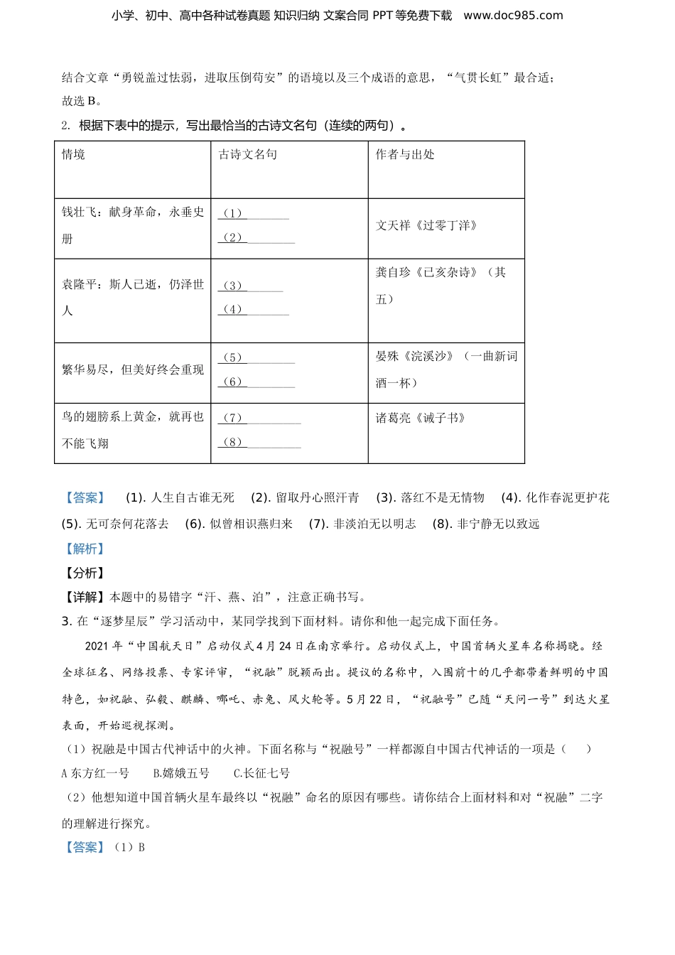 小学、初中、高中各种试卷真题知识归纳文案合同PPT等免费下载www.doc985.com浙江省2021年初中学业水平考试(湖州市)语文试题卷请考生注意:1.全卷分试题卷和答题卷。试题卷6页,共18题。全卷满分120分(含全卷书写4分)。考试时间120分钟。2.请用黑色墨水签字笔把答案写在答题卷相应位置上,做在试题卷上无效。作文不能另加附纸。温馨提示请仔细审题,细心答题。相信你一定会有出色表现!一、积累(16分)1.读下面文字,完成题目。青春不是年华,而是心境;青春不是桃面、丹唇、柔膝,而是深沉的意志、恢宏的想象、炽热的感情;青春是生命的深泉在yǒng①动。青春,勇锐盖过怯弱,进取压倒苟安。如此锐气,二十后生有之,六旬男子有之。年岁有加,并非垂老;理想丢弃,方堕mù②年。人心中皆有一台天线,只要你从天上人间接受美好、希望、欢乐、勇气和力量的信号,你就青春永zhù__③__、风华长存。(选自《瞭望》周刊副刊《珍珠滩》,略有改动)(1)根据拼音写出汉字。(2)根据语境,为空白处选择成语,最恰当的一项是()A.气势汹汹B.气贯长虹C.气急败坏【答案】(1)①涌②暮③驻(2)B【解析】【分析】【详解】(1)本题考查根据拼音写汉字。本题中的易错字“涌、暮、驻”,注意正确书写。涌动:比喻人或事物像水一样冒出流动。暮年:意思是晚年;老年。青春永驻:永远年轻的意思。(2)本题考查成语的运用。气势汹汹:形容气势凶猛。汹汹:气势盛大的样子。气贯长虹:形容精神极其崇高,气概极其豪壮。贯:贯穿。正义的精神直上高空,穿过彩虹。气急败坏:形容因愤怒或激动而慌张地说话、回答或喊叫。小学、初中、高中各种试卷真题知识归纳文案合同PPT等免费下载www.doc985.com结合文章“勇锐盖过怯弱,进取压倒苟安”的语境以及三个成语的意思,“气贯长虹”最合适;故选B。2.根据下表中的提示,写出最恰当的古诗文名句(连续的两句)。情境古诗文名句作者与出处钱壮飞:献身革命,永垂史册(1)_______(2)________文天祥《过零丁洋》袁隆平:斯人已逝,仍泽世人(3)______(4)_______龚自珍《已亥杂诗》(其五)繁华易尽,但美好终会重现(5)________(6)________晏殊《浣溪沙》(一曲新词酒一杯)鸟的翅膀系上黄金,就再也不能飞翔(7)_________(8)_________诸葛亮《诫子书》【答案】(1).人生自古谁无死(2).留取丹心照汗青(3).落红不是无情物(4).化作春泥更护花(5).无可奈何花落去(6).似曾相识燕归来(7).非淡泊无以明志(8).非宁静无以致远【解析】【分析】【详解】本题中的易错字“汗、燕、泊”,注意正确书写。3.在“逐梦星辰”学习活动中,某同学找到下面材料。请你和他一起完成下面任务。2021年“中国航天日”启动仪式4月24日在南京举行。启动仪式上,中国首辆火星车名称揭晓。经全球征名、网络投票、专家评审,“祝融”脱颖而出。提议的名称中,入围前十的几乎都带着鲜明的中国特色,如祝融、弘毅、麒麟、哪吒、赤兔、风火轮等。5月22日,“祝融号”已随“天问一号”到达火星表面,开始巡视探测。(1)祝融是中国古代神话中的火神。下面名称与“祝融号”一样都源自中国古代神话的一项是()A.东方红一号B.嫦娥五号C.长征七号(2)他想知道中国首辆火星车最终以“祝融”命名的原因有哪些。请你结合上面材料和对“祝融”二字的理解进行探究。【答案】(1)B小学、初中、高中各种试卷真题知识归纳文案合同PPT等免费下载www.doc985.com(2)第一,“祝融”来源于中国古代神话,带有鲜明的中国特色。第二,祝融是中国古代神话中的火神,这一命名寓意它给人类带来光明,促进人类文明发展;寓意点燃中国星际探测的火种,指引中国航天人持续探索宇宙,不断超越自我。第三,“祝”,祝愿,祝福,表达了对人类踏进星辰大海的美好祝愿,激励航天人追逐梦想,勇于探索;“融”,融合,协作,表明中国将以开放包容的姿态推进国际合作。【解析】【分析】【详解】1.本题考查学生识记文化常识的能力。A.“东方红一号”卫星由结构、温控、能源、《东方红》音乐装置和短波遥测、跟踪、天线等分系统及姿态测量部件等组成。可见,其名称与陕北民歌《东方红》有关;B.“嫦娥五号...