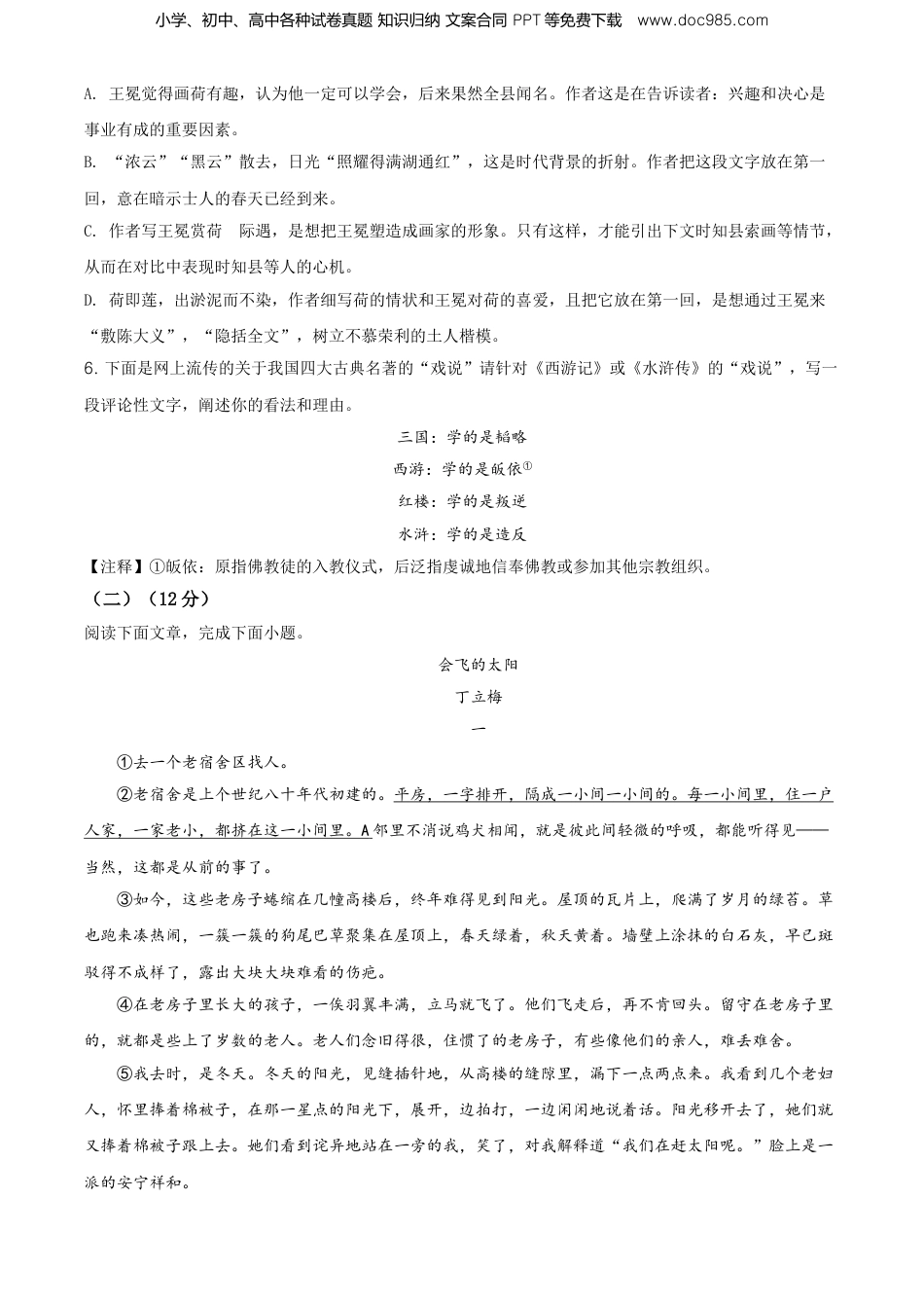 小学、初中、高中各种试卷真题知识归纳文案合同PPT等免费下载www.doc985.com浙江省2020年初中学业水平考试(湖州市)语文试题卷请考生注意:1.全卷分试题卷和答题卷。试题卷6页,共19题。全卷满分120分(含全卷书写4分)。考试时间120分钟。2.请用黑色墨水签字笔把答案写在答题卷相应位置上,做在试题卷上无效。作文不能另加附纸。温馨提示:请仔细审题,细心答题。相信你一定会有出色表现!1.读下面文字,完成题目。生命的酒杯,不可能总是chéng_____满可口的甘醴,苦酒也是成长的滋味。,显示不出水手的坚强;百转千回,才能百liàn______成钢。恰恰是在跌倒的时候,奋斗才能凸显其意义。“不能因现实复杂而放弃梦想,不能因理想遙远而放弃追求”,因为“历史只会春顾坚定者、奋进者、搏击者,而不会等待犹豫者、懈息者、畏难者”。用力活着,才有分量;向前奔跑,才能dǐ_____达。愿你青春灿烂,愿你前途光明。(选自《人民日报》)(1)根据拼音写出汉字。(2)根据语境,为空白处选择成语,最恰当的一项是()A.一意孤行B.一马平川C.一帆风顺2.古诗文中含情思。根据下表中的提示,写出最恰当的古诗文名句(连续的两句)。情思古诗文名句作者与出处纵使前路迷茫,我也相信未来。(1)________(2)________李白《行路难(其一)》远隔万水千山,我心伴你左右。(3)________(4)________王勃《送杜少府之任蜀州》此生宁愿孤独,我也绝不屈就。(5)________(6)________苏轼《卜算子·黄州定慧院寓居作》别说我在乎你,我心另有所系(7)________(8)_________欧阳修《醉翁亭记》3.疫情期间,一位同学线上学习《送东阳马生序》。请你和他一起完成下面的学习任务。小学、初中、高中各种试卷真题知识归纳文案合同PPT等免费下载www.doc985.com(1)学习时,他发现了文中“加冠”“耄老”等专门用来指代年龄或年龄段的词语,于是联想到下面的词语。请问,下面哪一项是不能归入这一类的?()A.始龀(《愚公移山》“始龀,跳往助之”)B.垂髫(《桃花源记》“黄发垂髫,并怡然自乐”)C.多髯(《核舟记》“中峨冠而多髯者为东坡”)(2)感佩之余,他觉得下面这副对联能概括宋濂其人,但他区分不出上下联。你认为上联和下联分别是哪一句?(填字母)A.厚实养德世称贤B.勤艰求学书为上提示1对联要求平仄相谐……一般不要求字字相反,但上、下联尾字(联脚)平仄应相反,并且上联为仄,下联为平。(摘自《语文作业本》)提示2:从上下联关系看,对联可分为正对反对和串对……串对,下联的内容往往是紧承上联而发的。(摘自《名联鉴赏辞典》)二、阅读(50分)(一)名著阅读(8分)4.名著推广活动中,一位同学为下面四部名著设计了演讲主题,不恰当的一项是()A.《昆虫记》:拥有和自己斗争的勇气,才能登上艺术的顶峰。B.《简·爱》:你总要熬过一些苦难,方能尘埃落定,静待花开。C.《红星照耀中国》:你的热爱有多浓烈,你的祖国就有多美丽。D.《海底两万里》:即使是普通的冒险,也伴随着对科学的关注。5.结合《儒林外史》整本书来看,下面哪项最可能是吴敬梓写这段文字的用意?()王冕放羊倦了,在绿草地上坐着。须臾,浓云密布,一阵大雨过了。那黑云边上镶着白云,渐渐散去,透出一派日光来,照耀得满湖通红。湖边山上,青一块,绿一块,紫一块,树枝上都像水洗过一番的,尤其绿得可爱。湖里有十来枝荷花,苞子上清水滴滴,蕉叶上水珠滚来滚去,王冕看了一回,心里想道:“古人说:人在图画中’其实不错可我这里没有个画工,把这荷花画他几枝,也觉有趣!”又心里想道:“天下那有个学不会的事,我何不自画他几枝?”(选自《儒林外史》第一回《说楔子敷陈大义借名流隐括全文》小学、初中、高中各种试卷真题知识归纳文案合同PPT等免费下载www.doc985.comA.王冕觉得画荷有趣,认为他一定可以学会,后来果然全县闻名。作者这是在告诉读者:兴趣和决心是事业有成的重要因素。B.“浓云”“黑云”散去,日光“照耀得满湖通红”,这是时代背景的折射。作者把这段文字放在第一回,意在暗示士人的春天已经到来。C.作者写王冕赏荷的际遇,是想把王冕塑造成画家的形象。只有这样,...