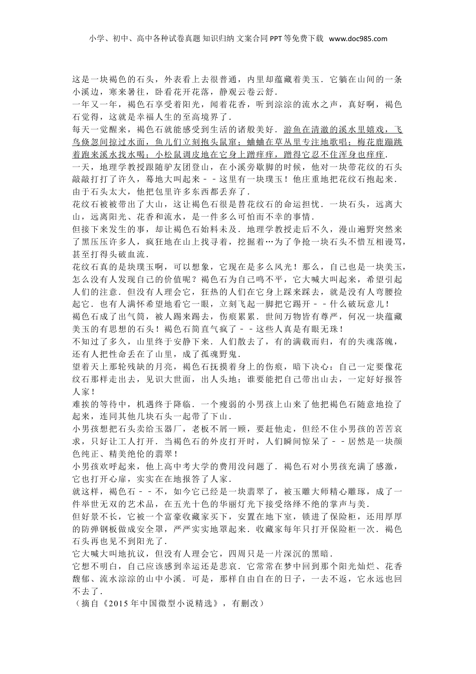 小学、初中、高中各种试卷真题知识归纳文案合同PPT等免费下载www.doc985.com浙江省湖州市2016年中考语文试卷一、语文只是积累(18分)1.(3分)(2016•湖州)读下面这段文字,根据拼音写出汉字.竹,其叶四季常青,清丽俊逸;其干虚中有节,挺拔凌云;其形千zī百态,情趣盎然.漫步于青青竹林之中,便觉神清气爽,心kuàng神怡.竹,既美化了人的生活,又陶yě了人的情操,在我国源远流长的文化史上具有重要的影响.2.(8分)(2016•湖州)古诗文名句默写.(1)种豆南山下,.(陶渊明《归园田居》)(2)正是江南好风景,.(杜甫《江南逢李龟年》)(3)?雪拥蓝关马不前.(韩愈《左迁至蓝关示侄孙湘》)(4),斜晖脉脉水悠悠.(温庭筠《望江南》)(5)晏殊《浣溪沙》中“,”两句,无奈与欣慰交织,蕴含着某种生活哲理.(6)杨绛先生曾说:“人生最曼妙的风景,竟是内心的淡定与从容.”这种面对“淡定与从容”,需要有“,”的豁达胸襟.(填写范仲淹《岳阳楼记》中的名句)3.(3分)(2016•湖州)解释下列句中加点的词语.(1)天柱折,地维.(2)菊之爱,陶后有闻.(3)会天大雨,道不通,已失期.4.(4分)(2016•湖州)名著阅读.(1)下列有关文学常识的表述,正确的一项是A.《哈姆雷特》《吉檀迦利》《繁星》《诗经》都是诗歌作品.B.《语》《大学》《孟子》《左传》都是儒家经典,并称“四书”.C.《马说》《伤仲永》《记承天寺夜游》《醉翁亭记》都是“唐宋八大家”的作品.D.《名人传》《格列佛游记》《简•爱》《培根随笔》都是英国作家的作品.(2)书名是一部作品的眼睛.从下列两部作品中任选一部,结合作品具体内容简要评析书名的特点.《朝花夕拾》《钢铁是怎样炼成的》二、现代文阅读(25分)5.(14分)(2016•湖州)阅读下面这篇小说,完成下列各题.一块有思想的石头王伟锋小学、初中、高中各种试卷真题知识归纳文案合同PPT等免费下载www.doc985.com这是一块褐色的石头,外表看上去很普通,内里却蕴藏着美玉.它躺在山间的一条小溪边,寒来暑往,卧看花开花落,静观云卷云舒.一年又一年,褐色石享受着阳光,闻着花香,听到淙淙的流水之声,真好啊,褐色石觉得,这就是幸福人生的至高境界了.每天一觉醒来,褐色石就能感受到生活的诸般美好.游鱼在清澈的溪水里嬉戏,飞鸟倏忽间掠过水面,鱼儿们立刻抱头鼠窜;蛐蛐在草丛里专注地歌唱;梅花鹿蹦跳着跑来溪水找水喝;小松鼠调皮地在它身上蹭痒痒,蹭得它忍不住浑身也痒痒.一天,地理学教授跟随驴友团登山,在小溪旁歇脚的时候,他对一块带花纹的石头敲敲打打了许久,蓦地大叫起来﹣﹣这里有一块璞玉!他庄重地把花纹石抱起来.由于石头太大,他把包里许多东西都丢弃了.花纹石被被带出了大山,这让褐色石很是替花纹石的命运担忧.一块石头,远离大山,远离阳光、花香和流水,是一件多么可怕而不幸的事情.但接下来发生的事,却让褐色石始料未及.地理学教授走后不久,漫山遍野突然来了黑压压许多人,疯狂地在山上找寻着,挖掘着…为了争抢一块石头不惜互相谩骂,甚至打得头破血流.花纹石真的是块璞玉啊,可以想象,它现在是多么风光!那么,自己也是一块美玉,怎么没有人发现自己的价值呢?褐色石为自己鸣不平,它大喊大叫起来,希望引起人们的注意.但没有人理会它,狂热的人们在它身上踩来踩去,就是没有人弯腰捡起它.也有人满怀希望地看它一眼,立刻飞起一脚把它踢开﹣﹣什么破玩意儿!褐色石成了出气筒,被人踢来踢去,伤痕累累.世间万物皆有尊严,何况一块蕴藏美玉的有思想的石头!褐色石简直气疯了﹣﹣这些人真是有眼无珠!不知过了多久,山里终于安静下来.人们散去了,有的满载而归,有的失魂落魄,还有人把性命丢在了山里,成了孤魂野鬼.望着天上那轮残缺的月亮,褐色石抚摸着身上的伤痕,暗下决心:自己一定要像花纹石那样走出去,见识大世面,出人头地;谁要能把自己带出山去,一定好好报答人家!难挨的等待中,机遇终于降临.一个瘦弱的小男孩上山来了他把褐色石随意地捡了起来,连同其他几块石头一起带了下山.小男孩想把石头卖给玉器厂,老板不屑一顾,要赶他走,...