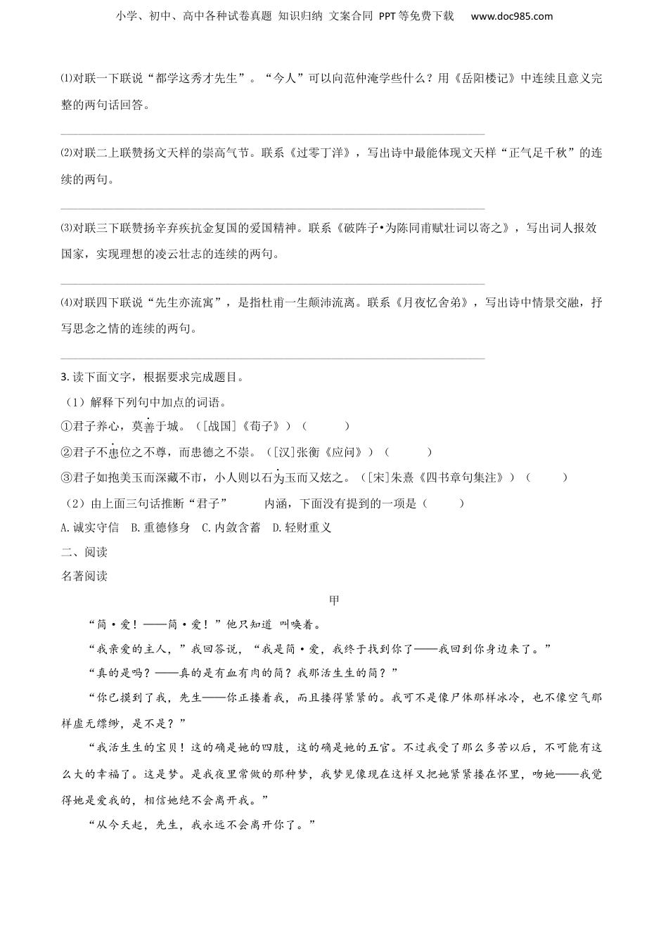 小学、初中、高中各种试卷真题知识归纳文案合同PPT等免费下载www.doc985.com浙江省2018年初中学业水平考试(湖州市)语文试题卷一、积累1.读下面文字,根据拼音写出汉字。这里mào_____密的青草在向你频频点头,当苹果滚落在草地上时,你会将你的目光跟zōng______它,你会用你的脸庞亲昵它。花园,我美丽的花园!你走遍夭yá_______也找不到这样的花园,也找不到这样清澈、活泼的流水.也找不到这样的春天和夏天。——[波兰]切斯拉夫•米沃什《牧歌》,张振辉译2.读下面对联•根据要求填写合适的古诗文名句对联一:兵甲富胸中,纵教他虏骑横飞,也怕那范小老子忧乐关天下,愿今人砥砺奋起,都学这秀才先生(冯玉祥题山东青州范公亭)对联二:正气足千秋,只今砥柱中流,得力在惶恐滩头、零丁洋里忠臣惟一死,壮此崇祠孤屿,触景到罗浮山下、扬子江心(清·黄惟诰题温州文天祥祠)对联三:铁板铜琶,继东坡高唱大江东去美芹悲黍,冀南宋莫随鸿雁南飞(郭沫若题山东济南稼轩祠)对联四:异代不同时,问如此江山,龙幡虎卧几诗客先生亦流寓,有长流天地,月白风请一草堂(清·顾复初题四川成都杜甫草堂)小学、初中、高中各种试卷真题知识归纳文案合同PPT等免费下载www.doc985.com⑴对联一下联说“都学这秀才先生”。“今人”可以向范仲淹学些什么?用《岳阳楼记》中连续且意义完整的两句话回答。________________________________________________________________________⑵对联二上联赞扬文天样的崇高气节。联系《过零丁洋》,写出诗中最能体现文天样“正气足千秋”的连续的两句。________________________________________________________________________⑶对联三下联赞扬辛弃疾抗金复国的爱国精神。联系《破阵子•为陈同甫赋壮词以寄之》,写出词人报效国家,实现理想的凌云壮志的连续的两句。________________________________________________________________________⑷对联四下联说“先生亦流寓”,是指杜甫一生颠沛流离。联系《月夜忆舍弟》,写出诗中情景交融,抒写思念之情的连续的两句。________________________________________________________________________3.读下面文字,根据要求完成题目。(1)解释下列句中加点的词语。①君子养心,莫善于城。([战国]《荀子》)()②君子不患位之不尊,而患德之不崇。([汉]张衡《应问》)()③君子如抱美玉而深藏不市,小人则以石为玉而又炫之。([宋]朱熹《四书章句集注》)()(2)由上面三句话推断“君子”的内涵,下面没有提到的一项是()A.诚实守信B.重德修身C.内敛含蓄D.轻财重义二、阅读名著阅读甲“简·爱!——简·爱!”他只知道叫唤着。“我亲爱的主人,”我回答说,“我是简·爱,我终于找到你了——我回到你身边来了。”“真的是吗?——真的是有血有肉的简?我那活生生的简?”“你已摸到了我,先生——你正搂着我,而且搂得紧紧的。我可不是像尸体那样冰冷,也不像空气那样虚无缥缈,是不是?”“我活生生的宝贝!这的确是她的四肢,这的确是她的五官。不过我受了那么多苦以后,不可能有这么大的幸福了。这是梦。是我夜里常做的那种梦,我梦见像现在这样又把她紧紧搂在怀里,吻她——我觉得她是爱我的,相信她绝不会离开我。”“从今天起,先生,我永远不会离开你了。”小学、初中、高中各种试卷真题知识归纳文案合同PPT等免费下载www.doc985.com(选自《简·爱》,商务印书馆,宋兆霖译)乙“简·爱!——简·爱!”罗切斯特激动得只能说出这几个字。“罗切斯特,我是简·爱,我回来了!”“我不是又在做梦吧?我做过很多这样的梦,梦见我的简回到我的身边。可是醒来后,她就像空气一样消失了,她不会再消失了吧?”“不会了,先生,我要永远留在你身边,从今天起。”(选自《简·爱》,吉林文史出版社,李勋译写)4.简·爱离开罗切斯特到两人重逢这段时间内,她经历了很多事。下面时间不发生在这一期间的一项是()5.甲文选自全译本,乙文选自缩写本。请对比分析两端文字,并结合你对《简·爱》整本书的理解,阐述全译本好在哪里。200字左右。文学作品阅读到石码去舒婷①世上大约没有人能记起他出生的...
