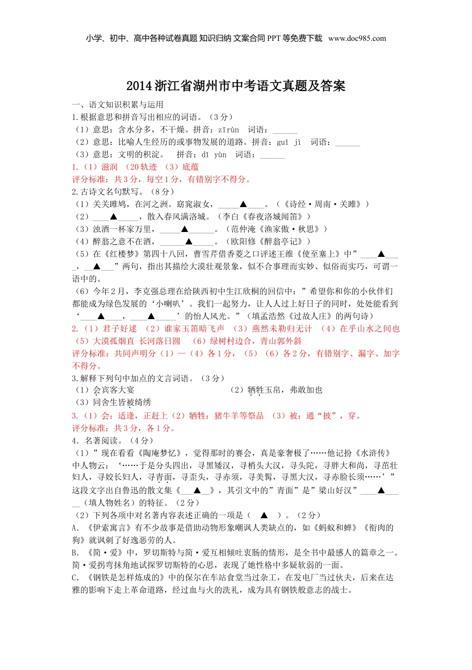小学、初中、高中各种试卷真题知识归纳文案合同PPT等免费下载www.doc985.com2014浙江省湖州市中考语文真题及答案一、语文知识积累与运用1.根据意思和拼音写出相应的词语。(3分)(1)意思:含水分多,不干燥。拼音:zīrùn词语:______(2)意思:比喻人生经历的或事物发展的道路。拼音:guǐjì词语:______(3)意思:文明的积淀。拼音:dǐyùn词语:______1.(1)滋润(20轨迹(3)底蕴评分标准:共3分,每空1分,有错别字不得分。2.古诗文名句默写。(8分)(1)关关雎鸠,在河之洲。窈窕淑女,_____▲____。(《诗经·周南·关雎》)(2)____▲_____,散入春风满洛城。(李白《春夜洛城闻笛》)(3)浊酒一杯家万里,_____▲______。(范仲淹《渔家傲·秋思》)(4)醉翁之意不在酒,______▲_____。(欧阳修《醉翁亭记》)(5)在《红楼梦》第四十八回,曹雪芹借香菱之口评述王维《使至塞上》中”____▲____,__▲___”两句,指出其描绘大漠壮观景象,似不合事理而实妙、似俗而实巧,可谓一语中的。(6)今年2月,李克强总理在给陕西初中生江欣桐的回信中:”希望你和你的小伙伴们都能成为绿色发展的‘小喇叭’。我们一起努力,让人人过上好日子的同时,处处能看到‘____▲____,____▲_____’的怡人风光。”(填孟浩然《过故人庄》的两句诗)2.(1)君子好逑(2)谁家玉笛暗飞声(3)燕然未勒归无计(4)在乎山水之间也(5)大漠孤烟直长河落日圆(6)绿树村边合,青山郭外斜评分标准:共同声明分(1)—(4)各1分,(5)(6)各2分,有错别字、漏字、加字不得分。3.解释下列句中加点的文言词语。(3分)(1)会宾客大宴(2)牺牲玉帛,弗敢加也(3)同舍生皆被绮绣3.(1)会:适逢,正赶上(2)牺牲:猪牛羊等祭品(3)被:通“披”,穿。评分标准:共3分,各1分。4.名著阅读。(4分)(1)”现在看看《陶庵梦忆》,觉得那时的赛会,真是豪奢极了……他记扮《水浒传》中人物云:‘……于是分头四出,寻黑矮汉,寻梢头大汉,寻头陀,寻胖大和尚,寻茁壮妇人,寻姣长妇人,寻青面,寻歪头,寻赤须,寻美髯,寻黑大汉,寻赤脸长须……’”这段文字出自鲁迅的散文集《___▲__》,其引文中的”青面”是”梁山好汉”____▲_____(填人物姓名)的特征。(2分)(2)下列各项中对名著内容表述正确的一项是(▲)。(2分)A.《伊索寓言》有不少故事是借助动物形象嘲讽人类缺点的,如《蚂蚁和蝉》《衔肉的狗》就讽刺了好逸恶劳的人。B.《简·爱》中,罗切斯特与简·爱互相倾吐衷肠的情形,是全书中最感人的篇章之一。简·爱拐弯抹角地试探罗切斯特的心思,表现了她性格中多疑软弱的一面。C.《钢铁是怎样炼成的》中的保尔在车站食堂当过杂工,在发电厂当过伙夫,后来在达雅的影响下走上革命道路,经过血与火的洗礼,成为具有钢铁般意志的战士。小学、初中、高中各种试卷真题知识归纳文案合同PPT等免费下载www.doc985.comD.《海底两万里》中,法国生物学家阿龙纳斯通过一系列奇怪的事情,了解到神秘的尼摩船长用海底沉船里的财务来支援陆地上人们的正义斗争。4.(1)①《朝花夕拾》(旧事重提)②杨志(2)D评分标准:共4分,第(1)题,2分,每空1分,有错字漏字不得分,第(2)题,2分5.许多学校将”中考倒计时牌”作为九年级教室环境布置的重要内容之一,你觉得有这个必要吗?请发表你的观点,并阐述理由。(60字左右)(4分)5.示例一:有必要。“中考倒计时牌”能营造积极的迎考氛,让学生有适度紧迫感,提醒学生珍惜时间,促使其合理地有计划有步骤地安排时间,提高学习效率。示例二:没必要。设置“中考倒计时牌”,人为地增加了考前的紧张气氛,给学生带来较大的心理(精神)压力,使其精神处于高度紧张状态,产生焦虑,结果适得其反。评分标准:共4分,观点和理由3分,语言表达1分。二、现代文阅读(25分)(一)阅读下面这篇文章,完成6~9题。(14分)金果[新西兰]吉姆·拉蒙特①我与玛丽·特拉弗斯是偶然相识。她是一个孤儿。在青霉素这种药还没有发明之前,她的父母在几天之内就相继死去。这种悲剧在我们那个小村子里可不是轰动的新闻,不过7天就会被人遗忘。哈...