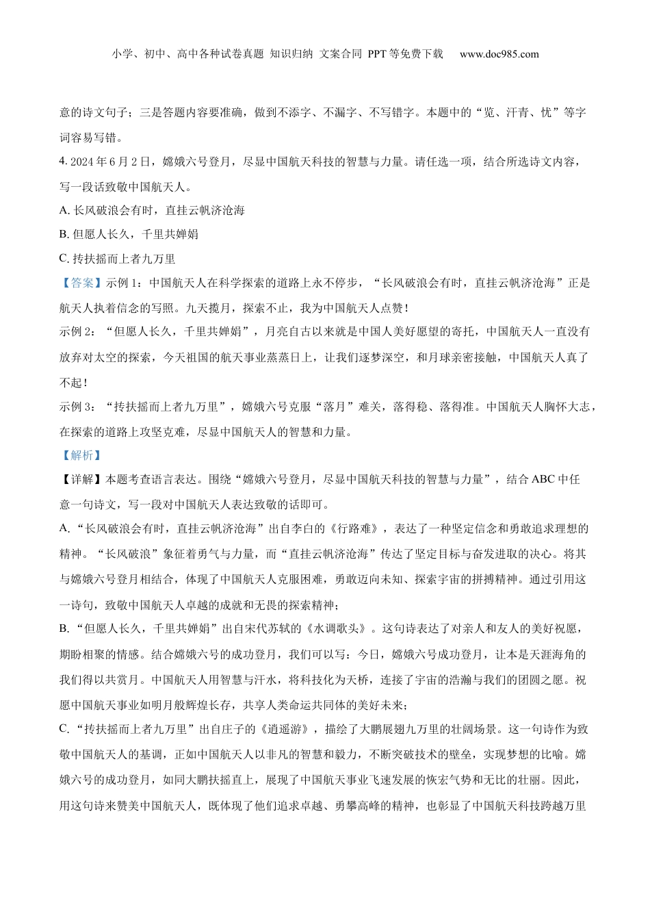 小学、初中、高中各种试卷真题知识归纳文案合同PPT等免费下载www.doc985.com2024年浙江省中考试题卷语文卷面书写(3分)根据相关内容评定,要求卷面整洁,书写规范工整。一、“树立远大志向”主题演讲活动(19分)1.阅读演讲稿开头,根据要求完成任务。志向是漫漫人生路上的基石,志向是实现梦想的阶梯,_____________。我们应树立远大志向,把人生梦想①_____________时代洪流,让péng_____________勃青春与家国情怀共振,就能找到施展才华的舞台,为国家发展②_____________源源不断的动力。当然,美好梦想不会自动成真,实现梦想往往是一个漫长而jiān_____________辛的过程,离不开锲而不舍、驰而不息的奋斗。(1)结合上文语境,根据拼音写出相应的汉字。péng_____________勃jiān_____________辛(2)文章①②处应分别填入哪个词?选择正确的答案()A.汇入汇聚B.汇聚汇入(3)在画横线处续写句子,和画波浪线部分构成排比。【答案】(1)①.蓬②.艰(2)A(3)示例1:志向是人生道路上的航向标示例2:志向是夜空中给我们指明方向的北斗星【解析】【小问1详解】本题考查字形。蓬勃(péng):繁荣;旺盛。艰辛(jiān):艰苦。【小问2详解】本题考查词义辨析。汇入:指资金或物品从一个地方流入到另一个地方。汇聚:强调多个事物或力量集中到一起,形成一个整体。第一空,根据“把人生梦想——时代洪流”可知,这里强调人生梦想主动融入时代这个大的环境中,使用“汇入”能够形象地表达个人梦想与时代潮流相融合的意思,符合语境。第二空,根据“为国家发展——源源不断的动力”可知,这里强调把各种力量或资源聚集起来为国家发展小学、初中、高中各种试卷真题知识归纳文案合同PPT等免费下载www.doc985.com提供动力。使用“汇聚”更合适。故选A。【小问3详解】本题考查仿写句子。画波浪线部分已经构成了两个排比句:“志向是漫漫人生路上的基石,志向是实现梦想的阶梯”。这两个句子都采用了“志向是……”的句式,并分别用“基石”和“阶梯”来比喻志向的重要性和作用。为了保持排比句式的一致性和韵律感,续写的句子也应该采用“志向是……”的句式,并选择一个与“基石”和“阶梯”相似且能够进一步强调志向作用的词语。示例:志向是攀登高峰的绳索。2.请为下面这副对联选择你认为最合适的下联()上联:各勉日新志下联:A.雅量涵高远B.星斗焕文章C.共证岁寒心D.云山起翰墨【答案】C【解析】【详解】本题考查对联。拟写对联时应注意:①字数相等;②词类相当;③结构相应;④平仄相对,仄起平收;⑤内容相关。各勉日新志:动词+偏正短语;表达的是每个人都要勉励自己,保持日新月异的志向和追求。A.名词+动宾短语,不合适;B.名词+动宾短语,不合适;C.动词+偏正短语,“心”是平声,结构符合,内容上表达共同经历艰难困苦,见证彼此的坚贞和忠诚,与上联的“日新志”相呼应,都体现了对坚韧不拔精神的追求。D.名词+动宾短语,不合适;故选C。3.根据段落的语境填写古诗文名句。志向有多高远,天地就有多辽阔。在《望岳》中,杜甫以“会当凌绝顶,①_____________”表达勇于攀登高峰的理想;在《过零丁洋》中,文天祥用“人生自古谁无死?②_____________”彰显舍生取义的气节;在《岳阳楼记》中,范仲淹以“③_____________,④_____________”抒写先忧后乐的抱负。【答案】①.一览众山小②.留取丹心照汗青③.先天下之忧而忧④.后天下之乐而乐【解析】【详解】本题考查名句默写。默写题作答时,一是要透彻理解诗文的内容;二是要认真审题,找出符合题小学、初中、高中各种试卷真题知识归纳文案合同PPT等免费下载www.doc985.com意的诗文句子;三是答题内容要准确,做到不添字、不漏字、不写错字。本题中的“览、汗青、忧”等字词容易写错。4.2024年6月2日,嫦娥六号登月,尽显中国航天科技的智慧与力量。请任选一项,结合所选诗文内容,写一段话致敬中国航天人。A.长风破浪会有时,直挂云帆济沧海B.但愿人长久,千里共婵娟C.抟扶摇而上者九万里【答案】示例1:中国航天人在科学探索的道路上永不停步,“长风破浪会有时,直挂云帆济沧海”正是航天人执着信念的写照。九天...