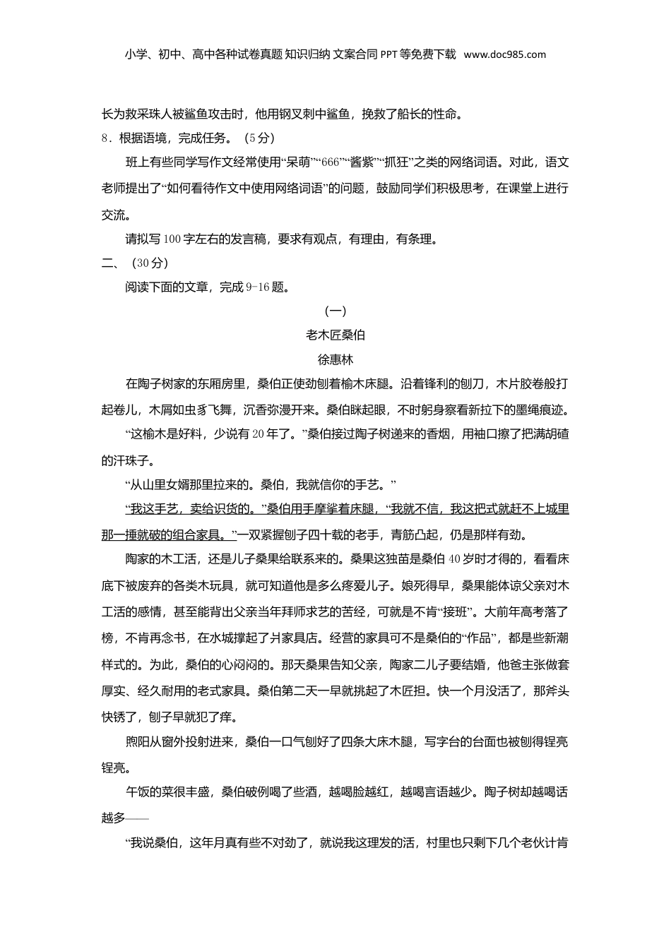小学、初中、高中各种试卷真题知识归纳文案合同PPT等免费下载www.doc985.com浙江省杭州市2018年中考语文真题试题一、(30分)1.下列句中加点字的注音和画线词语的书写全都正确的一项是(3分)A.西湖龙井茶的历史可追溯(suò“”)到我国唐代,在茶圣陆羽撰写的《茶经》中,就有杭州天竺、灵隐二寺产茶的记载(zǎi)。B.鹳鹊楼又称鹳雀楼,因时有鹳雀栖(xī)息其上而得名,坐落在蒲州(今山西永济)府城;后倾圮,其匾(biǎn)额移至城楼上。C.突如奇来的暴雨带来了丰沛(pèi)的降水,植物种子纷纷发芽、生长,往日死寂的沙漠不久就变成了绚(xuàn)丽的花海。D.英雄精神既体现在刹(chà)那间的生死抉择,也体现在经年累(lěi)月的执着坚守,比如那些默默钻研技术几十载的航天人。阅读下面的文字,完成2-3题。当今的艺术仿佛在兴致勃勃地享受一场技术的盛宴,舞台上扑朔迷离的灯光,3D电影院里上下左右晃动的座椅,魔术师利用光学仪器制造的视觉误差等……①从声光电的全面介入到各种闻所未闻的机械设备,技术的发展速度令人吃惊。然而,有多少人思考过这个问题:技术到底赋予了艺术什么?②关于世界,关于历史,关于神秘莫测——的人心技术增添了哪些发现?③在许多贪大求奢的文化工程、④文艺演出中,我们不难看到技术崇拜正在形成。2.文段中加点的词语,运用不正确的一项是(3分)A.仿佛B.扑朔迷离C.赋予D.神秘莫测3.文段中画线的标点,使用有误的一项是(2分)A.①B.②C.③D.④4.下列句子中没有语病的一项是(3分)A.近年来杭州积极创造人才国际化进程,越来越多的国际人才来杭创业,去年海外人才净流入率位居全国城市第一。B.受西太平洋副热带高压脊位置变化影响,导致未来几天我市将持续出现高温天气,大部分区县最高气温可达38℃。C.为纪念马克思诞生200周年,学校决定在5月份举行有关马克思的图片展览、学术研讨、征文比赛等大型主题活动。小学、初中、高中各种试卷真题知识归纳文案合同PPT等免费下载www.doc985.comD.商务部发布《主要消费品供需状况统计调查分析报告》显示,消费者对进口商品的需“”求旺盛,进口商品成为市场新宠。5.下列文学常识、文化常识表述有错误的一项是(3分)A“”“”“”.成语舍生取义老骥伏枥豁然开朗分别出自《孟子》、曹操的《龟虽寿》、陶渊明的《桃花源记》。B“.对联失马真成福”“移山未必愚取材于韩愈的《马说》与《列子》,化用了伯乐相”“”马愚公移山的典故。C“”“”“”“”“”.古人常以加冠而立不惑知天命耳顺代称二十岁、三十岁、四十岁、五十岁和六十岁。D“”“”“”.古人称谓有谦称和尊称的区别,比如愚是谦称自己,子是尊称对方,尊君是尊称对方的父亲。6.古诗文名句填空。(6分)(1)黄鹤一去不复返,。(崔颢《黄鹤楼》)(2)天下英雄谁敌手?曹刘。。(辛弃疾《南多子·登京口北固亭有怀》)(3),小桥流水人家,古道西风瘦马。(马致远《天净沙·秋思》(4“”“)制裁中兴通讯公司,美国政府显然是”,他们真正的目的是为了阻止中国高科技发展的步伐。(选用《醉翁亭记》中的句子)(5“)不管是在荣誉面前,还是受到不公正对待,作为一名老党员,他都能泰然处之,,”。(选用《岳阳楼记》中的句子)7.名著阅读。(5分)(1)在横线上填写与名著内容概述相对应的书名(范围为指定的名著阅读书目)。(2分)①《》,记叙了作者童年的生活和青年时求学的历程,追忆那些难以忘怀的人和事,抒发了对亲友和师长的怀念之情。②《》,通过叙写一波三折的爱情故事,塑造了一个出身低微、生活道路曲折,却始终坚持维护独立人格,追求个性自由、不向命运低头的女性形象。(2)名著中的主要人物,往往具有多面性。从下列人物中任选一个,结合相关情节进行分析。(3分)A.宋江B.猪八戒C.虎妞示例:尼德·——兰性情暴躁,常打算逃跑;但在危急关头能挺身而出,如当尼摩船小学、初中、高中各种试卷真题知识归纳文案合同PPT等免费下载www.doc985.com长为救采珠人被鲨鱼攻击时,他用钢叉刺中鲨鱼,挽救了船长的性命。8.根据语境,完成任务。(5分)“”“班上有些同学写作文经常...