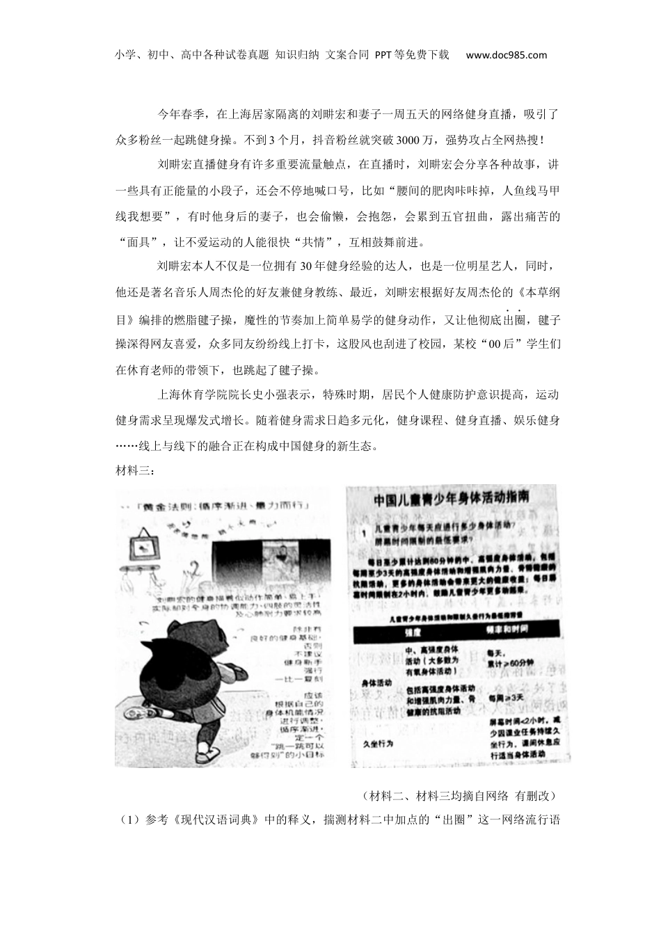 小学、初中、高中各种试卷真题知识归纳文案合同PPT等免费下载www.doc985.com2022年浙江省嘉兴市、舟山市中考语文试卷一、青春正当时,韶华需珍惜。舟嘉初中学生会组织开展“我们正青春”主题学习实践活动,共六个篇章。让我们一起在阅读中涵养性灵,在实践中增长才干。期待你的精彩表现一、青春•抗疫篇校学生会宣传部准备以“青春•抗疫”为主题进行宣传,请你参与,完成问题。(16分)任务一【修改寄语】1.(3分)宣传部准备出一期主题板报,拟写了一段“青春寄语”。请你参与对寄语的修改讨论。有人说:“人生最浪漫的事,莫过于祖国召唤时,我们正青春。”只有当青春与党和人民的业高度契合时,青春的色彩才会更加绚丽,青春的能量才能充分迸发。当下,新冠肺炎疫情尚未结束,找疫形势依然(yánjùn),需要我们青年挺身而出。在担当中历练,在尽责中成长。让我们扛起如山的责任,践行誓言的铿锵。小嘉:语段中“yánjùn”一词,“jùn”字的部首我有点没把握,你来写一下这个词吧。你:好的,这个词应该这样写,,我还发现“在担当中历炼,在尽责中成长”中有个错别字,应该这样改:。小舟:我觉得“寄语”中还有不妥之处,最后一个句子感觉读起来不顺畅。你:是的,这是个病句,把“”和“”调换位置,读起来就朗朗上口了。任务二【运用诗文】2.(8分)经典古诗文具有穿越时空的强大生命力和艺术感召力,板报编写组拟专设一个“古诗文•抗疫”栏目,请你填上合适的古诗文名句。古诗文能慰藉人们心灵、居家隔离时,看到窗外“(1),”(陶渊明《桃花源记》)的自然美景,会让你忘却烦恼忧愁。古诗文能礼赞抗疫英雄,年轻的“大白”们毅然奔赴抗疫一线,那是“(2),”《木兰诗》的义无反顾;退休的老人们走上街头勇当志愿者,那是“(3),”(龚自珍《己亥杂诗》)的无私奉献。古诗文能坚定人们信念,虽然疫情尚未结束,但有党和政府的坚强领导,一定会“(4),”(李白《行路难》),迎来胜利的曙光。任务三【解说插图】3.(3分)为加强防疫宣传,编写组打算给板报配一颗插图,请你推荐如图中的一幅并说小学、初中、高中各种试卷真题知识归纳文案合同PPT等免费下载www.doc985.com明理由。任务四【朗诵寄语】4.(2分)作为校广播站的播音员,你准备向全校师生朗诵“青春寄语”。请你从重音和语气等角度为开头这句话做朗读设计。有人说:“人生最浪漫的事,莫过于祖国召唤时,我们正青春。”二、青春•运动篇5.(10分)校学生会体育部收集了几则材料进行探究,请你参与,完成问题:材料一:材料二:小学、初中、高中各种试卷真题知识归纳文案合同PPT等免费下载www.doc985.com今年春季,在上海居家隔离的刘畊宏和妻子一周五天的网络健身直播,吸引了众多粉丝一起跳健身操。不到3个月,抖音粉丝就突破3000万,强势攻占全网热搜!刘畊宏直播健身有许多重要流量触点,在直播时,刘畊宏会分享各种故事,讲一些具有正能量的小段子,还会不停地喊口号,比如“腰间的肥肉咔咔掉,人鱼线马甲线我想要”,有时他身后的妻子,也会偷懒,会抱怨,会累到五官扭曲,露出痛苦的“面具”,让不爱运动的人能很快“共情”,互相鼓舞前进。刘畊宏本人不仅是一位拥有30年健身经验的达人,也是一位明星艺人,同时,他还是著名音乐人周杰伦的好友兼健身教练、最近,刘畊宏根据好友周杰伦的《本草纲目》编排的燃脂毽子操,魔性的节奏加上简单易学的健身动作,又让他彻底出圈,毽子操深得网友喜爱,众多同友纷纷线上打卡,这股风也刮进了校园,某校“00后”学生们在休育老师的带领下,也跳起了毽子操。上海休育学院院长史小强表示,特殊时期,居民个人健康防护意识提高,运动健身需求呈现爆发式增长。随着健身需求日趋多元化,健身课程、健身直播、娱乐健身……线上与线下的融合正在构成中国健身的新生态。材料三:(材料二、材料三均摘自网络有删改)(1)参考《现代汉语词典》中的释义,揣测材料二中加点的“出圈”这一网络流行语小学、初中、高中各种试卷真题知识归纳文案合同PPT等免费下载www.doc985.com的意思。出圈儿:比喻(言行)越出常规或一定范围。——《现代汉语词典(第7版)》...
