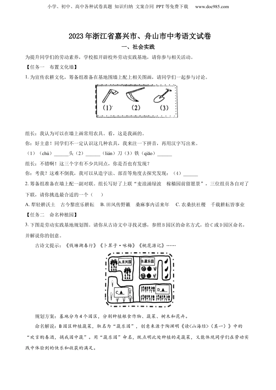 小学、初中、高中各种试卷真题知识归纳文案合同PPT等免费下载www.doc985.com2023年浙江省嘉兴市、舟山市中考语文试卷一、社会实践为提升同学们的劳动素养,学校拟开辟校外劳动实践基地,请你参与相关活动。【任务一布置文化墙】1.为宣传农耕文化,筹备组准备在基地围墙上配上相关图画,请同学们一起参与讨论。组长:我认为可以在墙上画常用农具。看,这是我画的。你:好主意!同学们不一定认识这几种农具,我来注一下拼音,再用汉字写出来。(1)(chú)______头(2)______(lián)刀(3)铁(qiāo)______组长:不错啊!这三个字有不少共同点,你是否也有发现?你:考我?这难不倒我,我可以从造字法、部首等角度去探究发现:(4)______2.筹备组准备在墙上配一副对联。组长写好了上联“麦浪涌绿波稼穑园前留愿景”,三位组员各自对了下联,请你挑选最合适的一个()A.犁轻耕沃土古今黎庶乐耕耘B.田风传野籁桑麻事内话来年C.农桑扶社稷千载耕耘皆事业【任务二命名种植园】3.下图是劳动实践基地规划图。请你从古诗文中寻找灵感,参照B园区的命名方式,给C或D园区命名,并解说你的创意。古诗文提示:《钱塘湖春行》《卜算子·咏梅》《桃花源记》……规划方案:基地分为4个园区,分别种植粮食作物、蔬菜、树木和花卉。命名解说:B园区种植蔬菜,取名为“蔬乐园”,创意来源于陶渊明《读<山海经>(其一)》中的“欢言酌春酒,摘我园中蔬”。用“蔬乐园”命名,既点明此处种植的是蔬菜,又能体现同学们在劳动实践中体验到的快乐和收获的满足。小学、初中、高中各种试卷真题知识归纳文案合同PPT等免费下载www.doc985.com【任务三说服好朋友】4.学校决定让学生参与劳动实践基地的管理。朋友小舟表示:我们平时学习忙,没有时间;再说也没种植经验,不能参与管理。请你说服他。【答案】1..①锄②.镰③.锹④.示例1,都是形声字,左边是形旁,右边是声旁。都是左右结构都是“钅”偏旁。示例2:都是形声字,都用了“钅”偏旁。示例3:这几个字都是“钅”偏旁,由此可推断这些农具是铁制造的。2.B3.示例1:C园区取名为“树怡园”,该名称创意来源于白居易《钱塘潮春行》中的“几处早莺争暖树,谁家新燕啄春泥”。用“树怡园”命名,既点明这里种的是树,还含蓄地表现了学生在该园区劳动时与自然和谐相处的情景和怡然自得的美好心情。示例2:D园区取名为“如香园”,该名称出处为陆游《卜算子•咏梅》中的“零落成泥碾作尘,只有香如故”。以“如香园”为名,园名富有美感,既含蓄点明这里种的是花,也能在潜移默化中涵养师生高雅情趣,培养高尚的情操。示例3.D园区取名为“落英园”,该创意出自陶渊明《桃花源记》中的“芳草鲜美,落英缤纷”。诗人笔下的桃花林,芳草遍地,落花纷纷,美不胜收。用“落英园”命名,富有文化气息,不但点明这里种的是花卉,还能表明我们在基地里能欣赏四季花卉,提升审美能力,丰富精神世界。4.示例:小舟,参与基地的日常管理,能提升我们的动手能力、创造能力和劳动素养等。你说没时间,我们可以利用双休日等课余时间去基地。我们确实没啥经验,但正因如此,我们更应在实践中学习,积累劳动经验,增长各种本领。通过劳动实践和参与管理,我们既能学到本领,还能在劳动中培养吃苦耐劳、团结合作等精神,是一举多得的好事。我们一起去吧!你说好吗?【解析】【1题详解】考查字形。锄头,chútou,南方用的形状像镐的农具。镰刀,liándāo,弯钩形刀,有一短柄,装有短木把,用于割庄稼或割草。铁锹,tiěqiāo,一种扁平长方形半圆尖头的适于用脚踩入地中翻土的构形工具。从造字法的角度来看,这三个字都是形声词,都是左右结构。左边表意,右边表声。从部首的角度来看,这三个字都是“钅”偏旁,说明这些家具都是铁制的。【2题详解】考查拟写对联。下联末字应为一声或二声。C项末字为“业”,四声,可排除。小学、初中、高中各种试卷真题知识归纳文案合同PPT等免费下载www.doc985.com上联后半句“稼穑园前留愿景”是一个偏正结构。A项中的“古今黎庶乐耕耘”是一个主谓结构。B项中的“桑麻事内话来年”是一个偏正结构。故选B。【3题详解】考查拟名的能力。...
