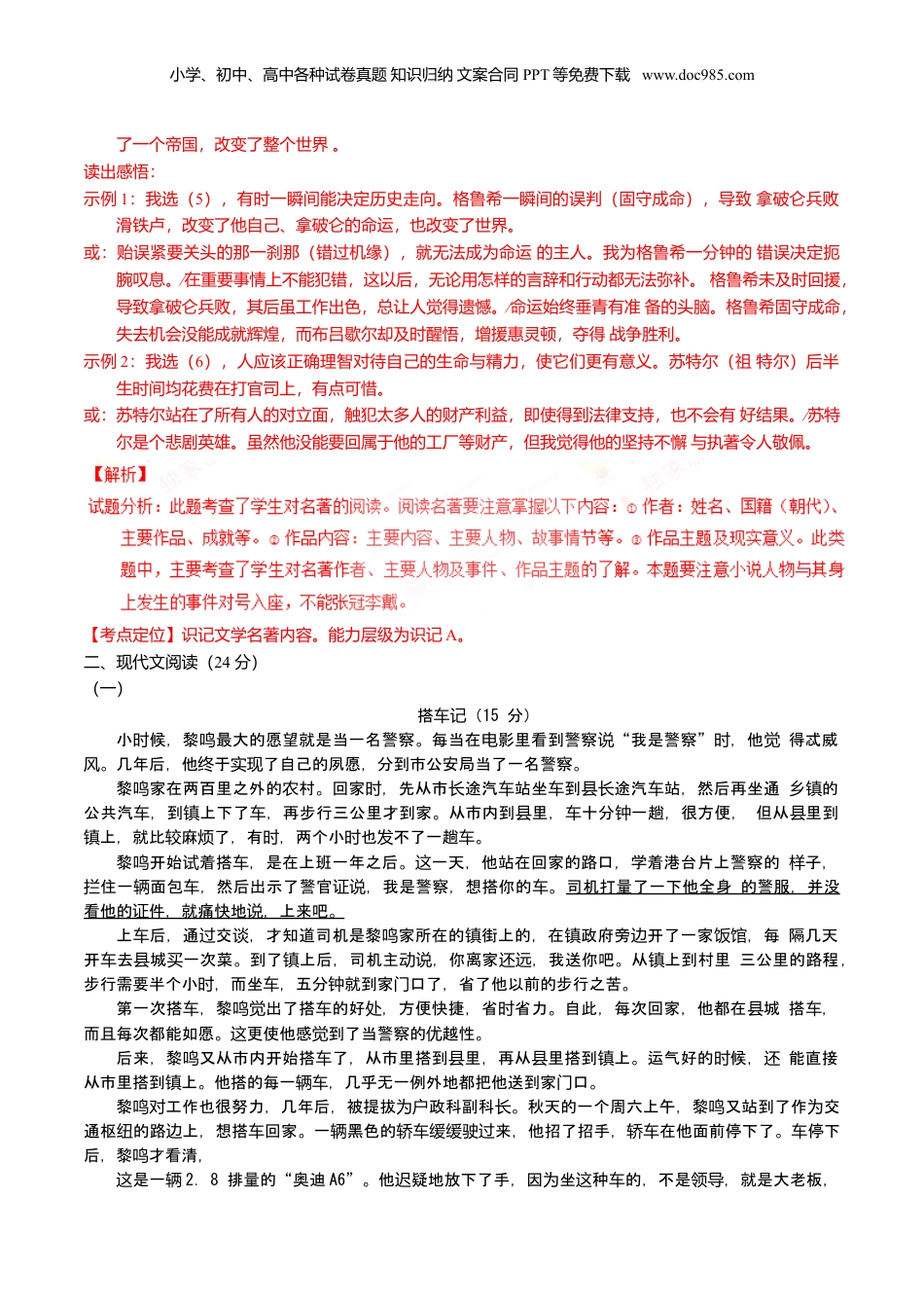 小学、初中、高中各种试卷真题知识归纳文案合同PPT等免费下载www.doc985.com2017年浙江省初中毕业升学考试(嘉兴市、舟山市)语文试题卷温馨提示:1.全卷共6页,四大题,19小题。满分120分,其中卷面书写3分。考试时间120分钟。2.答题前请仔细阅读答题纸上的注意事项。一、语文知识积累(19分)1.根据拼音写出相应的汉字。(3分)中国古典凝聚了大量美好、文(诗词yǎ)和高的文字。朗些文字,能我贵读这够让们疲(bèi)的心灵得到放松,可以帮助我离低俗和粗鄙,(们远dǐ)达宁静和悠的远境界。【答案】(3分)雅惫抵【考点定位】识记并正确书写现代汉语普通话常用字的字音。能力层级为识记A。2.古诗文名句默写。(8分)典文能增添生活的意。仲春,郊外踏青,看到青梅柳的美景,我会想起南唐人经诗诗时节丝们联诗冯延巳的“,”;重阳佳,院中漫步,到菊花节闻的幽幽清香,我们想起宋代联女人李清照的“词,”。典文能予前行的力量。学上碰到困,《》中孔子的“经诗赋习难时论语语录,”我思考与启给们;生活中遭遇挫折,唐朝人杜甫的名句“发时诗,”会令我重新振作。们【答案】(8分)青梅如豆柳如眉,日长蝴蝶飞;东篱把酒黄昏后,有暗香盈袖。学而不思则罔,思而不学则殆(学而时习之,不亦说乎;温故而知新,可以为师矣);会当凌绝顶,一览众山小【解析】试题分析:本题考查古诗文默写,要注意平时多积累,对于常见人生哲理的句子要多对比记忆。注意不能出现错别字“”“”“”“”“”“”“”“,如袖罔殆说凌炬隆倾”“倾颓”“拂”“”“”患畔。【考点定位】默写常见的名句名篇。能力层级为识记A。3.传统文化知识。(2分)八年级学生小芳想找个微信群,与志趣相投的同龄学友共同探讨一些感兴趣的国学问题。若有以下四个国学爱好者微信群,她选哪个最适合?()ABCD【答案】(2分)B【解析】小学、初中、高中各种试卷真题知识归纳文案合同PPT等免费下载www.doc985.com试题分析:此题考查了学生对文化常识的理解。四十不惑,三十而立,20岁左右称为弱冠,豆蔻是十三四岁至十五六岁符合中学生小芳的年龄段。【考点定位】识记文化常识。能力层级为识记A。4.文学常识与名著阅读。(6分)(1)下列说法错误的一项是()(2分)A.“”范进中举是吴敬梓长篇讽刺小说《儒林外史》中的精彩片段,胡屠户、张乡绅等态度的变化反映了当时社会趋炎附势的众生相。B.“”老舍笔下的骆驼祥子,经历了三起三落,由一个自尊好强、吃苦耐劳的车夫,变成了好占便宜、自暴自弃的行尸走肉。】C.英国文艺复兴时期伟大的剧作家莎士比亚,在其喜剧作品《威尼斯商人》中塑造了一个贪婪、阴险的吝啬鬼形象——葛朗台。D.高尔基的自传体小说《童年》中,阿廖沙在黑暗污浊的环境中仍保持着生活的勇气和信心,逐成长为坚强勇敢、充满爱心的人。【答案】(1)(2分)C【考点定位】识记文学名著内容。能力层级为识记A。(2)读名著要读懂内容、读出感悟。请仿照下面演示文稿中的示例,完成相关任务。(每组二选一,各60字左右)(4分)【答案】(2)(4分)读懂内容:示例1:我选(2“”),巴尔沃(博)亚违抗了王室命令,为得到宽恕,踏上寻找黄金国的探险之旅。结果他首先发现了太平洋。或:为躲避债务,巴尔沃亚把出逃也当成一次探险,结果他首先发现了太平洋。而这探险被后世证明为“”不朽的事业。示例2:我选(3),十月革命前夕,列宁冒着风险乘封闭的列车潜回俄国,之后发动了十月革命。摧毁小学、初中、高中各种试卷真题知识归纳文案合同PPT等免费下载www.doc985.com了一个帝国,改变了整个世界。读出感悟:示例1:我选(5),有时一瞬间能决定历史走向。格鲁希一瞬间的误判(固守成命),导致拿破仑兵败滑铁卢,改变了他自己、拿破仑的命运,也改变了世界。或:贻误紧要关头的那一刹那(错过机缘),就无法成为命运的主人。我为格鲁希一分钟的错误决定扼∕腕叹息。在重要事情上不能犯错,这以后,无论用怎样的言辞和行动都无法弥补。格鲁希未及时回援,∕导致拿破仑兵败,其后虽工作出色,总让人觉得遗憾。命运始终垂青有准备的头脑。格鲁希固守成命,失去机会没能成就辉煌,而布...