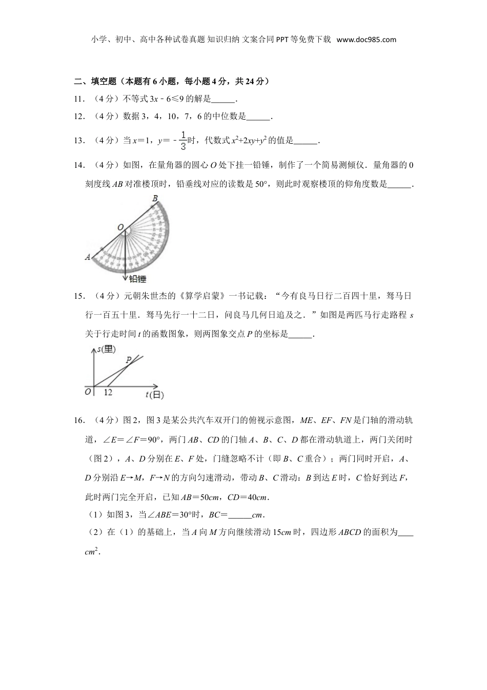 小学、初中、高中各种试卷真题知识归纳文案合同PPT等免费下载www.doc985.com2019年浙江省丽水市中考数学试卷一、选择题(本题有10小题,每小题3分,共30分).1.(3分)实数4的相反数是()A.﹣B.﹣4C.D.42.(3分)计算a6÷a3,正确的结果是()A.2B.3aC.a2D.a33.(3分)若长度分别为a,3,5的三条线段能组成一个三角形,则a的值可以是()A.1B.2C.3D.84.(3分)某地一周前四天每天的最高气温与最低气温如表,则这四天中温差最大的是()星期一二三四最高气温10°C12°C11°C9°C最低气温3°C0°C﹣2°C﹣3°CA.星期一B.星期二C.星期三D.星期四5.(3分)一个布袋里装有2个红球、3个黄球和5个白球,除颜色外其它都相同.搅匀后任意摸出一个球,是白球的概率为()A.B.C.D.6.(3分)如图是雷达屏幕在一次探测中发现的多个目标,其中对目标A的位置表述正确的是()A.在南偏东75°方向处B.在5km处小学、初中、高中各种试卷真题知识归纳文案合同PPT等免费下载www.doc985.comC.在南偏东15°方向5km处D.在南偏东75°方向5km处7.(3分)用配方法解方程x2﹣6x﹣8=0时,配方结果正确的是()A.(x﹣3)2=17B.(x﹣3)2=14C.(x﹣6)2=44D.(x﹣3)2=18.(3分)如图,矩形ABCD的对角线交于点O.已知AB=m,∠BAC=∠α,则下列结论错误的是()A.∠BDC=∠αB.BC=m•tanαC.AO=D.BD=9.(3分)如图物体由两个圆锥组成.其主视图中,∠A=90°,∠ABC=105°,若上面圆锥的侧面积为1,则下面圆锥的侧面积为()A.2B.C.D.10.(3分)将一张正方形纸片按如图步骤,通过折叠得到图④,再沿虚线剪去一个角,展开铺平后得到图⑤,其中FM,GN是折痕.若正方形EFGH与五边形MCNGF的面积相等,则的值是()A.B.﹣1C.D.小学、初中、高中各种试卷真题知识归纳文案合同PPT等免费下载www.doc985.com二、填空题(本题有6小题,每小题4分,共24分)11.(4分)不等式3x﹣6≤9的解是.12.(4分)数据3,4,10,7,6的中位数是.13.(4分)当x=1,y=﹣时,代数式x2+2xy+y2的值是.14.(4分)如图,在量角器的圆心O处下挂一铅锤,制作了一个简易测倾仪.量角器的0刻度线AB对准楼顶时,铅垂线对应的读数是50°,则此时观察楼顶的仰角度数是.15.(4分)元朝朱世杰的《算学启蒙》一书记载:“今有良马日行二百四十里,驽马日行一百五十里.驽马先行一十二日,问良马几何日追及之.”如图是两匹马行走路程s关于行走时间t的函数图象,则两图象交点P的坐标是.16.(4分)图2,图3是某公共汽车双开门的俯视示意图,ME、EF、FN是门轴的滑动轨道,∠E=∠F=90°,两门AB、CD的门轴A、B、C、D都在滑动轨道上,两门关闭时(图2),A、D分别在E、F处,门缝忽略不计(即B、C重合);两门同时开启,A、D分别沿E→M,F→N的方向匀速滑动,带动B、C滑动:B到达E时,C恰好到达F,此时两门完全开启,已知AB=50cm,CD=40cm.(1)如图3,当∠ABE=30°时,BC=cm.(2)在(1)的基础上,当A向M方向继续滑动15cm时,四边形ABCD的面积为cm2.小学、初中、高中各种试卷真题知识归纳文案合同PPT等免费下载www.doc985.com三、解答题(本题有8小题,共66分,各小题都必须写出解答过程。)17.(6分)计算:|﹣3|﹣2tan60°++()﹣1.18.(6分)解方程组19.(6分)某校根据课程设置要求,开设了数学类拓展性课程,为了解学生最喜欢的课程内容,随机抽取了部分学生进行问卷调查(每人必须且只选其中一项),并将统计结果绘制成如下统计图(不完整).请根据图中信息回答问题:(1)求m,n的值.(2)补全条形统计图.(3)该校共有1200名学生,试估计全校最喜欢“数学史话”的学生人数.20.(8分)如图,在7×6的方格中,△ABC的顶点均在格点上.试按要求画出线段EF(E,F均为格点),各画出一条即可.小学、初中、高中各种试卷真题知识归纳文案合同PPT等免费下载www.doc985.com21.(8分)如图,在▱OABC中,以O为圆心,OA为半径的圆与BC相切于点B,与OC相交于点D.(1)求的度数.(2)如图,点E在⊙O上,连结CE与⊙O交于点F,若EF=AB,求∠OCE的度数.22.(10分...