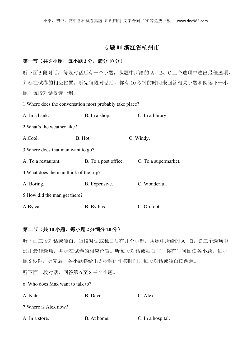 小学、初中、高中各种试卷真题知识归纳文案合同PPT等免费下载www.doc985.com专题01浙江省杭州市第一节(共5小题,每小题2分,满分10分)听下面5段对话,每段对话后有一个小题,从题中所给的A、B、C三个选项中选出最佳选项,并标在试卷的相应位置。听完每段对话后,你有10秒钟的时间来回答相关小题和阅读下一小题,每段对话仅读一遍。1.Wheredoestheconversationmostprobablytakeplace?A.Inabank.B.Inashop.C.Inalibrary.2.What’stheweatherlike?A.Cool.B.Hot.C.Windy.3.Wheredoesthatmanwanttogo?A.Toarestaurant.B.Toapostoffice.C.Toasupermarket.4.Whatdoesthemanthinkofthetrip?A.Boring.B.Expensive.C.Wonderful.5.Howdidthemangetthere?A.Bycar.B.Bybus.C.Onfoot.第二节(共10小题,每小题2分满分20分)听下面三段对话或独白。每段对话或独白后有几个小题,从题中所给的A,B,C三个选项中选出最佳选项,并标在试卷的相应位置。听每段对话或独白前,你有时间阅读各小题,每小题5秒钟,听完后,各小题将给出5秒钟的作答时间。每段对话或独白读两遍。听下面一段对话,回答第6至8三个小题。6.WhodoesMaxwanttotalkto?A.Kate.B.Dave.C.Alex.7.WhereisAlexnow?A.Inastore.B.Athome.C.Inahospital.小学、初中、高中各种试卷真题知识归纳文案合同PPT等免费下载www.doc985.com8.WhatisMaxgoingtodoat2:00p.m.tomorrow?A.Visitafriend.B.Seeadoctor.C.Makeacall.听下面一段对话,回答第9至11三个小题。9.What’sthewomangoingtodonextweek?A.Makeaspeech.B.Givealesson.C.Haveatest.10.Howdoesshefeelwhenshespeaksinclass?A.Excited.B.Nervous.C.Angry.11.What’stheman’ssuggestion?A.Finishwritingalittleearlier.B.Usemorebeautifulwords.C.Practiceonhimandhisfriends.听下面一段对话,回答第12至15四个小题。12.Howoldisthespeakernow?A.10.B.12.C.14.13.Whywasheunhappy?A.Becausehewastiredofthecitylife.B.Becausehehadtomovetoanewplace.C.Becausehecouldn’tfindhisskateboard.14.Whatdoeshethinkofhislifenow?A.Enjoyable.B.Difficult.C.Lonely.15WhoisTony?A.Hisnewclassmate.B.Hisyoungerbrother.C.Hisoldfriend.小学、初中、高中各种试卷真题知识归纳文案合同PPT等免费下载www.doc985.com答案1-5BBACC6-10BCAAB11-15CCBAC录音原文第一节听下面5段对话,每段对话后有一个小题,从题中所给的A、B、C三个选项中选出最佳选项,并标在试卷的相应位置。听完每段对话后,你有10秒钟的时间来回答相关小题和阅读下一小题,每段对话仅读一遍。Text1M:Hello!CanItryonthisshirt,please?W:Ofcoursethechangingroomsareoverthere.Text2W:Ijustcan'tstandtheheatanymore.M:Yeah.ThetemperatureistoohighforearlyMay.Doyoumindmeturningonthefan?W:Notatall.Text3M:Excuseme.Arethereanyrestaurantsnearhere?W:Yes,there'soneinfrontofthepostoffice,nexttothesupermarket.Text4W:Wehadsuchagoodtrip,didn'twe?M:Yeswedid.IreallyenjoyeditW:Anditwasn'ttooexpensive,wasit?M:No,itwasn'texpensiveatall.Text5M:I'msorrytobelate,butIhadaproblemwithmycar.W:Ohdear,didyougetthebus?M:Iwantedto,butImissedit,soIdecidedtowalk.W:Nowonderyoulooksotired.小学、初中、高中各种试卷真题知识归纳文案合同PPT等免费下载www.doc985.com第二节听下面三段对话或独白。每段对话或独白后有几个小题,从题中所给的A,B,C三个选项中选出最佳选项,并标在试卷的相应位置。听每段对话或独白前,你有时间阅读各小题,每小题5秒钟,听完后,各小题将给出5秒钟的作答时间。每段对话或独白读两遍。听下面一段对话,回答第6至8三个小题。W:Hello!M:Hi,Kate,it'sMax.W:Oh,hiMax!YouwanttotalktoDave,Iguess.M:That'sright,W:I'mafraidhe'snotin.Heisdoingsomeshopping,IthinkM:Allright,couldIleaveamessage,Kate?W:Yes,ofcourse.M:OK,pleasetellhimthatAlexisinhospital.It'snothingserious,hehurthisleg.Ithinkwe'llgoandseehim.W:Allright,whenareyougoing?M:Oh,sorryattwotomorrowafternoon.Thank...