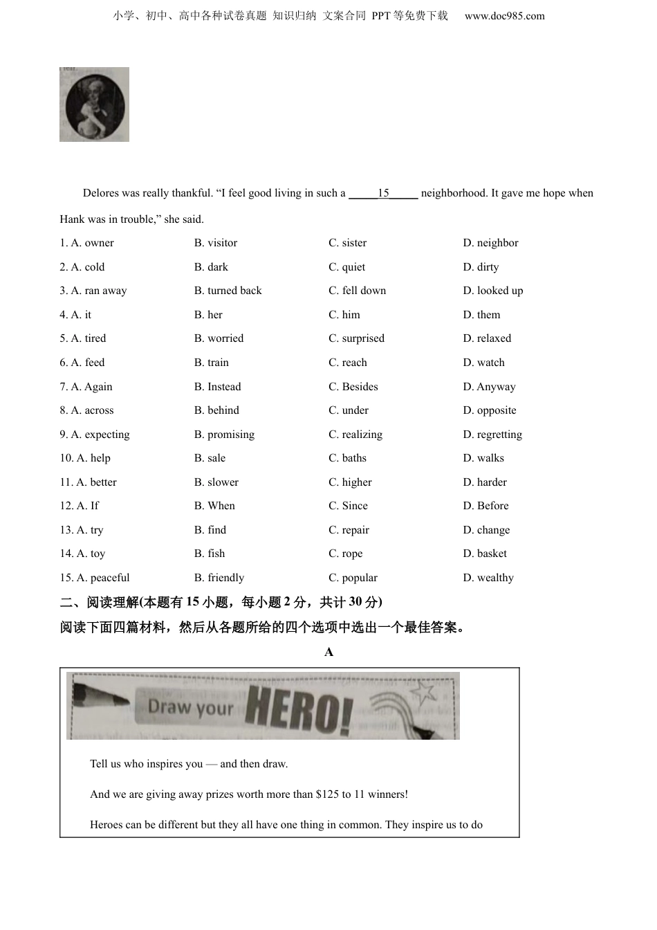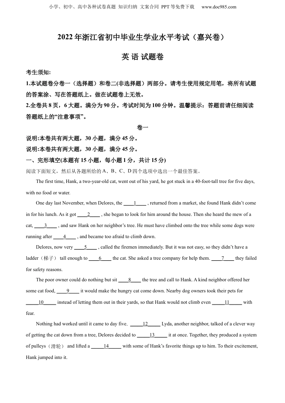 小学、初中、高中各种试卷真题知识归纳文案合同PPT等免费下载www.doc985.com2022年浙江省初中毕业生学业水平考试(嘉兴卷)英语试题卷考生须知:1.本试题卷分卷一(选择题)和卷二(非选择题)两部分。请考生使用规定用笔,将所有试题的答案涂、写在答题纸上。做在试题卷上无效。2.全卷共8页,6大题。满分为90分。考试时间为100分钟。温馨提示:答题前请任细阅读答题纸上的“注意事项”。卷一说明:本卷共有两大题,30小题,满分45分。说明:本卷共有两大题,30小题,满分45分。一、完形填空(本题有15小题,每小题1分,共计15分)阅读下面短文,然后从各题所给的A、B、C、D四个选项中选出一个最佳答案。Thefirsttime,Hank,atwo-year-oldcat,wentoutofhisyard,hegotstuckina40-foot-talltreeforfivedays,withnofoodorwater.OnedaylastNovember,whenDelores,the____1____,returnedfromamarket,shefoundHankdidn’tcomeinforhislunch.Asitgot____2____,shebegantolookforhimaroundthehouse.Thensheheardthemewofacat,____3____,andsawHankonherneighbor’stree.Hemusthaveclimbedontothetreewhilesomedogswererunningafter____4____,andbecametooafraidtoclimbdown.Delores,nowvery____5____,calledthefiremenimmediately.Butitwasnoteasy,sotheydidn’thavealadder(梯子)tallenoughto____6____thecat.Sheaskedatreecompanyforhelpthem.____7____theyfailedforsafetyreasons.Thepoorownercoulddonothingbutsit____8____thetreeandcalltoHank.Akindneighborofferedhersomecatfood,____9____itwouldmakethehungrycatcomedown.Nearbydogownerstooktheirpetsfor_____10_____insteadoflettingthemoutintheiryards,sothatHankwouldnotclimbeven_____11_____withfear.Nothinghadworkeduntilitcametodayfive._____12_____Lyda,anotherneighbor,talkedofacleverwayofgettingthecatdownfromatree,Deloresdecidedto_____13_____itatonce.Together,theyproducedasystemofpulleys(滑轮)andlifteda_____14_____withsomeofHank’sfavoritethingsuptohim.Totheirexcitement,Hankjumpedintoit.小学、初中、高中各种试卷真题知识归纳文案合同PPT等免费下载www.doc985.comDeloreswasreallythankful.“Ifeelgoodlivinginsucha_____15_____neighborhood.ItgavemehopewhenHankwasintrouble,”shesaid.1.A.ownerB.visitorC.sisterD.neighbor2.A.coldB.darkC.quietD.dirty3.A.ranawayB.turnedbackC.felldownD.lookedup4.A.itB.herC.himD.them5.A.tiredB.worriedC.surprisedD.relaxed6.A.feedB.trainC.reachD.watch7.A.AgainB.InsteadC.BesidesD.Anyway8.A.acrossB.behindC.underD.opposite9.A.expectingB.promisingC.realizingD.regretting10.A.helpB.saleC.bathsD.walks11.A.betterB.slowerC.higherD.harder12.A.IfB.WhenC.SinceD.Before13.A.tryB.findC.repairD.change14.A.toyB.fishC.ropeD.basket15.A.peacefulB.friendlyC.popularD.wealthy二、阅读理解(本题有15小题,每小题2分,共计30分)阅读下面四篇材料,然后从各题所给的四个选项中选出一个最佳答案。ATelluswhoinspiresyou—andthendraw.Andwearegivingawayprizesworthmorethan$125to11winners!Heroescanbedifferentbuttheyallhaveonethingincommon.Theyinspireustodo小学、初中、高中各种试卷真题知识归纳文案合同PPT等免费下载www.doc985.combetter.Theycouldbeacreativeartistordancer,awisescientistoraskillfulsportsstar.Andheroesdon’thavetobefamous.Theycouldbesomeonelikeaparent,brother,friendorteacher,whoquietlygoesaboutmakingtheworldabetterplace.Whetheryourheroisknownaroundtheworld,orissomeoneclosertohomewhosimplymakesyoulaughoriskindtoyou,wecan’twaittoseeyourdrawingsofthemandreadaboutwhoinspiresyou!Seebelowforinstructionsonhowtoenterthecompetition.Goodluck!Downloadandprintouttemplates(模板)todrawyourpictureonbyvisitinghttp://kidspic.com.au.Ontheblankpostcardtemplate,drawapictureofyourhero.Ont...