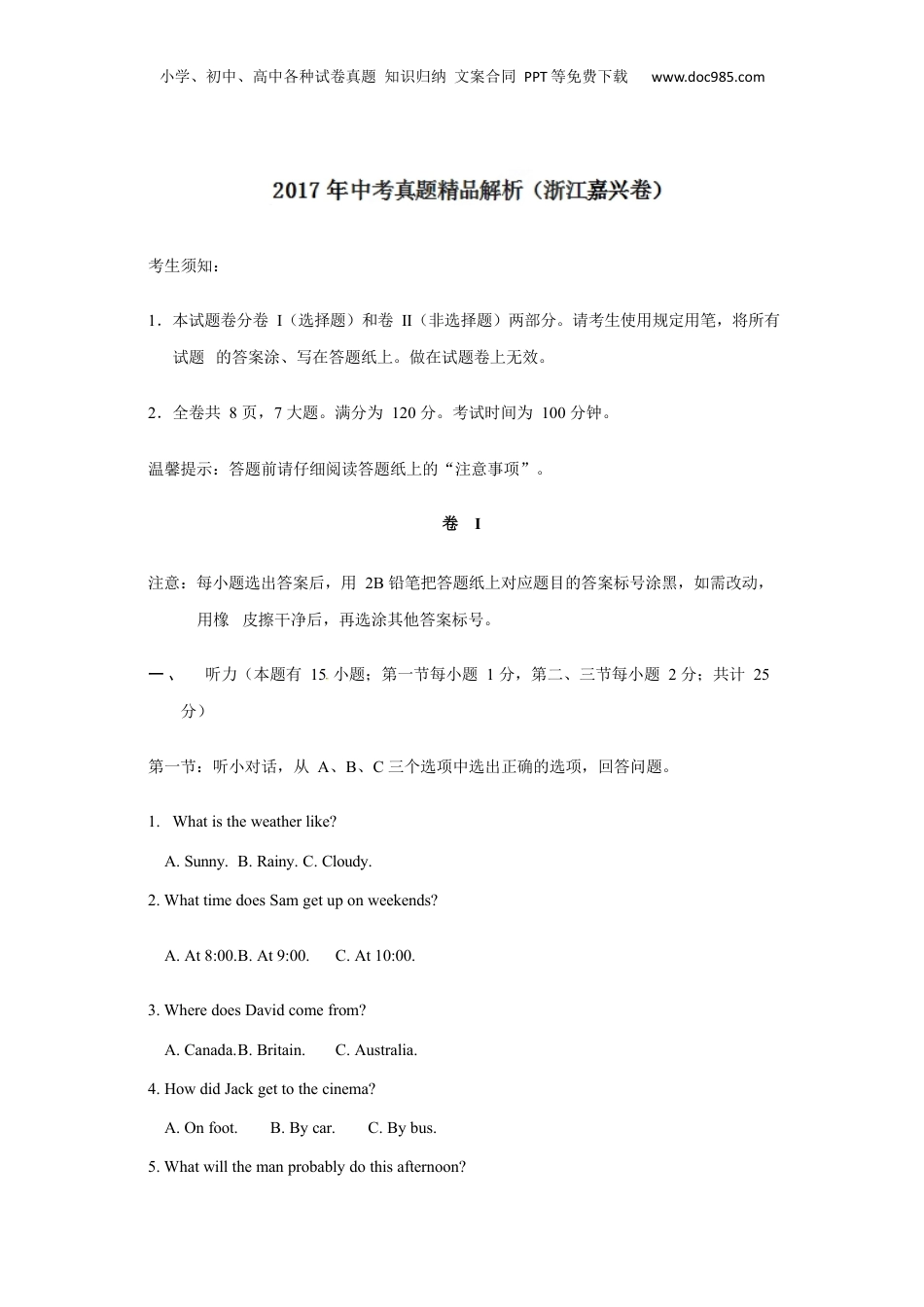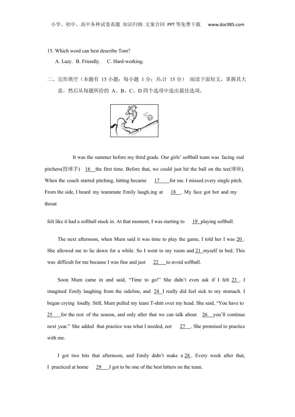 小学、初中、高中各种试卷真题知识归纳文案合同PPT等免费下载www.doc985.com考生须知:1.本试题卷分卷I(选择题)和卷II(非选择题)两部分。请考生使用规定用笔,将所有试题的答案涂、写在答题纸上。做在试题卷上无效。2.全卷共8页,7大题。满分为120分。考试时间为100分钟。温馨提示:答题前请仔细阅读答题纸上的“注意事项”。卷I注意:每小题选出答案后,用2B铅笔把答题纸上对应题目的答案标号涂黑,如需改动,用橡皮擦干净后,再选涂其他答案标号。一、听力(本题有15小题;第一节每小题1分,第二、三节每小题2分;共计25分)第一节:听小对话,从A、B、C三个选项中选出正确的选项,回答问题。1.Whatistheweatherlike?A.Sunny.B.Rainy.C.Cloudy.2.WhattimedoesSamgetuponweekends?A.At8:00.B.At9:00.C.At10:00.3.WheredoesDavidcomefrom?A.Canada.B.Britain.C.Australia.4.HowdidJackgettothecinema?A.Onfoot.B.Bycar.C.Bybus.5.Whatwillthemanprobablydothisafternoon?小学、初中、高中各种试卷真题知识归纳文案合同PPT等免费下载www.doc985.comA.Goshopping.B.Goswimming.C.Gofishing.第二节:听长对话,从A、B、C三个选项中选出正确的选项,回答问题。听下面一段较长对话,回答第6、7两个问题。6.What’swrongwithLinda?A.Shehasaheadache.B.Shehasacold.C.Shehasafever.7.What’sthemostpossiblerelationshipbetweenthetwospeakers?A.Fatheranddaughter.B.Teacherandstudent.C.Doctorandpatient.听下面一段较长对话,回答第8~10三个问题。8.WhatisAnnaplanning?A.Astudytour.B.Aschooltrip.C.Afamilyvacation.9.HowlongwillAnnastayinEngland?Foraweek.B.Fortwoweeks.C.Forthreeweeks.10.WhydoesAnnaplantogotoCambridge?Tovisitheruncle.B.Togosightseeing.C.Tovisitauniversity.第三节:听下面一段独白,从A、B、C三个选项中选择正确的选项,回答问题。11.WhatisTom’sweekendjob?A.Toprintnewspapers.B.Tosellnewspapers.C.Tohandoutnewspapers.12.WheredoesTomputthenewspapersonrainydays?A.Onthebookshelves.B.Inthemilkboxes.C.Intheletterboxes.13.WhydoesTomfixalightontohisbike?A.Becausehehaspooreyesight.B.Becausehewantstomakehisbikenicer.C.Becauseheoftencan’tfinishthetaskuntilafterdark.14.HowfarisTom’sworkingarea?A.Closetohisschool.B.Closetohishome.C.Veryfarfromhishome.小学、初中、高中各种试卷真题知识归纳文案合同PPT等免费下载www.doc985.com15.WhichwordcanbestdescribeTom?A.Lazy.B.Friendly.C.Hard-working.二、完形填空(本题有15小题;每小题1分;共计15分)阅读下面短文,掌握其大意,然后从每题所给的A、B、C、D四个选项中选出最佳选项。Itwasthesummerbeforemythirdgrade.Ourgirls’softballteamwasfacingrealpitchers(投球手)16thefirsttime.Beforethat,wecouldjusthittheballonthetee(球座).Whenthecoachstartedpitching,hittingbecame17forme.Imissedeverysinglepitch.Fromtheside,IheardmyteammateEmilylaughingat18.Myfacegothotandmythroatfeltlikeithadasoftballstuckin.Atthatmoment,Iwasstartingto19playingsoftball.Thenextafternoon,whenMumsaiditwastimetoplaythegame,ItoldherIwas20.Sheallowedmetoliedownforawhile.SoIwenttomyroomand21myselfinbed.ThiswasdifficultformebecauseIwasfineandjust22toavoidsoftball.SoonMumcameinandsaid,“Timetogo!”Shedidn’tevenaskifIfelt23.IimaginedEmilylaughingfromthesideline,and24Ireallydidfeelsicktomystomach.Ibegancryingloudly.Still,MumpulledmyteamT-shirtovermyhead.Shesaid,“Youhaveto25fortherestoftheseason,andonlyafterthatwecantalkabout26you’llcontinuenextyear.”SheaddedthatpracticewaswhatIneeded,not27.Shepromisedtopracticewithme.Igottwohitsthatafternoon,andEmilydidn’tmakea28.Everyweekafterthat,Ipracticedathome29Igottobeoneofthebesthittersontheteam.小学、初中、高中各种试卷真题知识归纳文案合同PPT等免费下载www.doc985...