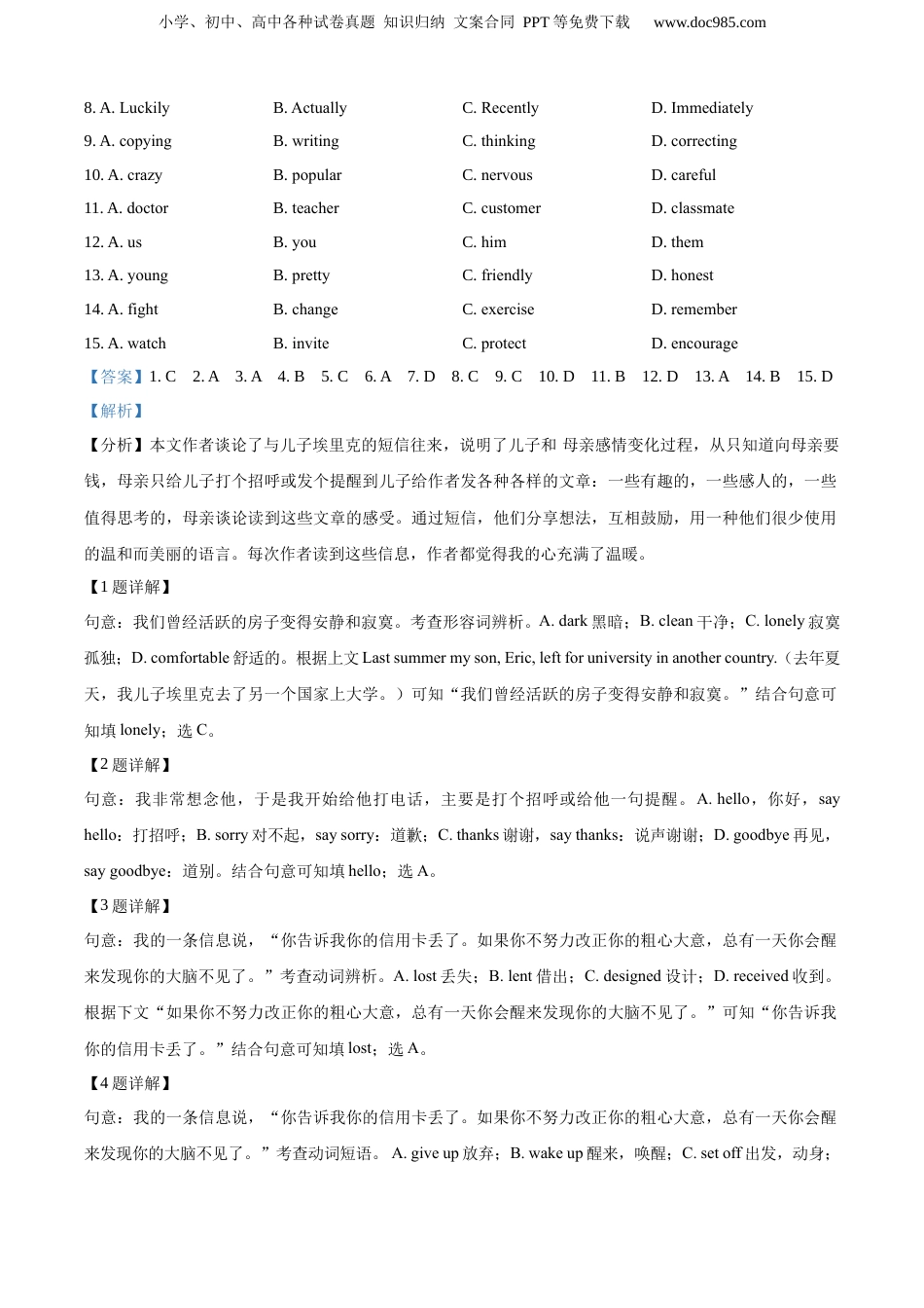 小学、初中、高中各种试卷真题知识归纳文案合同PPT等免费下载www.doc985.com2019年浙江省初中毕业生学业考试(嘉兴卷)英语试题卷一、完形填空阅读下面短文,然后从各题所给的四个选项中选出一个最佳答案。Lastsummermyson,Eric,leftforuniversityinanothercountry.Ouroncelivelyhousebecamequietand___1___.ImissedhimsomuchthatIstartedsendinghimmessagesonthephone,mainlytosay___2___ortogivehimawordofwarning.Oneofmymessagessays,“Soyoutoldmeyou___3___yourcreditcard(信用卡).Ifyoudon’ttryhardtomendyourcarelessways,onedayyou’ll___4___andfindyourbrainmissing.”IdidgetEric'smessages,butmostofthemwereabout___5___.Theywerenodifferentfromthenotesheusedtoleave___6___thewhiteboardwhenhewasathome.“Iboughtanewpairofshoes.Theycostme$90.Pleasehelp!”“Moneyisrunningshort___7___I’veboughtsomebooksformyresearchpaper.Helpmeplease!”___8___,however,Ericbeginstosendmeallkindsofarticles:somefunny,sometouchingandsomeworth___9___.Hesaystheywillhelpmeunderstandyoungmenbetterandkeepupwiththetimes.Ireadthearticlesslowly,likea___10___student,withmixedfeelingsaswell—mykid,whofollowedmearoundnotlongago,hasnowbecomemy___11___.SoIwriteback.“I’vereadallthosearticles.I’lltake___12___asalovingson’sexpectationstowardshismother.Hemustbethinkingthathismotherisstill___13___enoughtoacceptnewthings.Thatmakesmefeelproud.Whatweparentslack(缺乏)mostistheabilitytolearnand___14___,inbothbodyandmind.Thankyou,myson.”Inthiswayweshareideasand___15___eachother,withagentleandbeautifullanguageweseldomuse.EverytimeIreadthosemessages,Ifeelmyheartfilledwithwarmth.1.A.darkB.cleanC.lonelyD.comfortable2.A.helloB.sorryC.thanksD.goodbye3.A.lostB.lentC.designedD.received4.A.giveupB.wakeupC.setoffD.takeoff5.A.healthB.musicC.moneyD.safety6.A.onB.acrossC.behindD.opposite7.A.ifB.untilC.thoughD.because小学、初中、高中各种试卷真题知识归纳文案合同PPT等免费下载www.doc985.com8.A.LuckilyB.ActuallyC.RecentlyD.Immediately9.A.copyingB.writingC.thinkingD.correcting10.A.crazyB.popularC.nervousD.careful11.A.doctorB.teacherC.customerD.classmate12.A.usB.youC.himD.them13.A.youngB.prettyC.friendlyD.honest14.A.fightB.changeC.exerciseD.remember15.A.watchB.inviteC.protectD.encourage【答案】1.C2.A3.A4.B5.C6.A7.D8.C9.C10.D11.B12.D13.A14.B15.D【解析】【分析】本文作者谈论了与儿子埃里克的短信往来,说明了儿子和母亲感情变化过程,从只知道向母亲要钱,母亲只给儿子打个招呼或发个提醒到儿子给作者发各种各样的文章:一些有趣的,一些感人的,一些值得思考的,母亲谈论读到这些文章的感受。通过短信,他们分享想法,互相鼓励,用一种他们很少使用的温和而美丽的语言。每次作者读到这些信息,作者都觉得我的心充满了温暖。【1题详解】句意:我们曾经活跃的房子变得安静和寂寞。考查形容词辨析。A.dark黑暗;B.clean干净;C.lonely寂寞孤独;D.comfortable舒适的。根据上文Lastsummermyson,Eric,leftforuniversityinanothercountry.(去年夏天,我儿子埃里克去了另一个国家上大学。)可知“我们曾经活跃的房子变得安静和寂寞。”结合句意可知填lonely;选C。【2题详解】句意:我非常想念他,于是我开始给他打电话,主要是打个招呼或给他一句提醒。A.hello,你好,sayhello:打招呼;B.sorry对不起,saysorry:道歉;C.thanks谢谢,saythanks:说声谢谢;D.goodbye再见,saygoodbye:道别。结合句意可知填hello;选A。【3题详解】句意:我的一条信息说,“你告诉我你的信用卡丢了。如果你不努力改正你的粗心大意,总有一天你会醒来发现你的大脑不见了。”考查动词辨析。A.lost丢失;B.lent借出;C.designed设计;D.received收到。根据下文“如果你不努力改正你的粗心大意,总有一天...