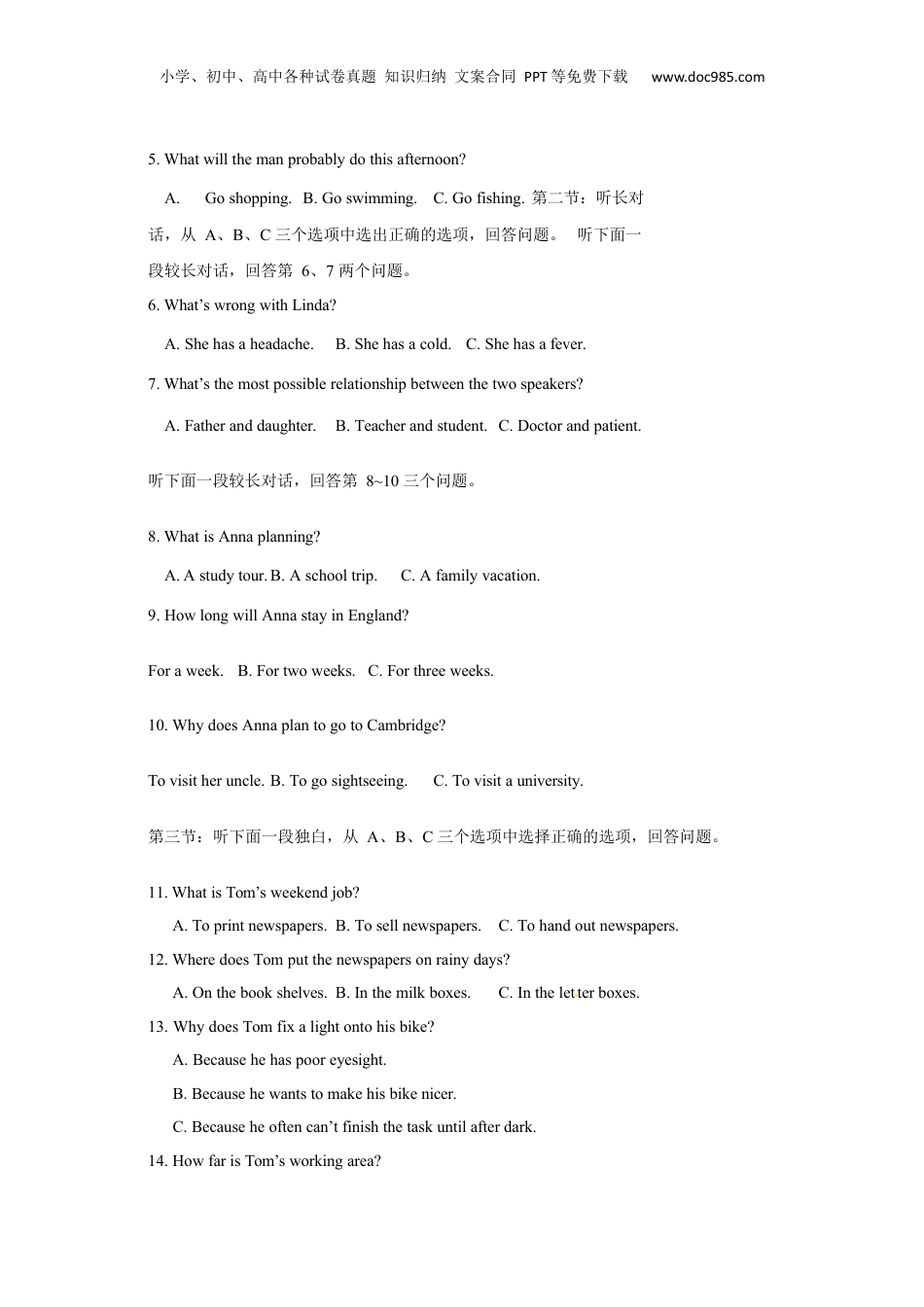 小学、初中、高中各种试卷真题知识归纳文案合同PPT等免费下载www.doc985.com考生须知:1.本试题卷分卷I(选择题)和卷II(非选择题)两部分。请考生使用规定用笔,将所有试题的答案涂、写在答题纸上。做在试题卷上无效。2.全卷共8页,7大题。满分为120分。考试时间为100分钟。温馨提示:答题前请仔细阅读答题纸上的“注意事项”。卷I注意:每小题选出答案后,用2B铅笔把答题纸上对应题目的答案标号涂黑,如需改动,用橡皮擦干净后,再选涂其他答案标号。一、听力(本题有15小题;第一节每小题1分,第二、三节每小题2分;共计25分)第一节:听小对话,从A、B、C三个选项中选出正确的选项,回答问题。1.Whatistheweatherlike?A.Sunny.B.Rainy.C.Cloudy.2.WhattimedoesSamgetuponweekends?A.At8:00.B.At9:00.C.At10:00.3.WheredoesDavidcomefrom?A.Canada.B.Britain.C.Australia.4.HowdidJackgettothecinema?A.Onfoot.B.Bycar.C.Bybus.小学、初中、高中各种试卷真题知识归纳文案合同PPT等免费下载www.doc985.com5.Whatwillthemanprobablydothisafternoon?A.Goshopping.B.Goswimming.C.Gofishing.第二节:听长对话,从A、B、C三个选项中选出正确的选项,回答问题。听下面一段较长对话,回答第6、7两个问题。6.What’swrongwithLinda?A.Shehasaheadache.B.Shehasacold.C.Shehasafever.7.What’sthemostpossiblerelationshipbetweenthetwospeakers?A.Fatheranddaughter.B.Teacherandstudent.C.Doctorandpatient.听下面一段较长对话,回答第8~10三个问题。8.WhatisAnnaplanning?A.Astudytour.B.Aschooltrip.C.Afamilyvacation.9.HowlongwillAnnastayinEngland?Foraweek.B.Fortwoweeks.C.Forthreeweeks.10.WhydoesAnnaplantogotoCambridge?Tovisitheruncle.B.Togosightseeing.C.Tovisitauniversity.第三节:听下面一段独白,从A、B、C三个选项中选择正确的选项,回答问题。11.WhatisTom’sweekendjob?A.Toprintnewspapers.B.Tosellnewspapers.C.Tohandoutnewspapers.12.WheredoesTomputthenewspapersonrainydays?A.Onthebookshelves.B.Inthemilkboxes.C.Intheletterboxes.13.WhydoesTomfixalightontohisbike?A.Becausehehaspooreyesight.B.Becausehewantstomakehisbikenicer.C.Becauseheoftencan’tfinishthetaskuntilafterdark.14.HowfarisTom’sworkingarea?小学、初中、高中各种试卷真题知识归纳文案合同PPT等免费下载www.doc985.comA.Closetohisschool.B.Closetohishome.C.Veryfarfromhishome.15.WhichwordcanbestdescribeTom?A.Lazy.B.Friendly.C.Hard-working.二、完形填空(本题有15小题;每小题1分;共计15分)阅读下面短文,掌握其大意,然后从每题所给的A、B、C、D四个选项中选出最佳选项。Itwasthesummerbeforemythirdgrade.Ourgirls’softballteamwasfacingrealpitchers(投球手)16thefirsttime.Beforethat,wecouldjusthittheballonthetee(球座).Whenthecoachstartedpitching,hittingbecame17forme.Imissedeverysinglepitch.Fromtheside,IheardmyteammateEmilylaughingat18.Myfacegothotandmythroatfeltlikeithadasoftballstuckin.Atthatmoment,Iwasstartingto19playingsoftball.Thenextafternoon,whenMumsaiditwastimetoplaythegame,ItoldherIwas20.Sheallowedmetoliedownforawhile.SoIwenttomyroomand21myselfinbed.ThiswasdifficultformebecauseIwasfineandjust22toavoidsoftball.SoonMumcameinandsaid,“Timetogo!”Shedidn’tevenaskifIfelt23.IimaginedEmilylaughingfromthesideline,and24Ireallydidfeelsicktomystomach.Ibegancryingloudly.Still,MumpulledmyteamT-shirtovermyhead.Shesaid,“Youhaveto25fortherestoftheseason,andonlyafterthatwecantalkabout26you’llcontinuenextyear.”SheaddedthatpracticewaswhatIneeded,not27.Shepromisedtopracticewithme.小学、初中、高中各种试卷真题知识归纳文案合同PPT等免费下载www.doc985.comIgottwohitsthatafternoon,andEmilydidn’tmakea28.Everyweekafterthat,Ipracticedathome29Igottobeoneofthebesthittersonthet...
