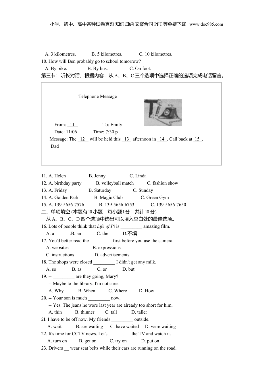 小学、初中、高中各种试卷真题知识归纳文案合同PPT等免费下载www.doc985.com浙江省嘉兴市、舟山市2013年中考英语试题卷I一、听力(本题有15小题,第一节每小题1分,第二、三节每小题2分;共计25分)第一节;听小对话,从A、B、C三个选项中选择符合对话内容的图片。1.Whatfruitdoesthegirllikebest?2.Wherearetheboy'ssocks?3.Whatclasswillthespeakershave?4.WhichmanisBetty'suncle?5.Whatarethespeakersgoingtodothisafternoon?第二节;听较长对话,回答问题。听下面一段较长的对话,回答第6~7两小题。6.WhendidKategotoHuangshanMountain?A.Lastyear.B.Lastmonth.C.Lastweek.7.Whatwastheweatherlikethere?A.Windy.B.Rainy.C.Sunny.听下面一段较长的对话,回答第8~l0三小题。8.Whoseisthebluebike?A.Ben's.B.Tina's.C.Henry's.9.HowfarisitfromBen'shometoschool?小学、初中、高中各种试卷真题知识归纳文案合同PPT等免费下载www.doc985.comA.3kilometres.B.5kilometres.C.10kilometres.10.HowwillBenprobablygotoschooltomorrow?A.Bybike.B.Bybus.C.Onfoot.第三节:听长对话,根据内容.从A、B、C三个选项中选择正确的选项完成电话留言。11.A.HelenB.JennyC.Linda12.A.birthdaypartyB.volleyballmatchC.fashionshow13.A.FridayB.SaturdayC.Sunday14.A.GoldenParkB.MagicClubC.GreenGym15.A.139-5656-7576B.139-5656-6753C.139-5656-7650二、单项填空(本题有l0小题.每小题l分;共计l0分)从A、B、C、D四个选项中选出可以填入空白处的最佳选项。16.LotsofpeoplethinkthatLifeofPiis_________amazingfilm.A.a.B.anC.theD.不填17.You'dbetterreadthe_________firstbeforeyouusethecamera.A.websitesB.expressionsC.instructionsD.advertisements18.Theshopswereclosed_________Ididn'tgetanymilk.A.soB.asC.orD.but19.--_________aretheygoing,Mary?--Maybetothelibrary,I'mnotsure.A.WhyB.WhenC.WhereD.How20.--Yoursonismuch_________now.--Yes.Thejeansheworelastyeararealreadytooshortforhim.A.thinB.thinnerC.tallD.taller2I.Ihavetobeoffnow.Myfriends_________outside.A.waitB.arewaitingC.havewaitedD.werewaiting22.It'stimeforCCTVnews.Let's_________theTVandwatchit.A.turnonB.getonC.tryonD.puton23.Drivers__wearseatbeltswhiletheircarsarerunningontheroad.TelephoneMessageFrom:11To:EmilyDate:11/06Time:7:30pMessage:The12willbeheldthis13afternoonin14.Callbackat15.Dad小学、初中、高中各种试卷真题知识归纳文案合同PPT等免费下载www.doc985.comA.needB.canC.mustD.may24.--I’mnewhere.--Don'tworry.I’lldowhatIcan_________you.A.helpB.tohelpC.inviteD.toinvite25.--YouwonthefirstprizeintheEnglishcompetition?--____________IalwaysfailinEnglishtests.A.Whynot?B.Goodidea!C.Soundsgreat!D.You'rekidding!三、完形填空(本题有l5小题,每小题l分;共计l5分)阅读下面短文,掌握大意,然后从A、B、C、D四个选项中选出最佳选项。Recently,areaderaskedmeaboutthedangersthatpetscanlacearoundthehouse.So,Ivisitedmylocalanimal26lastweekendandgotsomeadvicetoshareabouthowwecanmakeourhomes27forourpets.WhenIarrived,severalpetsandtheir28wereinthewaitingroom.Mr.Smith,withacat,chattedwithme."Mycatwillbe29foranuncomfortablestomachinaminute,"hesaid."Mychildrengave30abowlofmilk.However,ifsheisgivenmilk,shewillgetastomachache.”Justthen,thevet(兽医)walkedovertous.“Yes,Mr.Smithis31.Onlyafewpeopleknowthis,butmilkmustn'tbefedtocats32somecatscan'ttakeitineasily,"thevetsaid."Otherhumanfoodsarebadforpets33.Forexample,ifadogeatschocolate,itwillbecome34."Iaskedthevetwhatother35thereareforpetsaroundthehouse."Well,”shereplied,“weshouldnot36smallthings,suchasbatteries,lyingaroundastheycanbeeatenbypets.Lastmonth,asmallcatwasbrought37becauseithadeatenabuttonwhichwasonthefloorwithoutbeingnoticed."Befo...