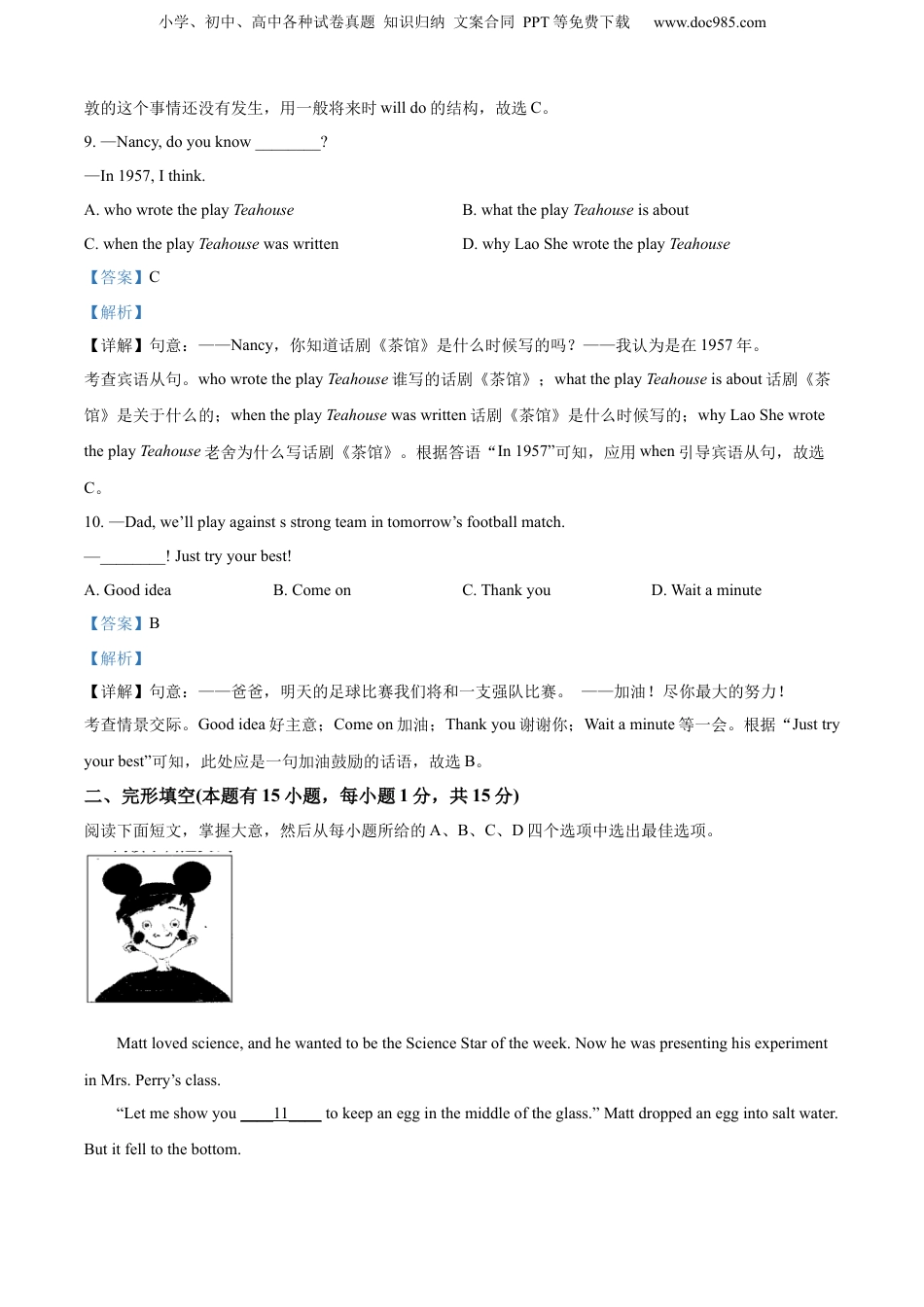 小学、初中、高中各种试卷真题知识归纳文案合同PPT等免费下载www.doc985.com英语一、单项填空(本题有10小题,每小题1分,共10分)请从A、B、C、D四个选项中选出可以填入空白处的最佳答案。1.BenwatchedTomandJerryyesterday.________cartoonmadehimlaugh.A.AB.AnC.TheD./【答案】C【解析】【详解】句意:本昨天看了《汤姆和杰瑞》。这部卡通片使他笑了。考查冠词辨析。此空特指前文提到的《汤姆和杰瑞》这部卡通片,用冠词the表特指,故选C。2.Everybody,pleasekeep________.It’snotallowedtomakeanynoiseinthereadingroom.A.fitB.warmC.dryD.quiet【答案】D【解析】【详解】句意:请大家保持安静。在阅览室里不允许制造任何噪音。考查形容词辨析。fit健康的;warm暖和的;dry干燥的;quiet安静的。根据“It’snotallowedtomakeanynoiseinthereadingroom”可知,不允许制造噪音,要保持安静,故选D。3.—Jack,Ihavenoideaforthereport.—Meneither.Whydon’tweasktheteacherfor________?A.helpB.jokesC.foodD.tickets【答案】A【解析】【详解】句意:——Jack,我对这份报告没有什么想法。——我也没有。我们为什么不向老师求助呢?考查名词辨析。help帮助;jokes玩笑;food食物;tickets票。根据“Ihavenoideaforthereport”及“Whydon’tweasktheteacherfor”可知,两个人对于报告都没有想法,所以建议向老师寻求帮助,故选A。4.Therewasastormyesterday.________,mostoftheflowersinmygardenarestillalive.A.ClearlyB.LuckilyC.SuddenlyD.Firstly【答案】B【解析】【详解】句意:昨天有一场暴风雨。幸运的是,我花园里的大部分花都还活着。考查副词辨析。Clearly清楚地;Luckily幸运地;Suddenly突然;Firstly首先。根据“mostoftheflowersinmygardenarestillalive”可知在暴风雨后花大部分都还活着,这是幸运的。故选B。小学、初中、高中各种试卷真题知识归纳文案合同PPT等免费下载www.doc985.com5.—Thomas,wherearemypostcards?I________findthem.—They’reonthebookshelf.A.can’tB.needn’tC.mustn’tD.shouldn’t【答案】A【解析】【详解】句意:——Thomas,我的明信片在哪里?我找不到它们。——它们在书架上。考查情态动词辨析。can’t不能;needn’t不必;mustn’t禁止;shouldn’t不应该。根据“wherearemypostcards”及“I…findthem”可知,不能找到明信片,故选A。6.—Mum,mayIhavemorechocolate?—You’dbetternot________toomuchsweetfoodisbadforhealth.A.untilB.whileC.althoughD.because【答案】D【解析】【详解】句意:——妈妈,我可以再多点巧克力吗?——你最好不要,因为太多的甜食对你的健康不好。考查连词辨析。until直到;while当……时;although尽管;because因为。根据“You’dbetternot…toomuchsweetfoodisbadforhealth”可知,空格后是在解释不能多吃甜食的原因,用because引导原因状语从句,故选D。7.InChina,peopleusually________theirhousestosweepawaybadluckbeforeSpringFestival.A.cleanupB.lookupC.makeupD.putup【答案】A【解析】【详解】句意:在中国,人们通常在春节前打扫房子,把坏运气扫走。考查动词短语辨析。cleanup打扫;lookup查询;makeup编造;putup张贴。根据“theirhousestosweepawaybadluckbeforeSpringFestival”及常识可知,在春节前打扫房子,把坏运气扫走,故选A。8.—Lydia,haveyoudecidedwhichcitytotravelto,LondonorNewYork?—Notyet.MaybeI________Londontomeetmyfriendsthistime.A.visitB.visitedC.willvisitD.wasvisiting【答案】C【解析】【详解】句意:——Lydia,你决定去哪个城市旅行了吗,伦敦还是纽约?——还没有。也许我这次会去伦敦见我的朋友。考查动词时态。根据“haveyoudecidedwhichcitytotravelto,LondonorNewYork”及“Notyet”可知,去伦小学、初中、高中各种试卷真题知识归纳文案合同PPT等免费下载www.doc985.com敦的这个事情还没有发生,用一般将来时willdo的结构,故选C。9.—Nancy,doyouknow________?—In1957,Ithink.A.whowrotetheplayTeahouseB.whattheplayTeahouseisaboutC.when...