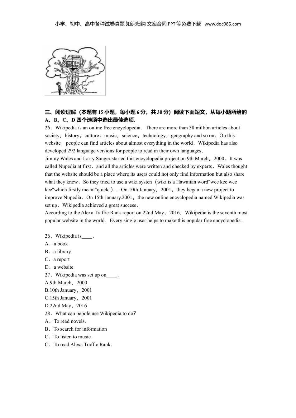 小学、初中、高中各种试卷真题知识归纳文案合同PPT等免费下载www.doc985.com2016年浙江省温州市中考英语试卷一、单项填空(本题有10小题,每小题1分,共10分)请从A、B、C、D四个选项中选出可以填入空白处的最佳答案.1.Jennyhasasweettooth.Let'smakesomecookiesfor()A.meB.himC.herD.them2.﹣Ican'tbelieveit.Tonyhasinventedatreeplantingmachine﹣.﹣Really?Heisso()A.shyB.rudeC.creativeD.friendly3.Hearingthegoodnews,Bettylaughedandranoutoftheclassroom()A.sadlyB.quietlyC.angrilyD.excitedly4.Whenanearthquakehappens,Ithinkthemostimportantsafety_____istokeepcalm()A.ruleB.doubtC.conditionD.problem5.﹣DoyouknowthattheTerracottaArmyinChinaismorethan2,000yearsold?﹣Wow!____!()A.HowlargeitisB.HowmodernitisC.WhatalonghistoryithasD.Whatabeautifulplaceitis6.﹣WelcometoLosAngeles.Haveyoueverbeenhere?﹣Sure.Ivisitedthiscitythreeyearsagosothisismy____timehere.()A.firstB.secondC.thirdD.fourth7.Althoughhesufferedalotfromhisfootproblem,____couldstophimfromfinishingtherace()A.nothingB.somethingC.anythingD.everything8.Istillremembermyhappychildhoodwhenmymother____metoDisneylandatweekends()A.takesB.tookC.willtakeD.hastaken9.Viennaisfamousforhavingmanygreatmusicians.____,JohannStrausstheyoungerwrotehundredsofwonderfulpiecesofmusicthere.()A.InfactB.ForexampleC.AsaresultD.Inmyopinion10.﹣Mum,Idon'thaveanybodytoplaywith.CanIhaveapet?﹣____Ourapartmentistoosmall.()A.Whynot?B.Ihopeso.C.Anythingelse?D.I'mafraidnot.二、完形填空(本题有15小题,每小题15分,共15分),阅读下面短文,掌握大意,然后从每题所给的A、B、C、D四个选项中选出最佳选项.11.Andywokeupandlookedattheclock.11:30?Hejumpedoutofbedandthrewonclothes.HehadwantedtogetupearlyandsurprisehisdadwithFather'sDaybreakfastinbed﹣小学、初中、高中各种试卷真题知识归纳文案合同PPT等免费下载www.doc985.comwithhismom'shelpofcourse.Hetookupthewrappedpresentonhisdeskandwenttofindhis(11)."WhereisDad?"Andycheckedalltherooms,butthewholehousewasempty.Hewalkedouttothe(12),andhisjawdropped.Dadwasholdingahammerandlookingatanewtreefortthatstoodin(13)bigbackyard.Andyclimbedtheropeladderuptothefort.Ithadtworoomswiththreesmallwindows.DadfollowedAndyintothefort,lookingexcited."Ispentallmorning(14)it.IhadonewhenIwasyourage.GrandpasurprisedmewithitonFather'sDay,too.""So,it'slikea(n)(15)?"Andyasked."Yes,thisisapresentfor(16)ofus.Maybeyou'llbuildoneforyoursononeday."DadlookedaroundandaskedAndy(17)theywoulddofirstinthetreefort.Andyslowlyshowedthe(18)andsaid,"HappyFather'sDay!"Hedidn'tthinkitwaspossible,(19)Dad'ssmilewidenedasheopenedthegift."Achessset!HowdidyouknowIwanted(20)?"Andyalwayssawhisdadplayingagainstthecomputerandheguessedit(21)behisfather'sfavorite."Let'splayit!"Dadsetupthechessboard."It'sthe(22)giftIgotofallthisFather'sDay.""I'mgladyoulikeit."Andysaid."Ido,butIwastalkingaboutspendingmoretimewithyou.I(23)lovedthefatherson﹣time.IspentalotwithyourgrandfatherwhenIwas(24)."Andylookedathisdad."CanwecallGrandpaand(25)himtocometothefort?"DadsqueezedAndy'sshoulder."Ithinkhe'dlovethat."Thatday,thethreemenplayed,talkedandlaughed.ItwasreallyahappyFather'sDay.11.A.sisterB.brotherC.fatherD.mother12.A.yardB.parkC.kitchenD.bathroom13.A.myB.ourC.yourD.their14.A.buyingB.buildingC.cleaningD.repairing15.A.planB.hab...