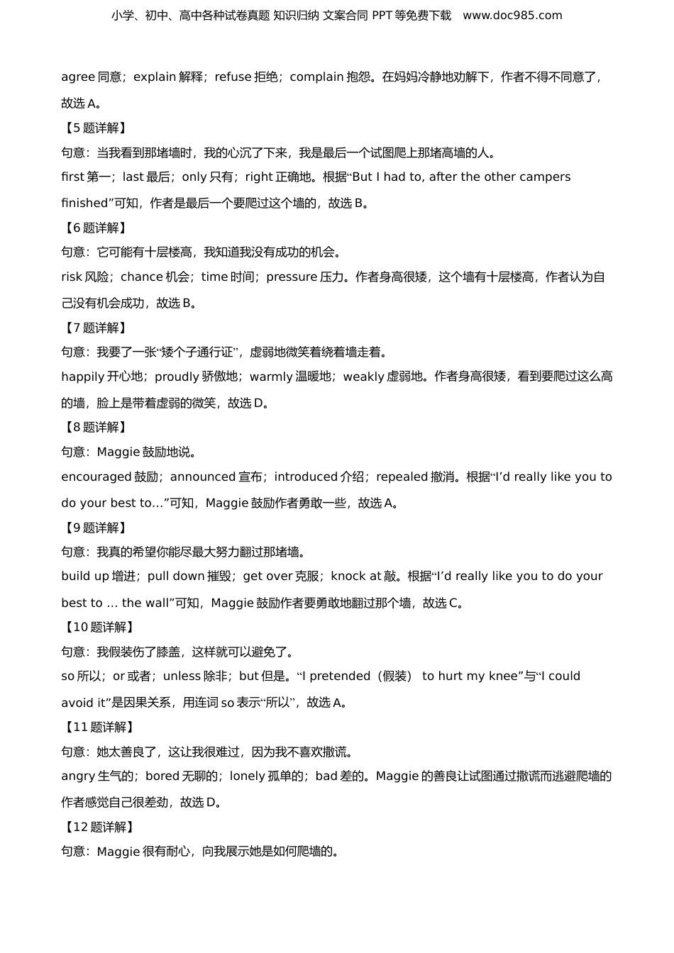 小学、初中、高中各种试卷真题知识归纳文案合同PPT等免费下载www.doc985.com2021年浙江省初中毕业升学考试(台州卷)第二部分笔试部分二、完形填空(本题有15小题,每小题1分,共计15分)阅读下面短文,掌握大意,然后从每题所给的A、B、C、D四个选项中选出最佳选项。ThesummerIturned12,Iwishedtogrowupmorequickly.Summercampwascoming.andIwassoworriedaboutmy___1___thatI’dgottenintoabigargumentwithmymom.“ButI’ll___2___it!”Icried.Iwascertainthateveryonewouldseemeasnothingmorethan“theshortgirl”.“Youwon’tknowanything___3___yougetthere,”calmedmymom.AndIhadto___4___.OnMonday,myteacherMaggietoldusabouttheclimbingcourse,andmyheartsankwhenIsawthewallIwasthe___5___onetotrytoclimbthathugewall.Itmighthavebeentenfloorshigh,andknewthatIhadno___6___tosucceed.ButIhadto,aftertheothercampersfinished.Iaskedfora“shortperson’spass,”smiling___7___andwalkingaroundthewall.“Youknow.Amy,whatthemindcanbelieve,theheartcanachieve.”___8___Maggie.“I’dreallylikeyoutodoyourbestto___9___thewall.”Ipretended(假装)tohurtmyknee___10___Icouldavoidit.“How’stheknee?Doesithurtalot?”Maggieasked.Shewassokind,whichmademefeel___11___becauseIdidn’tliketolie.Maggiewasreallypatient,showingme___12___sheclimbedthewall.Andsomecampersweretherecheeringforme.Ididn’twantto___13___anymore,andIdidn’twanttogiveupagain.Icouldseehowmucheveryonebelievedinme,andIwantedtoshowthemhowmuchIvaluedtheir___14___,soIkepttrying.Andthensomething___15___happened—Imadeit!“Whatthemindcanbelieve,theheartcanachieve,”Maggieremindedme.AndthistimeIknewitwastrue.1.A.hairB.buildC.heightD.weight小学、初中、高中各种试卷真题知识归纳文案合同PPT等免费下载www.doc985.com2.A.acceptB.beatC.hateD.manage3.A.ifB.afterC.whenD.until4.A.agreeB.explainC.refuseD.complain5.A.firstB.lastC.onlyD.right6.A.riskB.chanceC.timeD.pressure7.A.happilyB.proudlyC.warmlyD.weakly8.A.encouragedB.announcedC.introducedD.repealed9.A.buildupB.pulldownC.getoverD.knockat10.A.soB.orC.unlessD.but11.A.angryB.boredC.lonelyD.bad12.A.howB.whenC.whereD.why13.A.tryB.lieC.practiceD.compete14.A.dreamB.decisionC.supportD.success15.A.funnyB.creativeC.popularD.amazing【答案】1.C2.C3.D4.A5.B6.B7.D8.A9.C10.A11.D12.A13.B14.C15.D【解析】【分析】本文主要讲述了作者因为身高很矮,在参加夏令营时,不敢爬过高墙,在Maggie和同伴的鼓励下,她勇敢地做到了。【1题详解】句意:我非常担心我的身高,以至于和妈妈大吵了一架。hair头发;build体格;height身高;weight“体重。根据theshortgirl”可知,作者担心自己的身高问题,故选C。【2题详解】句意:但我会讨厌它。accept接受;beat击败;hate讨厌;manage管理。对于自己身高很矮这件事感到厌烦,故选C。【3题详解】句意:你到那之前什么都不会知道。if如果;after在……之后;when当……时;until“直到。根据Youwon’tknowanything…yougetthere,”可知,此处用not…until“表示直到……”才,故选D。【4题详解】句意:我不得不同意。小学、初中、高中各种试卷真题知识归纳文案合同PPT等免费下载www.doc985.comagree同意;explain解释;refuse拒绝;complain抱怨。在妈妈冷静地劝解下,作者不得不同意了,故选A。【5题详解】句意:当我看到那堵墙时,我的心沉了下来,我是最后一个试图爬上那堵高墙的人。first第一;last最后;only只有;right“正确地。根据ButIhadto,aftertheothercampersfinished”可知,作者是最后一个要爬过这个墙的,故选B。【6题详解】句意:它可能有十层楼高,我知道我没有成功的机会。risk风险;chance机会;time时间;pressure压力。作者身高很矮,这个墙有十层楼高,作者认为自己没有机会成功,故选B。【7题详解】“”句意:我要了一张矮...
