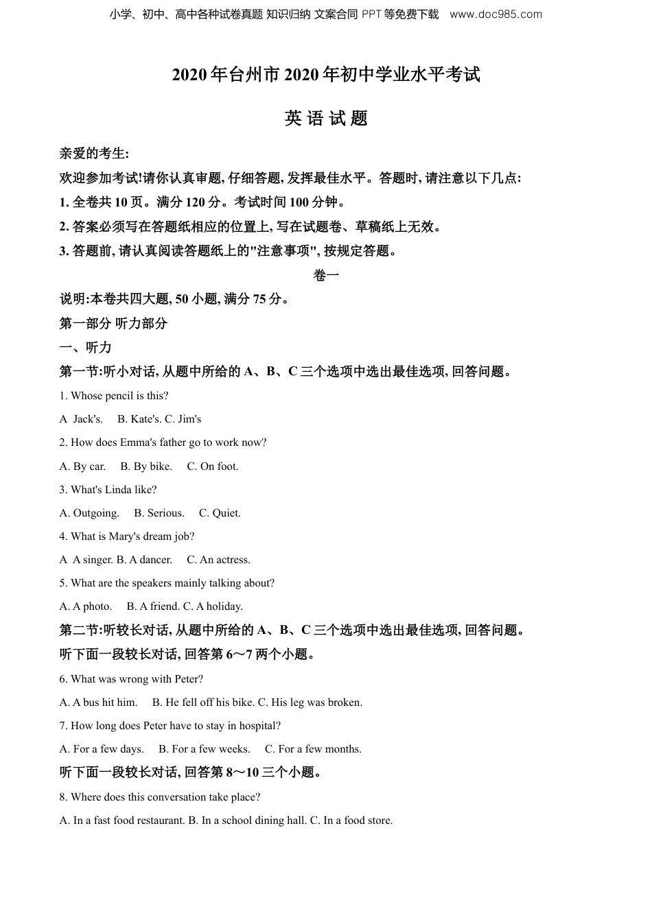 小学、初中、高中各种试卷真题知识归纳文案合同PPT等免费下载www.doc985.com2020年台州市2020年初中学业水平考试英语试题亲爱的考生:欢迎参加考试!请你认真审题,仔细答题,发挥最佳水平。答题时,请注意以下几点:1.全卷共10页。满分120分。考试时间100分钟。2.答案必须写在答题纸相应的位置上,写在试题卷、草稿纸上无效。3.答题前,请认真阅读答题纸上的"注意事项",按规定答题。卷一说明:本卷共四大题,50小题,满分75分。第一部分听力部分一、听力第一节:听小对话,从题中所给的A、B、C三个选项中选出最佳选项,回答问题。1.Whosepencilisthis?A.Jack's.B.Kate's.C.Jim's2.HowdoesEmma'sfathergotoworknow?A.Bycar.B.Bybike.C.Onfoot.3.What'sLindalike?A.Outgoing.B.Serious.C.Quiet.4.WhatisMary'sdreamjob?A.Asinger.B.Adancer.C.Anactress.5.Whatarethespeakersmainlytalkingabout?A.Aphoto.B.Afriend.C.Aholiday.第二节:听较长对话,从题中所给的A、B、C三个选项中选出最佳选项,回答问题。听下面一段较长对话,回答第6~7两个小题。6.WhatwaswrongwithPeter?A.Abushithim.B.Hefelloffhisbike.C.Hislegwasbroken.7.HowlongdoesPeterhavetostayinhospital?A.Forafewdays.B.Forafewweeks.C.Forafewmonths.听下面一段较长对话,回答第8~10三个小题。8.Wheredoesthisconversationtakeplace?A.Inafastfoodrestaurant.B.Inaschooldininghall.C.Inafoodstore.小学、初中、高中各种试卷真题知识归纳文案合同PPT等免费下载www.doc985.com9.Whatdoesthemanorder?A.Acake;FrenchfriesandcoffeeB.Ahamburger,apizzaandjuiceC.Ahamburger,Frenchfriesandcoffee10.Howmuchdoesthemealcosttheman?A.Only90cents.B.Twodollars.C.Nearlythreedollars.第三节:听独白,从题中所给的A、B、C三个选项中选出最佳选项,回答问题。11.Whatdoesthespeakerintroduce?A.Thepreparationsforeachlistener.B.Theplanfortheceremony.C.Themenuforthemeals.12.Whatwillthelistenersdoassoonaspossible?A.Finishthepreparations.B.Sharetheirexperiences.C.Singsong13.WhowillgiveaspeechinthebeginningnextSundayafternoon?A.Theheadteacher.B.Thespeaker.C.Thelisteners.14.Whenwillmealsbeservedaccordingtothespeaker?A.At4:30p.m.B.At4:45p.m.C.At5:30p.m.15.Wherecanthelistenersfindthespeakeriftheyhavequestions?A.Intheclassroom.B.IntheofficeC.Intheceremonyhall.第二部分笔试部分二、完形填空阅读下面短文,掌握大意,然后从每题所给的A、B、C、D四个选项中选出最佳选项。Luke'sfatherisafarmer.Insteadofcows,pigs,andhorses,thereiscorn,beans,strawberriesandtomatoesaroundhishouse.Lukedoesn'tmindthatthereareno___1___.Infact,helikeslivingafruit-and-vegetablefarmmuchbetter.Hefeelsit'smagicalthathisvegetableto___2___somethingintheplacewherethereusedtobenothing."I’mplanting___3___today,son."Luke'sfathersaid."Theygrowbestinhotsummerheat,___4___Ineed小学、初中、高中各种试卷真题知识归纳文案合同PPT等免费下载www.doc985.comtoplantthemearlyinspring.Thatwaytherewillbetall,healthytomatovines(藤)onceAugustarrives.""Howdoyou___5___theygrowtallandhealthy?"Lukeasked."Thevinesgrowstrongwhenyougivethemcareandattentionandhavealittlebitofhope,"hisfatherlaughed."CanIhelp?"Lukebegged."Ofcourse!"saidhisfatherSowhenLukewas___6___,hehelpedhisfatherandLukelearnedthatatomatoplantdoesneedmuch___7___.HespentonewholedayintheearlyJunesun,hittingwoodensticksintothegroundbyyoungtomatoplant.Afterthetomatovineshadgrownalittletaller,Luke___8___thetomatovinestothestickssothattheywouldnotfallover."Thetomatoes___9___needalotofattention!",Lukesaidonelateafternoon."Most____10____thingsdorequirealotofattention,Luke,"repliedhisfatherwithasmile."Whatdoyoumean?"askedLuke."Well,"hisfathersaid."Weshouldpaycloseattentiontothingsthatmakeourlives...