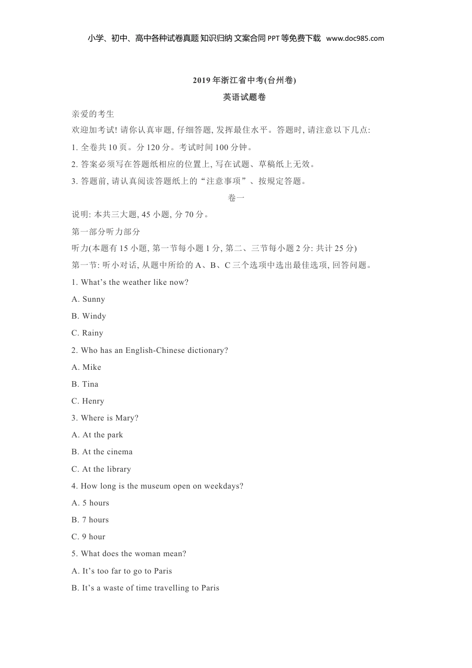 小学、初中、高中各种试卷真题知识归纳文案合同PPT等免费下载www.doc985.com2019年浙江省中考(台州卷)英语试题卷亲爱的考生欢迎加考试!请你认真审题,仔细答题,发挥最住水平。答题时,请注意以下几点:1.全卷共10页。分120分。考试时间100分钟。2.答案必须写在答题纸相应的位置上,写在试题、草稿纸上无效。3.答题前,请认真阅读答题纸上的“注意事项”、按規定答题。卷一说明:本共三大题,45小题,分70分。第一部分听力部分听力(本题有15小題,第一节每小题1分,第二、三节每小题2分:共计25分)第一节:听小对话,从题中所给的A、B、C三个选项中选出最佳选项,回答问题。1.What’stheweatherlikenow?A.SunnyB.WindyC.Rainy2.WhohasanEnglish-Chinesedictionary?A.MikeB.TinaC.Henry3.WhereisMary?A.AttheparkB.AtthecinemaC.Atthelibrary4.Howlongisthemuseumopenonweekdays?A.5hoursB.7hoursC.9hour5.Whatdoesthewomanmean?A.It’stoofartogotoParisB.It’sawasteoftimetravellingtoParis小学、初中、高中各种试卷真题知识归纳文案合同PPT等免费下载www.doc985.comC.ShesupportsthemanintravellingtoParis.第二节:听较长对话,从题中所给的A、B、C三个选项中选出最佳选项,回答问题。听下面一段较长对话,回答第6、7两个小题6.Whydoesthemanlikehisjob?A.Becausehethinksitisachallengingjob.B.Becausehelikestravellingaroundtheworld.C.Becausehelikesteachinghistoryintheuniversity.7.Whatdoesthewomando?A.Atourguide.B.Ahistoryteacher.C.Auniversitystudent.听下面一段较长对话,回答第8~10三个小题。8.Whatiswrongwiththewoman?A.ShehasafeverB.ShehasaheadacheC.Shehasasleepingproblem.9.Whatdidthewomandolastnight?A.Shewenttobedearly.B.Sheattendedaparty.C.Shepreparedforameeting.10.Whatdoesthemanaskthewomantodo?A.Havearest.B.Takesomemedicine.C.Changethejob.第三节:听独白,从题中所给的A、B、C三个选项中选出最佳选项,回答问题11.WhywillthespeakergotoLondon?A.Tovisitheruncle.B.Towatchanartshow.C.Tocelebrateherdad’sbirthday.12.HowwilltheygotoLondon?A.Byair.小学、初中、高中各种试卷真题知识归纳文案合同PPT等免费下载www.doc985.comB.Bybus.C.Bytrain.13.WherearetheygoingonFridayafternoon?A.LondonBridge.B.TheDesignMuscum.C.TheLondonEye.14.WhenaretheygoingtoHarrod’s?A.OnFriday.B.OnSaturday.C.OnSunday.15.Whatdoesthespeakerprobablythinkofthecomingvacation?A.Boring.B.Exciting.C.Tiring听力解析略第二部分笔试部分二、完形填空(本题有15小题,每小题1分;共计15分)阅读下面短文,掌握大意,然后从每题所给的A、B、C、D四个选项中选出最佳选项。Haveyouevereatenadandelion(蒲公英)?Meneither.Haveyoueverblownittomakeawish?Me,too.“Timetopickdandelions,Athena,"MumopenedthecardoorandIenteredwitha16.MyhometownisinGreece(希腊),wheredandelionsare17onthemenu.ButIdidn’teatdandelions.WhydidIhaveto18themwithmyfamilyeveryspring?ThenIsaidgoodbyetomynewfriendBrigid,whosefamilyhad19movedinourneighborhoodinNewYork.Iwas20Brigiddidn’taskwhereweweregoing.NobodyinAmericaatedandelions.Ialwaysworriedthat21wouldnoticeuspickingdandelions.We22intoawildfield.Hundredsoflivelyyellowflowersappearedeverywhere.Thenwe小学、初中、高中各种试卷真题知识归纳文案合同PPT等免费下载www.doc985.comstoppedourcar.Dadwentovertocutdandelionsandputtheminhisbag.ButIjusthidinthebook."23dowecatdandelions?"Iasked."Thebestfoodintheworld."Dadanswered,shakingahandfulofgreens.24wewerereadytoleave,wehadenoughdandelions.Onthewayhome,MumandDadtalkedabouthostingadinnerpartyforthenewneighborstotryour25Greekfood.Thenightoftheparty,Brigidarrivedwithherparents.Mumserved26different。Greekfoods.Ourguestsateeverything.Finallycamethedandelions."Wait!"IsaidtoBrigid.Butitwastoo27."Youatethedandelions!"It...