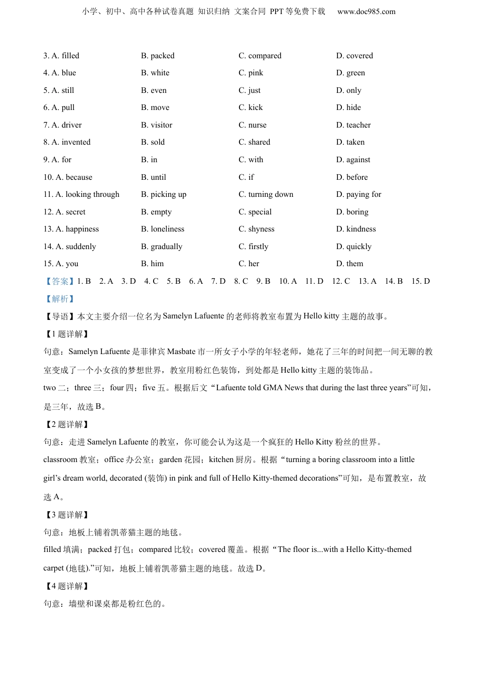 小学、初中、高中各种试卷真题知识归纳文案合同PPT等免费下载www.doc985.com英语试卷Ⅰ(选择题共70分)(一)听力部分(共25分)一、听力(本题有15小题,第一节每小题1分,第二、三节每小题2分,共计25分)第一节:听小对话,回答问题。1.WhatdoesthewomanaskMikefor?A.Hisbag.B.Hismobilephone.C.Hisball.2.HowdoesthegirlfeelaboutAlex?A.Funny.B.Serious.C.Clever.3.Whocanplaychess?A.Marie.B.Joe.C.Sam.4.Whatarethespeakersmainlytalkingabout?A.Emily’sphoto.B.Emily’suniversity.C.Emily’splan.5.Wheredoestheconversationprobablytakeplace?A.Onthetrain.B.Inthestreet.C.Atthewoman’shome.第二节:听较长对话,回答问题。听下面一段对话,回答第6-7小题。6.Howistheweather?A.Cloudy.B.Windy.C.Sunny.7.Whatwillthegirldofirst?A.Goforawalk.B.Finishherletter.C.Visitthepark.听下面一段对话,回答第8-10小题。8.Whenisthespeechcompetition?A.Tomorrow.B.Nextweek.C.Nextmonth.9.WhydoesBettythinkshemaylosethecompetition?A.Becausesheisshybeforelargegroups.B.Becauseshecan’twriteagoodspeech.C.Becauseshehasnotimetoprepare.10.WhatdoesBetty’sfatheradvisehertodo?A.Toaskteachersforhelp.B.Tohaveagoodrest.C.Topracticealot.第三节:听独白,回答问题。11.WheredoesKatecomefrom?A.China.B.Japan.C.Australia.12.WhatdoesKatethinkofSydney?A.Busy.B.Interesting.C.Cool.13.WhoisKatestayingwith?A.Herteachers.B.Herhostfamily.C.Herclassmates.小学、初中、高中各种试卷真题知识归纳文案合同PPT等免费下载www.doc985.com14.HowoftendoesKategotoherlanguageschool?A.Fivedaysaweek.B.Fourdaysaweek.C.Threedaysaweek.15.WhatcanwelearnfromKate’sintroduction?A.KateisasoldasJack.B.Katehasbeentomanycountries.C.KatethinksitfuntotalkinEnglish.(二)笔试部分(共45分)二、完形填空(本题有15小题,每小题1分,共计15分)阅读下面短文,然后从各题所给的四个选项中选出一个最佳答案。SamelynLafuente,ayoungteacherfromaprimaryschoolforgirlsinMasbateCity,Philippines,spentthelast____1____yearsturningaboringclassroomintoalittlegirl’sdreamworld,decorated(装饰)inpinkandfullofHelloKitty-themeddecorations.WalkingintoSamelynLafuente’s____2____,youwouldprobablythinkthatitisacrazyHelloKittyfan’sworld.Theflooris____3____withaHelloKitty-themedcarpet(地毯).Thewallsareall____4____,asaretheschooldesks.AndthereareHelloKittydecorationseverywhere,hangingfromtheceiling(天花板),stuckonthewallsand____5____inthewindows.ItwouldbehardforparentsoflittlegirlsinMs.Lafuente’sclassto____6____themawayfromthisamazingworldinpinkeveryday,whichisjustwhatthe____7____plannedallalongtocreateaplacewhereherstudentswouldbehappyandenjoytheirtimeatschool.PhotosofthispinkHelloKittyclassroomwere____8____ontheInternetbyGlayFrancoBacolod,andquicklyspread____9____severalAsiancountries,includingChina.PeoplearepraisingSamelynLafuentehighly____10____shetriedhardtomakesureofthehappinessoftheyoungstudents,evenifitmeant____11____everythingoutofherownpocket.Theteachersaidthatalmostallthedecorationsinher____12____classroomwereboughtwithherownmoney,butseeingthe____13____inthechildren’seyeseverydaymakesitallworthit.LafuentetoldGMANewsthatduringthelastthreeyears,she____14____addedmorepinkandnewdecorationstochangeherclassroom.“I’mdoingitformystudents.Ilove____15____,”theteachersaid.1.A.twoB.threeC.fourD.five2.A.classroomB.officeC.gardenD.kitchen小学、初中、高中各种试卷真题知识归纳文案合同PPT等免费下载www.doc985.com3.A.filledB.packedC.comparedD.covered4.A.blueB.whiteC.pinkD.green5.A.stillB.evenC.justD.only6.A.pullB.moveC.kickD.hide7.A.driv...
