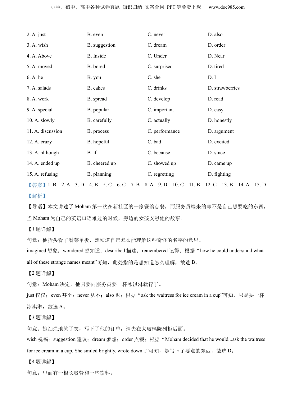小学、初中、高中各种试卷真题知识归纳文案合同PPT等免费下载www.doc985.com英语试卷Ⅰ(选择题共70分)(一)听力部分(共25分)一、听力(本题有15小题,第一节每小题1分,第二、三节每小题2分,共计25分)第一节:听小对话,回答问题。1.Whotookthephoto?A.Theboy.B.Thegirl.C.Thegirl’ssister.2.WheredoesKerrycomefrom?A.TheUK.B.Australia.C.TheUSA.3.WhydoesBettylooksoweak?A.Becausesheisill.B.Becauseshehashadatest.C.Becauseshewenttobedlatelastnight.4.Whatarethespeakersmainlytalkingabout?A.Cathy’sjobinterview.B.Cathy’sclothes.C.Cathy’sschool.5.What’stherelationshipbetweenthetwospeakers?A.Doctorandpatient.B.Waiterandcustomer.C.Teacherandstudent.第二节:听较长对话,回答问题。听下面一段对话,回答下列小题。6.WhenwillHelenstartfromhometomorrowmorning?A.Atthree.B.Atfour.C.Atfive.7.WhatdocsJamesmean?A.HewillsendHelentotheairport.B.HewillcalltowakeHelenup.C.HewillalsogotoParis.听下面一段对话,回答下列小题。8.WheredoesMikeworkinAfrica?A.Inahospital.B.Inaschool.C.Ataradiostation.9.Whocooksmealseveryday?A.Carol.B.Mike.C.Jim.10.HowdoesMikefeelaboutbeinginAfrica?A.Happy.B.Upset.C.Lucky.第三节:听独白,回答问题。11.HowwillthetouriststravelaroundLondon?A.Bybus.B.Onfoot.C.Byboat.小学、初中、高中各种试卷真题知识归纳文案合同PPT等免费下载www.doc985.com12.What’stheweatherlikeatpresent?A.Cloudy.B.Sunny.C.Rainy.13.Howlongdoesthetourlast?A.Twohours.B.Threehours.C.Fivehours.14.Whichwillthetouristsseefirst?A.BigBen.B.OxfordStreet.C.TowerBridge.15.WhatcantouristsdonearthePalace?A.Enjoythewholecity.B.Dosomeshopping.C.Drinkafreecoffee.(二)笔试部分(共45分)二、完形填空(本题有15小题,每小题1分,共计15分)阅读下面短文,然后从各题所给的四个选项中选出一个最佳答案。ItwasthefirsttimeMohamwenttoarestaurantinhisnewneighborhood.Helookedupatthemenuboard,and____1____howhecouldunderstandwhatallofthesestrangenamesmeant.Mohamdecidedthathewould____2____askthewaitressforicecreaminacup.Shesmiledbrightly,wrotedownhis____3____anddisappearedbehindthebigglassdisplaycase(陈列柜).Amomentlater,shecamebackwithatallpapercup.____4____itwasalongstraw(吸管)andsomekindofdrink.Moham,quite____5____,tookthecupandthankedher,thinkingaboutthepossibilitythathehadusedwrongwords.“It’sthesodayouordered,”____6____said,“anicecreamdrinkinacup.”Hesmiledatthewaitress,pointedatoneofthe____7____inthedisplaycase,andsaid,“Thatone,please,”whichseemedto____8____better.Mohamtookthecakeandhisunexpectedsodatoatableandsatdowntoeat.WhywasitthatEnglishhadbeenso____9____forhiminhisclassesinTunisia,butwhenitcameto____10____speaking,hecouldn’tevengetwhathewantedtoeat?Justthen,agirl,whosatatthenexttableandhadwatchedthewhole____11____,smiledathimandsaid,“Hey,welcometoourbeautifulcity!Don’tfeel____12____aboutyourEnglish—you’llgetbetteratit____13____you’velivedhereforawhile.I’mfromSpain,andthefirsttimeItriedtoorderasaladhere,I____14____withaplateofpig’sfeet.Atleastyougotasoda!”Hearingthis,Mohamfeltmuchbetter.Hewasn’ttheonlyone____15____tocommunicate,andhisnewcitybegantofeeljustalittlemorelikehecouldcallithome.1.A.imaginedB.wonderedC.describedD.remembered小学、初中、高中各种试卷真题知识归纳文案合同PPT等免费下载www.doc985.com2.A.justB.evenC.neverD.also3.A.wishB.suggestionC.dreamD.order4.A.AboveB.InsideC.UnderD.Near5.A.movedB.boredC.surprisedD.tired6.A.heB.youC.sheD.I7.A.saladsB.cakesC.drinksD.strawberries8.A.workB.spreadC.developD.read9.A.specialB.popularC.i...