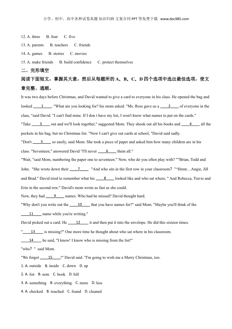 小学、初中、高中各种试卷真题知识归纳文案合同PPT等免费下载www.doc985.com浙江省衢州市2018年中考英语试卷一、听カ第一节:听小对话,从A、B、C三个选项中选出最佳选项,回答问题,对话仅读一遍。1.WherehasLilybeen?A.Australia.B.England.C.Germany.2.WhichsubjectdoesSally'sfatherteach?A.Math.B.PE.C.Chinese.3.Whendoesthemoviestart?A.At6:30.B.At7:30.C.At8:30.4.Howwilltheweatherbetomorrow?A.Sunny.B.Windy.C.Rainy.5.What'sthepossiblerelationshipbetweenthetwospeakers?A.Teacherandstudent.B.Motherandson.C.Doctorandpatient.第二节:听长对话,从A、B、C三个选项中选出最佳选项,回答问题,对话读两遍。听下面一段较长对话,回答第6~7小题。5.WhatisMattdoing?A.Heisshoppingatthemarket.B.Heismakingaplanforhistrip.C.Heisbuyingtheticketatthestation.7.HowwillMattgotoTexas?小学、初中、高中各种试卷真题知识归纳文案合同PPT等免费下载www.doc985.comA.Bybus.B.Bytrain.C.Byplane.听下面一段较长对话,回答第8~10小题。8.Wheredidthemanlearnabouttherestaurant?A.Fromafriend.B.FromTVC.Fromamagazine.g.Whatdoesthewomanorder?A.Fruit.B.Meat.C.Vegetables.10.Whatdoesthemanadvisethewomantodo?A.Todoexercise.B.Toeatless.C.Toloseweight.第三节;听独白,从题中所的A、B、C三个选项中选出最佳选项,完成信息表。独白读两遍。Juliette'swebsiteName_______GirlsDevelopmentAtten,Juliettedrew_______littlegirls.Shestartedthewebsitewiththehelpofher_______.Atfirst,therewereonlysomesimplepicturesonthewebsite.Now,ithasmessageboards,chatrooms,_______,musicandmore.Aim(目的)Tohelpthegirlslearnmoreaboutcultures,_______andbecomebetter.11.A.BeautifulB.CoolC.Young小学、初中、高中各种试卷真题知识归纳文案合同PPT等免费下载www.doc985.com12.A.threeB.fourC.five13.A.parentsB.teachersC.friends14.A.gamesB.storiesC.movies15.A.makefriendsB.buildconfidenceC.protectthemselves二、完形填空阅读下面短文,掌握其大意,然后从每题所的A、B、C、D四个选项中选出最佳选项,使文章完整、通顺。ItwastwodaysbeforeChristmas,andDavidwantedtogiveacardtoeveryoneinhisclass.Heopenedthebagandlooked____1____."Whatareyoulookingfor?hismomasked."Ms.Rossgaveusa____2____ofeveryoneintheclass,"saidDavid."Ican'tfindmine.IfIdonthavemylist,Iwon'tknowwhatnamestoputonthecards.""Take____3____outandwe'lllooktogether,"suggestedMom.Theyshookoutallhisbooksand____4____allthepocketsinhisbag,butnoChristmaslist."NowIcan'tgiveoutcardsatschool,"Davidsaidsadly."Don't____5____soeasily,saidMom.Shetookapieceofpaperandaskedhimhowmanychildrenareinhisclass."Seventeen,"answeredDavid"I'llnever____6____themall.""Wait,"saidMom,numberingthepaperonetoseventeen."Now,whodoyouoftenplaywith?""Brian,ToddandJohn."Shewrotedowntheir____7____."Andwhositsinthefirstrowinyourclassroom”“?Hmm…Angie,JillandBrad."Davidtriedtorememberwhathis____8____lookedlikeandwhosatwhere,"AndRebecca,TravisandErininthesecondrow."David'smomwroteasfastasshecould.Now,theyhad____9____names.Whohadhemissed?Davidthoughthard."Whydon'tyouwriteoutthe____10____thatyouhavenamesfor?"saidMom."Maybeyou'llthinkofthe____11____namewhileyou'rewriting."Davidpickedoutacard.He____12____itandthenputitintotheenvelope.Hedidthissixteentimes."____13____ismissing?"Onemoretimehethoughtaboutwhosatwhereinhisclassroom.____14____hesaid,"Iknow!Iknowwhoismissingfromthelist!""who?"saidMom."Weforgot____15____!"Davidsaid."I'mgoingtowishmeaMerryChristmas,too.1.A.outsideB.insideC.downD.up2.A.listB.noteC.bookD.bill3.A.somethingB.everythingC.moreD.less4.A.checkedB.touchedC.foundD.cleaned小学、初中、高中...