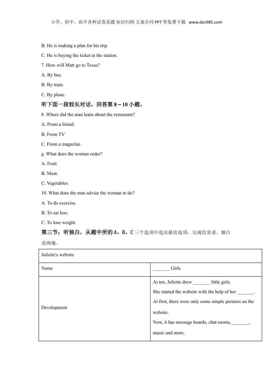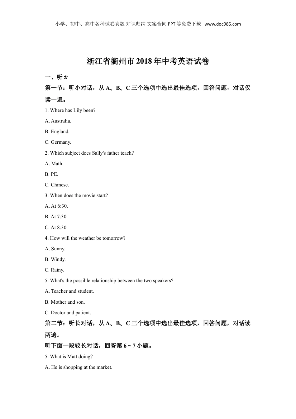 小学、初中、高中各种试卷真题知识归纳文案合同PPT等免费下载www.doc985.com浙江省衢州市2018年中考英语试卷一、听カ第一节:听小对话,从A、B、C三个选项中选出最佳选项,回答问题,对话仅读一遍。1.WherehasLilybeen?A.Australia.B.England.C.Germany.2.WhichsubjectdoesSally'sfatherteach?A.Math.B.PE.C.Chinese.3.Whendoesthemoviestart?A.At6:30.B.At7:30.C.At8:30.4.Howwilltheweatherbetomorrow?A.Sunny.B.Windy.C.Rainy.5.What'sthepossiblerelationshipbetweenthetwospeakers?A.Teacherandstudent.B.Motherandson.C.Doctorandpatient.第二节:听长对话,从A、B、C三个选项中选出最佳选项,回答问题,对话读两遍。听下面一段较长对话,回答第6~7小题。5.WhatisMattdoing?A.Heisshoppingatthemarket.小学、初中、高中各种试卷真题知识归纳文案合同PPT等免费下载www.doc985.comB.Heismakingaplanforhistrip.C.Heisbuyingtheticketatthestation.7.HowwillMattgotoTexas?A.Bybus.B.Bytrain.C.Byplane.听下面一段较长对话,回答第8~10小题。8.Wheredidthemanlearnabouttherestaurant?A.Fromafriend.B.FromTVC.Fromamagazine.g.Whatdoesthewomanorder?A.Fruit.B.Meat.C.Vegetables.10.Whatdoesthemanadvisethewomantodo?A.Todoexercise.B.Toeatless.C.Toloseweight.第三节;听独白,从题中所的A、B、C三个选项中选出最佳选项,完成信息表。独白读两遍。Juliette'swebsiteName_______GirlsDevelopmentAtten,Juliettedrew_______littlegirls.Shestartedthewebsitewiththehelpofher_______.Atfirst,therewereonlysomesimplepicturesonthewebsite.Now,ithasmessageboards,chatrooms,_______,musicandmore.小学、初中、高中各种试卷真题知识归纳文案合同PPT等免费下载www.doc985.comAim(目的)Tohelpthegirlslearnmoreaboutcultures,_______andbecomebetter.11.A.BeautifulB.CoolC.Young12.A.threeB.fourC.five13.A.parentsB.teachersC.friends14.A.gamesB.storiesC.movies15.A.makefriendsB.buildconfidenceC.protectthemselves二、完形填空阅读下面短文,掌握其大意,然后从每题所的A、B、C、D四个选项中选出最佳选项,使文章完整、通顺。ItwastwodaysbeforeChristmas,andDavidwantedtogiveacardtoeveryoneinhisclass.Heopenedthebagandlooked____1____."Whatareyoulookingfor?hismomasked."Ms.Rossgaveusa____2____ofeveryoneintheclass,"saidDavid."Ican'tfindmine.IfIdonthavemylist,Iwon'tknowwhatnamestoputonthecards.""Take____3____outandwe'lllooktogether,"suggestedMom.Theyshookoutallhisbooksand____4____allthepocketsinhisbag,butnoChristmaslist."NowIcan'tgiveoutcardsatschool,"Davidsaidsadly."Don't____5____soeasily,saidMom.Shetookapieceofpaperandaskedhimhowmanychildrenareinhisclass."Seventeen,"answeredDavid"I'llnever____6____themall.""Wait,"saidMom,numberingthepaperonetoseventeen."Now,whodoyouoftenplaywith?""Brian,ToddandJohn."Shewrotedowntheir____7____."Andwhositsinthefirstrowinyourclassroom”“?Hmm…Angie,JillandBrad."Davidtriedtorememberwhathis____8____lookedlikeandwhosatwhere,"AndRebecca,TravisandErininthesecondrow."David'smomwroteasfastasshecould.Now,theyhad____9____names.Whohadhemissed?Davidthoughthard."Whydon'tyouwriteoutthe____10____thatyouhavenamesfor?"saidMom."Maybeyou'llthinkofthe____11____namewhileyou'rewriting."Davidpickedoutacard.He____12____itandthenputitintotheenvelope.Hedidthissixteen小学、初中、高中各种试卷真题知识归纳文案合同PPT等免费下载www.doc985.comtimes."____13____ismissing?"Onemoretimehethoughtaboutwhosatwhereinhisclassroom.____14____hesaid,"Iknow!Iknowwhoismissingfromthelist!""who?"saidMom."Weforgot____15____!"Davidsaid."I'mgoingtowishmeaMerryChristmas,too.1.A.outsideB.insideC.downD.up2.A.listB.noteC.bookD.bill3.A.somethingB.ever...