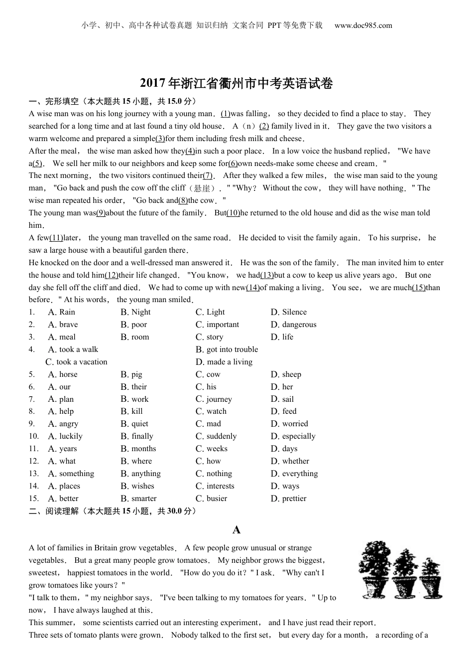 小学、初中、高中各种试卷真题知识归纳文案合同PPT等免费下载www.doc985.com2017年浙江省衢州市中考英语试卷一、完形填空(本大题共15小题,共15.0分)Awisemanwasonhislongjourneywithayoungman.(1)wasfalling,sotheydecidedtofindaplacetostay.Theysearchedforalongtimeandatlastfoundatinyoldhouse.A(n)(2)familylivedinit.Theygavethetwovisitorsawarmwelcomeandpreparedasimple(3)forthemincludingfreshmilkandcheese.Afterthemeal,thewisemanaskedhowthey(4)insuchapoorplace.Inalowvoicethehusbandreplied,"Wehavea(5).Wesellhermilktoourneighborsandkeepsomefor(6)ownneeds-makesomecheeseandcream."Thenextmorning,thetwovisitorscontinuedtheir(7).Aftertheywalkedafewmiles,thewisemansaidtotheyoungman,"Gobackandpushthecowoffthecliff(悬崖).""Why?Withoutthecow,theywillhavenothing."Thewisemanrepeatedhisorder,"Gobackand(8)thecow."Theyoungmanwas(9)aboutthefutureofthefamily.But(10)hereturnedtotheoldhouseanddidasthewisemantoldhim.Afew(11)later,theyoungmantravelledonthesameroad.Hedecidedtovisitthefamilyagain.Tohissurprise,hesawalargehousewithabeautifulgardenthere.Heknockedonthedoorandawell-dressedmanansweredit.Hewasthesonofthefamily.Themaninvitedhimtoenterthehouseandtoldhim(12)theirlifechanged."Youknow,wehad(13)butacowtokeepusaliveyearsago.Butonedayshefelloffthecliffanddied.Wehadtocomeupwithnew(14)ofmakingaliving.Yousee,wearemuch(15)thanbefore."Athiswords,theyoungmansmiled.1.A.RainB.NightC.LightD.Silence2.A.braveB.poorC.importantD.dangerous3.A.mealB.roomC.storyD.life4.A.tookawalkB.gotintotroubleC.tookavacationD.madealiving5.A.horseB.pigC.cowD.sheep6.A.ourB.theirC.hisD.her7.A.planB.workC.journeyD.sail8.A.helpB.killC.watchD.feed9.A.angryB.quietC.madD.worried10.A.luckilyB.finallyC.suddenlyD.especially11.A.yearsB.monthsC.weeksD.days12.A.whatB.whereC.howD.whether13.A.somethingB.anythingC.nothingD.everything14.A.placesB.wishesC.interestsD.ways15.A.betterB.smarterC.busierD.prettier二、阅读理解(本大题共15小题,共30.0分)AAlotoffamiliesinBritaingrowvegetables.Afewpeoplegrowunusualorstrangevegetables.Butagreatmanypeoplegrowtomatoes.Myneighborgrowsthebiggest,sweetest,happiesttomatoesintheworld."Howdoyoudoit?"Iask."Whycan'tIgrowtomatoeslikeyours?""Italktothem,"myneighborsays."I'vebeentalkingtomytomatoesforyears."Uptonow,Ihavealwayslaughedatthis.Thissummer,somescientistscarriedoutaninterestingexperiment,andIhavejustreadtheirreport.Threesetsoftomatoplantsweregrown.Nobodytalkedtothefirstset,buteverydayforamonth,arecordingofa小学、初中、高中各种试卷真题知识归纳文案合同PPT等免费下载www.doc985.comman'svoicewasplayedtothesecondset,andarecordingofawoman'svoicewasplayedtothethirdset.Attheendofthemonth,thesecondsetofplantshadgrownfourcentimeterstallerthanthefirst,andthethirdsetofplantshadgrownfivecentimeterstallerthanthesecond.Theplantslikedthewoman'svoicebest."Wecan'texplainit,"ascientistsaid,"Butsoundwavessurelyhelpthetomatoestogrow.Plantgrowershavealwayspaidattentiontolightandwater.Nowweadviseyoutothinkofsoundwavesinthesameway."16.Thewriter'sneighborgrowsbettertomatoesbecausehe______.A.stayswiththemB.laughsatthemC.talkstothemD.thinksofthem17.Throughtheexperiment,thescientistsprovedthat______helpstomatoestogrowbest.A.aman'svoiceB.awoman'svoiceC.thesoundofnatureD.thesoundofanimals18.Bytheunderlinedsentencethescientistmeans______.A.plantsdon'tgrowwithoutsoundwavesB....