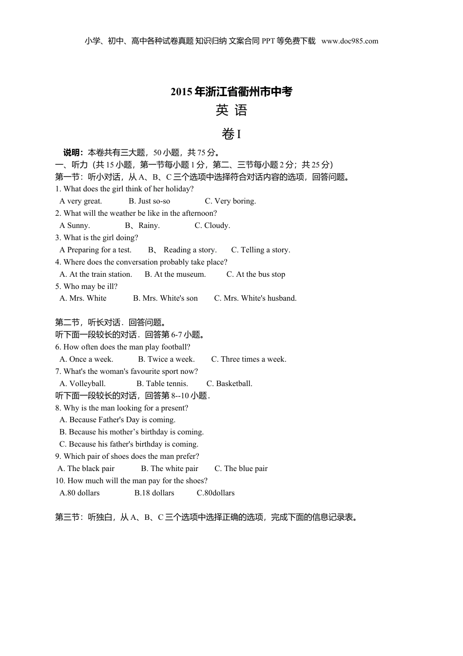 小学、初中、高中各种试卷真题知识归纳文案合同PPT等免费下载www.doc985.com2015年浙江省衢州市中考英语卷I说明:本卷共有三大题,50小题,共75分。一、听力(共15小题,第一节每小题1分,第二、三节每小题2分;共25分)第一节:听小对话,从A、B、C三个选项中选择符合对话内容的选项,回答问题。1.Whatdoesthegirlthinkofherholiday?Averygreat.B.Justso-soC.Veryboring.2.Whatwilltheweatherbelikeintheafternoon?ASunny.B、Rainy.C.Cloudy.3.Whatisthegirldoing?APreparingforatest.B、Readingastory.C.Tellingastory.4.Wheredoestheconversationprobablytakeplace?A.Atthetrainstation.B.Atthemuseum.C.Atthebusstop5.Whomaybeill?A.Mrs.WhiteB.Mrs.White'ssonC.Mrs.White'shusband.第二节,听长对话.回答问题。听下面一段较长的对话.回答第6-7小题。6.Howoftendoesthemanplayfootball?A.Onceaweek.B.Twiceaweek.C.Threetimesaweek.7.What'sthewoman'sfavouritesportnow?A.Volleyball.B.Tabletennis.C.Basketball.听下面一段较长的对话,回答第8--10小题.8.Whyisthemanlookingforapresent?A.BecauseFather'sDayiscoming.B.Becausehismother’sbirthdayiscoming.C.Becausehisfather'sbirthdayiscoming.9.Whichpairofshoesdoesthemanprefer?A.TheblackpairB.ThewhitepairC.Thebluepair10.Howmuchwillthemanpayfortheshoes?A.80dollarsB.18dollarsC.80dollars第三节:听独白,从A、B、C三个选项中选择正确的选项,完成下面的信息记录表。小学、初中、高中各种试卷真题知识归纳文案合同PPT等免费下载www.doc985.com小学、初中、高中各种试卷真题知识归纳文案合同PPT等免费下载www.doc985.com11.A.AmericaB.EnglandC.Australia12.A.threeB.fourC.five13.A.computerdesksB.exercisebikesC.dinnertables14.A.ridebikesB.watchmoviesC.enjoymusic15.A.listeningB.readingC.writing二、完形填空(共15小题,每小题1分,共15分)阅读下面短文,掌握其大意,然后从每题所给的A、B、C、D四个选项中选出最佳选项,使文章完整、通顺.Iwaswalkingaroundinashoppingcenterforalongtime.Tiredand16,Idecidedtogoandgetacupofcoffee.AsIwasmakingmywaytothe17,Inoticedanoldgentlemanquitepoorlydressedsittingonabenchnearby.Fromthe18sightIknewthathewasinneedofsomekindofhelp.Hehadonlyalittlelunchinfrontofhim,buthewasenjoyingit19.Itwasalsoquiteclearthathehadaproblemwithhisrighteyeandprobablycouldn'tseeoutofit.Ithen20andwaitedtobeserved.Therewasayoungmaninfrontofmeinthelinewhowasalso21tobeserved.Itwashis22andtheyoungmayhandedtheserver(服务生)atwentydollarbillandwantedanorangejuice,aswellassomehelp.Heaskedtheservertogivethe23totheoldgentlemanoutsideonthebench.Theserverlookedattheyoungman,alittle24,notfullyunderstandingtherequirement.Theyoungmanalsotoldherthathewouldbewatchingallthetime25shewouldbecompletelysafe.Thentherewasawonderfulexchange(交流)betweentheserverandthe26.ThatwasoneofthemostbeautifulscenesIhadeverseeninmylife.IonlywishIhadaphotoofbothoftheirfaceswhiletheywere27.“28didn'ttheyoungmandothisactofkindnesshimself?"As29wasthinkingaboutthisexperiencelater,Iaskedmyself.Iguessthatdeepdowninhishearthewashopingthatthisactofkindnessmight30otherstodosomethingforthepeopleinneedaswell.Absolutelybeautiful!16.A.thirstyB.hungryC.angryD.busy17.A.shoppingcenterBcoffeeshopC.bookshopD.sportscenter18.A.firstB.secondC.thirdD.last19.A.softlyB.loudlyC.kindlyD.sweetly20.A.lookedaroundB.lookedawayC.joinedthelineD.lefttheline21.A.sittingB.waitingC.callingD.jumping22.A.turnB.dutyC.dreamD.interest23.A.coffeeB.teaC.waterD.juice24.A.worriedB.excitedC.pleasedD.surprised25.A.sothatB.thoughC.becauseD.asif26.A.youngmanB.strangerC.oldmanD.manager27.A.drinkingB.cryingC....