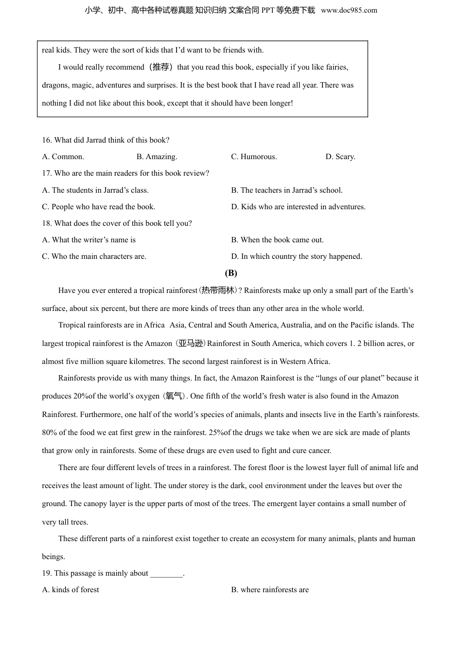 小学、初中、高中各种试卷真题知识归纳文案合同PPT等免费下载www.doc985.com宁波市2021年初中学业水平考试英语试题考生须知:1.全卷分试题卷I、试题卷II和答题卷。试题卷共8页,有6个大题,61个小题,满分为95分。考试时长为90分钟。2.请将姓名、准考证号分别填写在试题卷和答题卷的规定位置上。3.答题时,把试题卷I的答案在答题卷I上对应的选项位置用2B铅笔涂黑、涂满。将试题卷II答案用黑色字迹钢笔或签字笔书写,答案必须按照题号顺序在答题卷II各题目规定区域内作答,做在试题卷上或超出答题区域书写的答案无效。试题卷I一、完形填空(本题有15小题,每小题1分,共计15分)阅读下面短文,掌握大意,然后从A、B、C、D四个选项中选出最佳选项。Larryseemedalwayssilentanddidn’thaveanyfriend.HisteacherMr.Brown___1___this.Oneday,heaskedLarrytomeethimafterclass.Mr.Brownsaid,“Iseethatyoudon’ttalktoanyoneorshowany___2___inanything.What’swrong?”Larryreplied,“Sir,Ihaveavery___3___life.IhavetofacesomeverysadincidentsandIkeep___4___them.Becauseofthis,Ican’tfocusmyattentiononanythinganddon’tevenfeelliketalkingto___5___.”Mr.Brownlistenedcarefully,thoughtforawhileandsaid,“Wouldyoulikesomelemonade(柠檬汽水)?”Larryfeltalittle___6___andnervouslyreplied,“Yes,thankyou!”While___7___lemonade,Mr.Brownaddedmoresaltonpurposeandkeptthequantityofsugarlow.Larrymadea___8___faceassoonashedrankasipofthatlemonade.Seeingthis,Mr.Brownasked“Youdon’tlikeit?”“Um…it’sjustthereisabittoomuch___9___init,”Larryanswered.Mr.Brownstoppedhim,“Oh,itdoesn’tmatter.Iwillthrowitaway.”Astheteacherwasliftingtheglassto___10___,Larrystoppedhimandsaid,“Sir,pleasedon’tthrowitaway.___11___weputalittlemoresugarinthelemonade,itwillbefinetodrink.”Hearingthis,Mr.Brownsaid___12___,“ThisiswhatIwanttohearfromyou.Toimprovethe___13___oflemonade,wedon’tneedtoremovethesaltfromit,wecanjustaddsomesugartoit.Similarly,wecannotremovesadthingsthathave___14___happenedtous,butwecanaddsweetnessofgoodexperiencesinourlife.Ifyoukeeponcryingaboutyour___15___,neitheryourpresentwillberightnorthefuturewillbebright.”Larryrealizedhisproblemandpromisedtoliveapositivelife.小学、初中、高中各种试卷真题知识归纳文案合同PPT等免费下载www.doc985.com1.A.enjoyedB.noticedC.believedD.forgot2.A.fearB.angerC.interestD.politeness3.A.simpleB.difficultC.quietD.common4.A.lookingforB.learningfromC.laughingatD.thinkingabout5.A.anybodyB.somebodyC.everybodyD.nobody6.A.surprisedB.tiredC.boredD.shamed7.A.buyingB.cookingC.preparingD.drinking8.A.seriousB.friendlyC.patientD.strange9.A.sugarB.waterC.saltD.lemonade10.A.keepitawayB.takeitawayC.drinkitupD.useitup11.A.IfB.SinceC.AlthoughD.Unless12.A.bravelyB.coldlyC.happilyD.angrily13.A.tasteB.colorC.shapeD.smell14.A.neverB.alreadyC.nearlyD.seldom15.A.styleB.habitC.decisionD.past二、阅读理解(本题有15小题,每小题2分,共计30分)阅读下面材料,从每题所给的A、B、C、D四个选项中选出最佳选项。(A)BookreviewbyJarradOntheweekendIreadatotallyamazingbookcalledTheAdventures(历险记)ofSiegfriedandHannah.Itwassuchacoolbookbecauseitwasfullofmagicaljourneystomanymysteriouslands.Youneverknewwherethecharactersweregoingtoendupnext.ThemaincharactersareaboycalledSiegfriedandhislittlesisterHannah.Theyarealwaysreadyforamysteriousadventureeverytimetheystepouttheirdoor.Thebookcontainstwelveseparatestories.Iwon’tspoilitforyou,butwhatIlovedthemostwasthatthemaincharacterswerejustlike小学、初中、高中各种试卷真题知识归纳文案合同PPT等免费下载www.doc985.comrealkids.TheywerethesortofkidsthatI’dwantto...