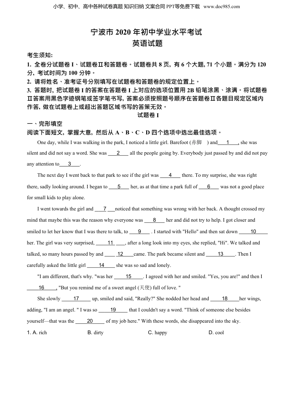 小学、初中、高中各种试卷真题知识归纳文案合同PPT等免费下载www.doc985.com宁波市2020年初中学业水平考试英语试题考生须知:1.全卷分试题卷I、试题卷Ⅱ和答题卷。试题卷共8页,有6个大题,71个小题。满分为120分,考试时间为100分钟。2.请将姓名、准考证号分别填写在试题卷和答题卷的规定位置上。3.答题时,把试题卷I的答案在答题卷I上对应的选项位置用2B铅笔涂黑、涂满。将试题卷Ⅱ答案用黑色字迹钢笔或签字笔书写,答案必须按照题号顺序在答题卷Ⅱ各题目规定区域内作答,做在试题卷上或超出答题区域书写的答策无效。试题卷I一、完形填空阅读下面短文,掌握大意,然后从A、B、C、D四个选项中选出最佳选项。Oneday,whileIwaswalkinginthepark,Inoticedalittlegirl.Barefoot(赤脚)and1,shewassilentanddidnotsayaword.Shewas2allthepeoplegoingby.Everybodyjustpassedbyanddidnotpayanyattentionto3.ThenextdayIwentbacktothatparktoseeifthegirlwas4there.Tomysurprise,shewasrightthere,sadlylookingaround.Ibeganto5her,asatthattimeaparkfullof6wasnotagoodplaceforsmallkidstoplayalone.Iwenttowardsthegirland7noticedthatsomethingwaswrongwithherback.Athoughtcrossedmymindthatmaybethiswasthereasonwhyeveryonewas8heranddidnottrytohelp.IgotcloserandsmiledtoletherknowthatIwastheretotalk,to9.Istartedwith"Hello"andthensatdown10her.Thegirlwasverysurprised,11,afteralonglookintomyeyes,shereplied,"Hi".Wetalkedandtalked,somanyhourspassedbyand12came.Theparkbecamesilentand13.ThenIcarefullyaskedthelittlegirl14shewassosadandlonely."Iamdifferent,that'swhy."washer15.Iagreedwithherandsmiled."Yes,youare!"andthenI16,"Butyouremindmeofasweetangel(天使)fulloflove."Sheslowly17up,smiledandsaid,"Really?"Shenoddedherheadand18herwings,adding,"Iamanangel."Iwasso19thatIcouldn'tsayaword."Thinkofsomeoneelsebesidesyourself—thatwasthe20ofmyjobhere."Withthesewords,shedisappearedintothesky.1.A.richB.dirtyC.happyD.coolThree-quarterlengthjacket(women's)Madeoffashionableleather(皮革)Fullylined.Length34ins.Donothandclean.T-shirt(men's)Short-sleevedshirt.Washable.Madeofcotton.Sizes:S(35/37)M(38/40).L(41/43)XL(44/46)Ordernumber:EnglandT-shirtKQ8149darkblue小学、初中、高中各种试卷真题知识归纳文案合同PPT等免费下载www.doc985.com2.A.watchingB.leavingC.hearingD.feeling3.A.itB.themC.herD.me4.A.alwaysB.stillC.everD.once5.A.laughatB.playwithC.talktoD.worryabout6.A.policemenB.childrenC.strangersD.cleaners7.A.hardlyB.carefullyC.luckilyD.suddenly8.A.askingB.avoidingC.missingD.loving9.A.helpB.playC.answerD.stay10.A.behindB.overC.besideD.around11.A.soB.tillC.unlessD.however12.A.rainB.snowC.darknessD.warmth13.A.crowdedB.emptyC.tinyD.special14.A.whyB.whenC.whereD.whether15.A.adviceB.replyC.praiseD.excuse16.A.continuedB.criedC.wavedD.sang17.A.wokeB.stoodC.gaveD.put18.A.spreadB.pushedC.beatD.folded19.A.boredB.relaxedC.amazedD.interested20.A.resolution二、阅读理解B.difficultyC.dreamD.purpose阅读下面材料,从每题所给的A、B、C、D四个选项中选出最佳选项。(A)小学、初中、高中各种试卷真题知识归纳文案合同PPT等免费下载www.doc985.comScotlandT-shirtKQ8151darkgreenSizes:10,12,14,16,18WalesT-shirtKQ8279darkredOrdernumber:$10CQ8200darkblueSwimsuit(women's)CQ8201darkbrownSoftandcomfortable.$100(buythreegetonefree)Madeof:INSUREYOURLEATHERJACKET80%silkagainstbeingstolenandaccidentaldamage20%nylon.FordetailsseePage1143.Sizes:10,12,14,16Ordernumber:GQ9292darkbrownGQ9963darkblue$1521.Whatyouhavejustreadisa/an.A.adforclothesB.moviereviewC.newsreportD.foodorder22.Fromthepassageabove,wecanknowthat.A.theswimsuitismadeofsilkandcottonB.therearef...
