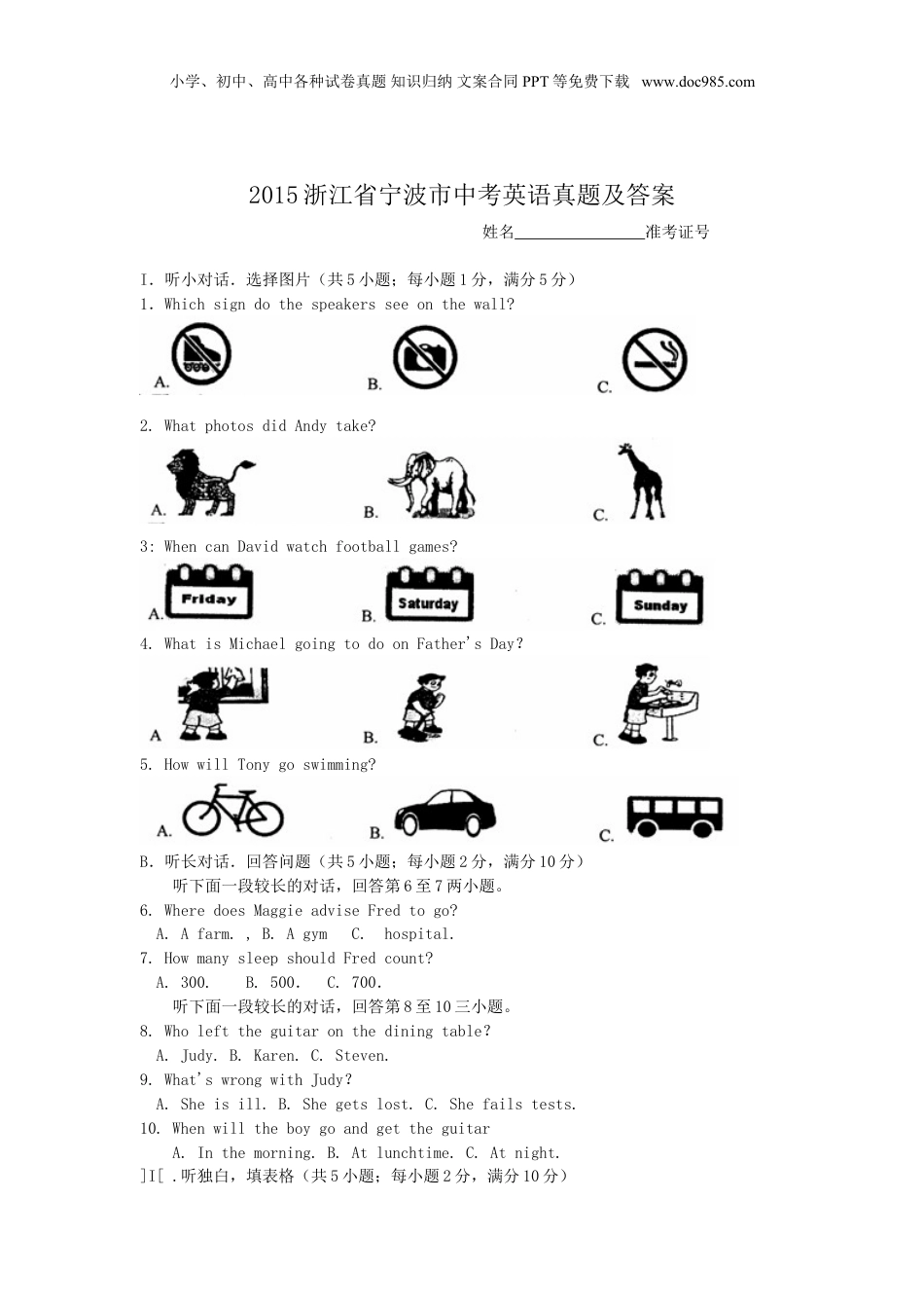 小学、初中、高中各种试卷真题知识归纳文案合同PPT等免费下载www.doc985.com2015浙江省宁波市中考英语真题及答案姓名准考证号I.听小对话.选择图片(共5小题;每小题1分,满分5分)1.Whichsigndothespeakersseeonthewall?2.WhatphotosdidAndytake?3:WhencanDavidwatchfootballgames?4.WhatisMichaelgoingtodoonFather'sDay?5.HowwillTonygoswimming?B.听长对话.回答问题(共5小题;每小题2分,满分10分)听下面一段较长的对话,回答第6至7两小题。6.WheredoesMaggieadviseFredtogo?A.Afarm.,B.AgymC.hospital.7.HowmanysleepshouldFredcount?A.300.B.500.C.700.听下面一段较长的对话,回答第8至10三小题。8.Wholefttheguitaronthediningtable?A.Judy.B.Karen.C.Steven.9.What'swrongwithJudy?A.Sheisill.B.Shegetslost.C.Shefailstests.10.WhenwilltheboygoandgettheguitarA.Inthemorning.B.Atlunchtime.C.Atnight.]I[.听独白,填表格(共5小题;每小题2分,满分10分)小学、初中、高中各种试卷真题知识归纳文案合同PPT等免费下载www.doc985.com听下面一段独白,然后从A、玖C三个选项中选择正确的选项,完成下面的信息记录表。11.A.ChinaB.JapanC.India12.A.visitsfamousplacesB.studiesinthelibraryC.goesshopping13.A.busyB.quietC.rich14.A.petshowsB.talkshowsC.sportsshows15.A.twoweeksB.twomonthsC.twoyearsN.完形填空(共15小题;每小题1分,满分15分)阅读下面短文,掌握其大意,然后从A,B,C,D四个选项中选出可以填人空白处的最佳选项。ThefirstnoteIeverwroteformymothersaid“Hi,Mom!Haveaniceday!Love,Marie!”.IwastwelvewhenIwroteit,andIfoldedthe16intoherchangepurse(零钱包).Mymotherworkedasacleanerinaclothingfactory.Iknewthatwhenshe17mealsinthedininghall,shewouldhavetolookforchangeinherpurse.Ididn'tknowthatshewouldee18thatnote,andalwayscarryitwithher.FromthedaythatI19foldedthesmallpieceofpaperintomymother'schangepurse,sheandIlefteachother20notes.Theywouldbeputinthefridge,underalamp,orbesidetheTVset.I21foundonehiddeninmyshoe.Fromtheoutside,ournotesmayhavebeengeneral22ofourdays,ideasandwishes.Buttomymotherand23,theywerealifeline-acommunicationwitheachotherthatnooneelse24OnOctober20,2009,mymotherdiedafteralongillness.Istoodnearherbed,25herhand.Ididn'tcrythedaymymomdied,26Ididn'tcryaweeklaterwhenIwenttocollectherthings.Iwassothankfulthatshenolongerhadachesand27Recently,Ifoundanotethatmymom.had28me.Ithadbeenhiddenin小学、初中、高中各种试卷真题知识归纳文案合同PPT等免费下载www.doc985.comthe29ofmyfavoritechildhoodbookforyears.Itread“DearMarie,Iloveyoualways..Missyoualot.Don'tforgetme.Be50!Love,Mom·”Thatday,Icried.16.A.noteB.bookC.diaryD.letter17.A.preparedB.goldC.boughtD.cooked18.A.forgetB.keepC.loseD.pick19.A.carefullyB.wiselyC.quicklyD.carelessly20.A.bigB.funnyC.secretD.beautiful21.A.hardlyB.neverC.evenD.seldom22.A.programsB.coursesC.excusesD.records23.A.herB.meC.himD.us24.A.sharedB.believedC.promisedD.remembered25.A.reachingB.watchingC.pushingD.holding26.A.andB.butC.orD.because27.A.giftsB.painsC.dialogsD.mistakes28.A.lentB.sentC.passedD.left29.A.linesB.poemsC.pagesD.pictures30.A.seriousB.happyC.patientD.strictV.阅读理解(共15小题;每小题2分,满分30分)阅读下列材料,然后从A,B,C,D四个选项中选出能回答所提问题或完成所给句子的最佳选项。31.WhereisJessywritingfrom?A.Sydney.B.NewZealand.C.Paris.D.Utah.32.WhatdidDonnaandFrankdoduringtheirtravelling?A.Theyvisitedmuseums.B.Theytookaboatride.C.Theysatatastreetpark.D.Theywatchedmoviesinthecinema.小学、初中、高中各种试卷真题知识归纳文案合同PPT等免费下载www.doc985.com33.WhichofthefollowingisTRUEaccordingt...