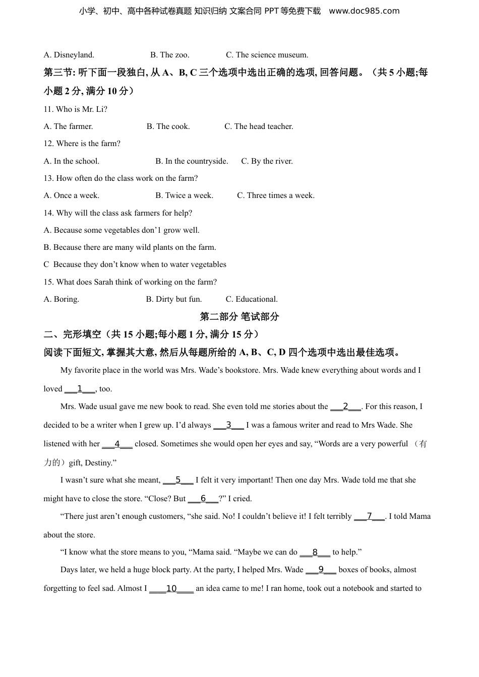 小学、初中、高中各种试卷真题知识归纳文案合同PPT等免费下载www.doc985.com浙江省2021年初中学业水平考试(丽水市)英语说明:本卷共有三大题,45小题,满分70分。第一部分听力部分一、听力(共15小题;满分25分)第一节:听小对话,从A、B、C三个选项中选出正确的选项;回答问题。(共5小题;每小题1分,满分5分)1.WhatclubdoesMikewanttojoin?A.Themusicclub.B.Thefootballclub.C.Theartclub.2.Howistheweathernow?A.Rainy.B.Cloudy.C.Sunny.3.WhattimedidRickgetupthismorning?A.At6:30.B.At7:00.C.At8:00.4.Wheredoesthewomanwanttogo?A.Toabank.B.Toaflowershop.C.Toarestaurant.5.Whatistherelationshipbetweenthetwospeakers?A.Doctorandpatient.B.Husbandandwife.C.Teacherandstudent.第二节:听长对话,从A、B、C三个选项中选出正确的选项,回答问题。(共5小题;每小题2分,满分10分)听下面一段较长对话,回答下列问题。6.Whatcolordoestheman’sdaughterlike?A.Black.B.WhiteC.Yellow.7.HowmuchdoesthemanpayfortheT-shirts?A.20dollars.B.30dollars.C.32dollars.听下面一段较长对话,回答下列问题。8.WhodidMarygotoShanghaiwith?A.Herfriends.B.Hersister.C.Herparents.9.HowdidMarygothere?A.Bycar.B.Bytrain.C.Bybus.10.WhichplacedidMaryvisitfirstinShanghai?小学、初中、高中各种试卷真题知识归纳文案合同PPT等免费下载www.doc985.comA.Disneyland.B.Thezoo.C.Thesciencemuseum.第三节:听下面一段独白,从A、B,C三个选项中选出正确的选项,回答问题。(共5小题;每小题2分,满分10分)11.WhoisMr.Li?A.Thefarmer.B.Thecook.C.Theheadteacher.12.Whereisthefarm?A.Intheschool.B.Inthecountryside.C.Bytheriver.13.Howoftendotheclassworkonthefarm?A.Onceaweek.B.Twiceaweek.C.Threetimesaweek.14.Whywilltheclassaskfarmersforhelp?A.Becausesomevegetablesdon’1growwell.B.Becausetherearemanywildplantsonthefarm.C.Becausetheydon’tknowwhentowatervegetables15.WhatdoesSarahthinkofworkingonthefarm?A.Boring.B.Dirtybutfun.C.Educational.第二部分笔试部分二、完形填空(共15小题;每小题1分,满分15分)阅读下面短文,掌握其大意,然后从每题所给的A,B、C,D四个选项中选出最佳选项。MyfavoriteplaceintheworldwasMrs.Wade’sbookstore.Mrs.WadekneweverythingaboutwordsandIloved___1___,too.Mrs.Wadeusualgavemenewbooktoread.Sheeventoldmestoriesaboutthe___2___.Forthisreason,IdecidedtobeawriterwhenIgrewup.I’dalways___3___IwasafamouswriterandreadtoMrsWade.Shelistenedwithher___4___closed.Sometimesshewouldopenhereyesandsay,“Wordsareaverypowerful(有力的)gift,Destiny.”Iwasn’tsurewhatshemeant,___5___Ifeltitveryimportant!ThenonedayMrs.Wadetoldmethatshemighthavetoclosethestore.“Close?But___6___?”Icried.“Therejustaren’tenoughcustomers,“shesaid.No!Icouldn’tbelieveit!Ifeltterribly___7___.ItoldMamaaboutthestore.“Iknowwhatthestoremeanstoyou,“Mamasaid.“Maybewecando___8___tohelp.”Dayslater,weheldahugeblockparty.Attheparty,IhelpedMrs.Wade___9___boxesofbooks,almostforgettingtofeelsad.AlmostI____10____anideacametome!Iranhome,tookoutanotebookandstartedto小学、初中、高中各种试卷真题知识归纳文案合同PPT等免费下载www.doc985.comwrite.ThemomentIwrotedowneverythingIloved____11____Mrs.Wade’sstore,Iranback.“Ihaveapresentforyou,Mrs.Wade.”I____12____thenotebooktoher.Sheopeneditandsaw”Mrs.Wade’sBookstore,“byDestinyCrawford”.Hereyeslitup!“Whydon’tyou____13____ittome?”Mrs.Wadeasked.Iwasreadingeveryword.Mrs.Wadewaslisteningwithhereyesclosed.Shewasso____14____whenIfinished,shegavemeabig,longhug(拥抱).“Wordsareapowerfulgift,”shesaidagain.Thattime____15____cametounderstandexactlywhatshemeant.Mrs.WadeandIdon’tknowifthestorewillclose,butwewillkeepread...