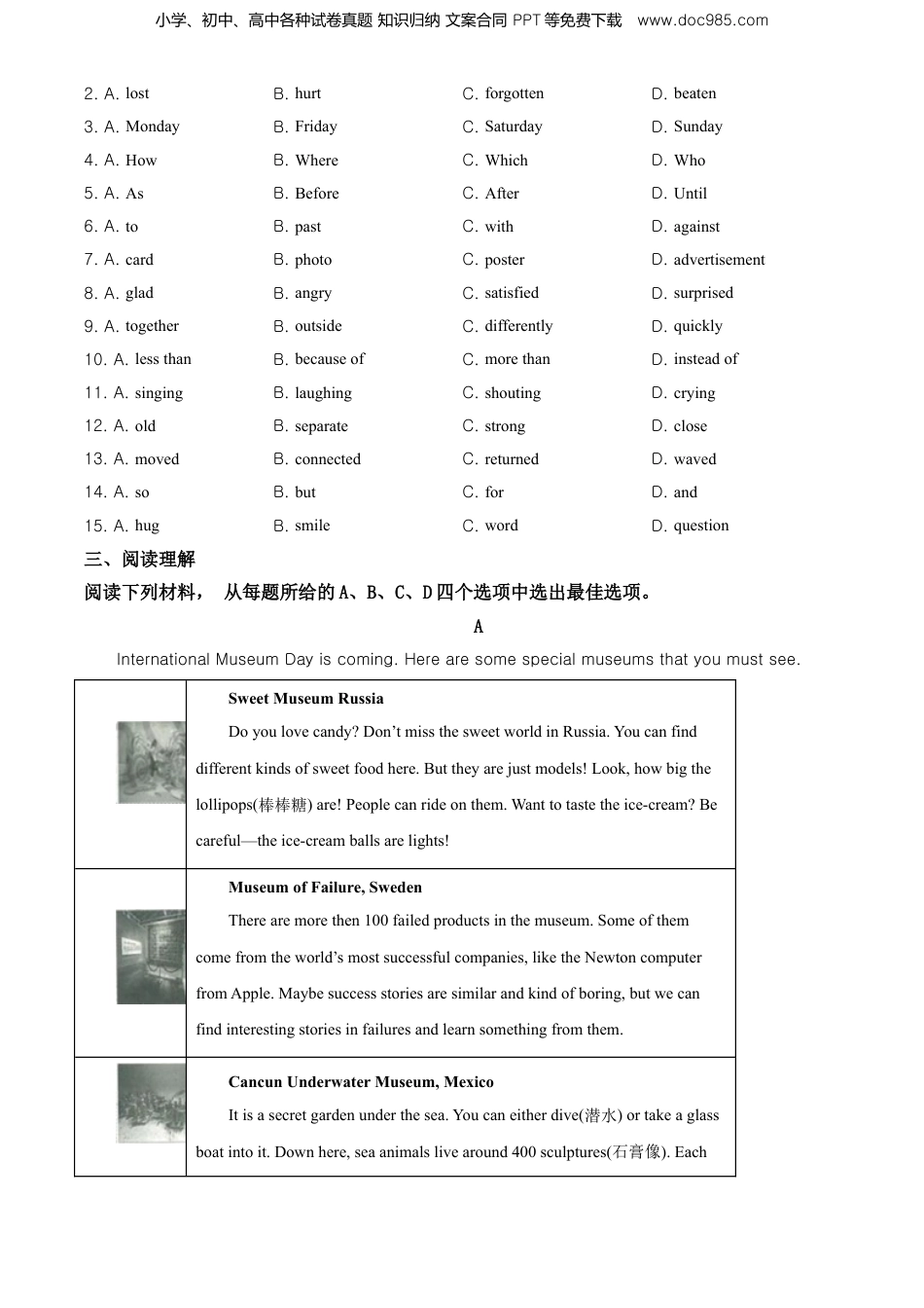 小学、初中、高中各种试卷真题知识归纳文案合同PPT等免费下载www.doc985.com浙江省金华、义乌、丽水市2019年中考英语试题卷I听力第一节,听小对话,从A、B、C三个选项中选出正确的选项,回答问题。1.Howdidthegirlgotoschooltoday?A.Bybike.B.Bycar.C.Onfoot.2.WhatwillPeterdoonSundayafternoon?A.Gocamping.B.Haveapianolesson.C.Visithisgrandfather.3.Whenwillthetrainleave?A.At7:40.B.At8:00.C.At8:20.4.Whatdoestheboythinkofthemovie?A.Interesting.B.Moving.C.Boring.5.Wheredoestheconversationprobablytakeplace?A.Inashop.B.Inacinema.C.Inalibrary.第二节,听长对话,从A、B、C三个选项中选出正确的选项,回答问题。听下面一段较长的对话,回答6、7两个问题。6.WhydidJackhaveabadsleepatnight?A.Hewasnervousbeforeexams.B.Hisneighborskeptmakingnoise.C.Hewascoughingthewholenight.7.WhatdidMrs.BlackadviseJacktodo?A.Takesomemedicine.B.Haveawalkwithhisparents.C.Askthecommunityforhelp.听下面一段较长的对话,回答8~10三个问题。8.HowdidJohnsonfeelatfirst?A.Angry.B.Surprised.C.Nervous.9.Whotookpartinthespeechcompetition?A.Johnson.B.Helen.C.Tracy.10.WhatisJohnsonbusywith?A.Practicingaspeech.B.Havingbasketballtraining.C.Preparingforanartproject.第三节,听下面一段独白,从A、B、C三个选项中选出正确的选项,回答问题。11.Whowillgiveaspeechatthefirstmeeting?A.Mr.Lu.B.Mrs.King.C.Mr.Stanford.小学、初中、高中各种试卷真题知识归纳文案合同PPT等免费下载www.doc985.com12.Wherewillthemeetingbeheld?A.Intheschoolhall.B.Inthesciencelab.C.Inthemeetingroom.13.Whatwillthestudentsdoatthemeeting?A.LearnabouttheBlackHole.B.Makeamodelplane.C.Watchasciencemovie.14.Inwhichofficecanstudentssignup(报名)?A.203.B.302.C.320.15.Whydoesthespeakergivethemessage?A.Toencouragestudentstojointhespaceclub.B.Togiveadviceonhowtolearnsciencewell.C.Toaskstudentstovisitthesciencemuseum.第二部分笔试部分二、完形填空阅读下面短文,掌握其大意,然后从每题所给的A、B、C、D四个选项中选出最佳选项。AfterschoolonFriday,IwaitedattheschoolgatetowalkhomewithJemma,asusual.ThenIsaw___1___talkingandlaughinghappilywithsomeothergirls.Sheglanced(瞥了一眼)atmeandleftmealonethere.IknewrightthenthatIhad___2___mybestfriend.Afterdinner,Momasked,“IsJemmacomingbytomorrow?”Ishrugged(耸肩)andsaidnothing.Thenextmorning,Momasked,“Todayis___3___,WhatareyouandJemmagoingtodo?”Ishruggedagain.“___4___isJemma?”Momtookalookatme.Thenshesaid,“WillyoutakethesemagazinestoGrandma,please?”___5___Iwalkeddownthestreet,anewgirlintheneighborhoodcametowardsme,smiling.ButIjustwent___6___her.Grandmawelcomedmeatthedoorwithawarmhug.Sittingonthesofa,Inoticeda(an)___7___ofkidsinold-fashionedclothesonthetable.Grandmapointedatagirlwithshortfairhair.“That’sBethLambert,”shesaid.“Mybestfriend.Untilaweekbeforewetookthisphoto.”Iwas___8___atthat.“BethandIwerebestfriendsinschool.Wedideverything___9___.Thenoneday,shemadenewfriendsandsaidshedidn’twanttohangoutwithmeanymore.Nothinghurt___10___that.”Ididn’tsayanything.Icouldn’t.IknewI’dstart___11___ifIopenedmymouth.Grandmahuggedmeagain.“Simone,sometimesfriendsgrow___12___.Itmighthappentoanyone,”shecontinued.“Then,seehim?”Grandma’sfinger___13___toaboywithglassesinthephoto.“Helivednearme.WhenIwaswalkinghomebymyself___14___thisboywas,too,Isaid‘hello’.Andwebecamefriends.”“Soifwewanttostartanewfriendship,”shesmiled.“One___15___isallittook.”AsIwasheadinghome,thatnewgirlappearedagain.Iwenttowardsherandspoke,“Hello.”1.A.itB.themC.herD.him小学、初中、高中各种试卷真...
