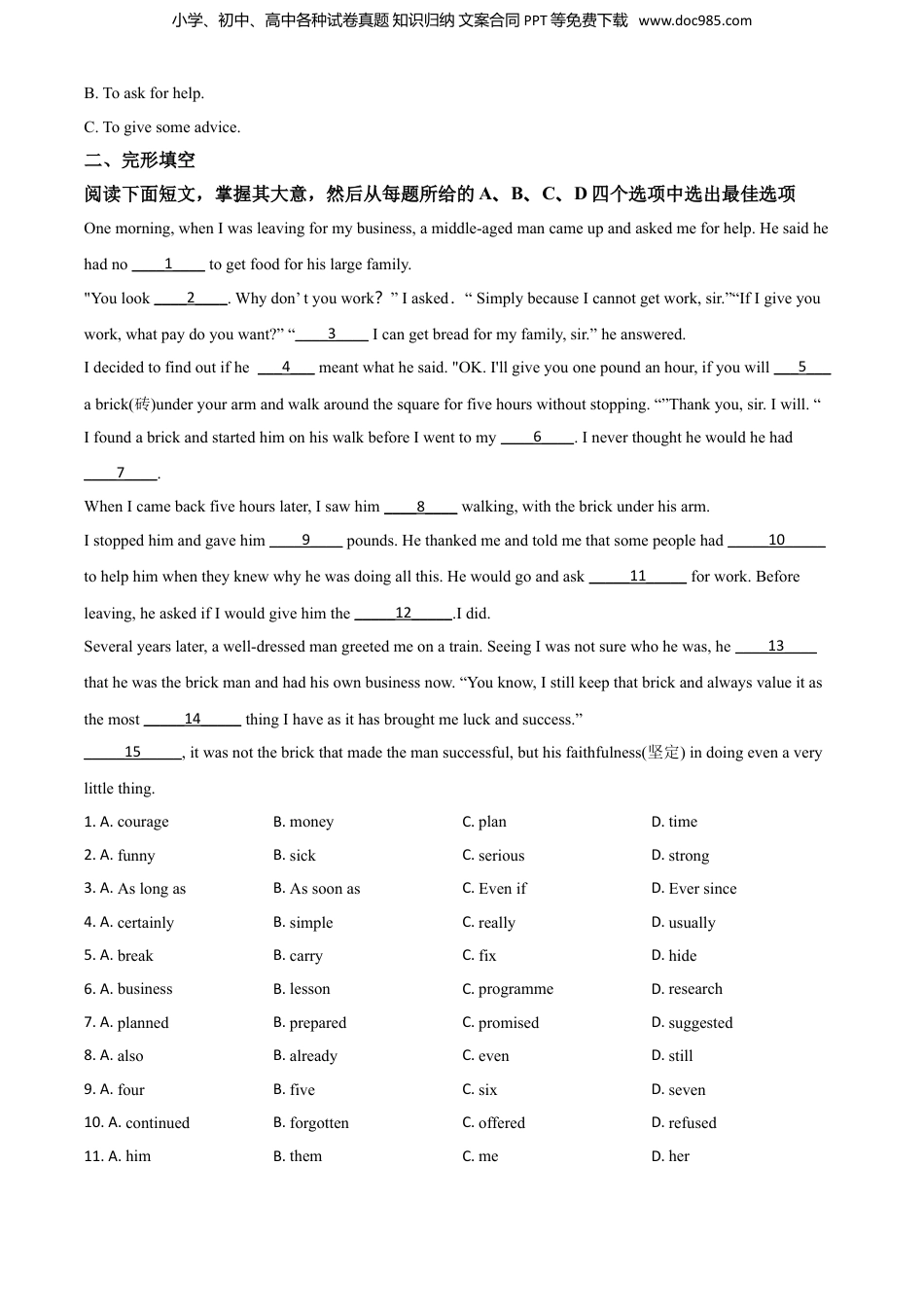 小学、初中、高中各种试卷真题知识归纳文案合同PPT等免费下载www.doc985.com2018年浙江丽水中考真题英语卷听力第一节;听小对话,从A、B、C三个选项中选出正确的选项,回答问题1.WhatisBobgoingtodothisweekend?A.Toplaybasketball.B.Tohaveapicnic.C.Tovisithisuncle.2.Whattimewillthefilmstart?A.Atsix.B.Atseven.C.Ateight.3.Whocanplaythepiano?A.Tim.B.Tim'smother.C.Tim'ssister.4.Wheredoesthewomanwanttogo?A.Themuseum.B.Thelibrary.C.Thehospital.5.Howisthemanprobablyfeelingnow?A.Relaxed.B.Angry.C.Nervous.第二节:听长对话,从A、B、C三个选项中选出正确的选项,回答问题。听下面一段较长对话,回答6、7两个问题6.Whatcolourdoestheman'swifelike?A.Red.B.Blue.C.Purple.7.Howmuchisthescarf?A.$29.B.$39小学、初中、高中各种试卷真题知识归纳文案合同PPT等免费下载www.doc985.comC.$49.听下面一段较长对话,回答8~10三个问题。8.WhodidJohnmeetyesterdayevening?A.Australianmusicians.B.Australianstudents.C.Australianteachers.9.WhatdidJohntalkaboutwiththeforeigners?A.Chinesefood.B.Englishlearning.C.Popmusic.10.WhenwillJohngototheEnglishclubagain?A.NextFridayevening.B.NextSaturdaymorning.C.NextSundayafternoon.第三节:听下面一段独白,从A、B、C三个选项中选出正确的选项,回答问题。11.WheredoesSamcomefrom?A.France.B.America.C.England.12.WhendidSamgototheoldvillage?A.Yesterdaymorning.B.Yesterdayafternoon.C.Yesterdayevening.13.WhathappenedtoSaminthevillage?A.Hewaslost.B.Hegothurt.C.Helostabag.14.WhocametoseeSamwiththehotelmanager?A.Aschoolboy.B.Ateacher.C.Apoliceman.15.WhydidSamwritetheletter?A.Tomakeaninvitation.小学、初中、高中各种试卷真题知识归纳文案合同PPT等免费下载www.doc985.comB.Toaskforhelp.C.Togivesomeadvice.二、完形填空阅读下面短文,掌握其大意,然后从每题所给的A、B、C、D四个选项中选出最佳选项Onemorning,whenIwasleavingformybusiness,amiddle-agedmancameupandaskedmeforhelp.Hesaidhehadno____1____togetfoodforhislargefamily."Youlook____2____.Whydon’tyouwork”?Iasked“.SimplybecauseIcannotgetwork,sir.”“IfIgiveyouwork,whatpaydoyouwant?”“____3____Icangetbreadformyfamily,sir.”heanswered.Idecidedtofindoutifhe___4___meantwhathesaid."OK.I'llgiveyouonepoundanhour,ifyouwill___5___abrick(砖)underyourarmandwalkaroundthesquareforfivehourswithoutstopping.“”Thankyou,sir.Iwill.“IfoundabrickandstartedhimonhiswalkbeforeIwenttomy____6____.Ineverthoughthewouldhehad____7____.WhenIcamebackfivehourslater,Isawhim____8____walking,withthebrickunderhisarm.Istoppedhimandgavehim____9____pounds.Hethankedmeandtoldmethatsomepeoplehad_____10_____tohelphimwhentheyknewwhyhewasdoingallthis.Hewouldgoandask_____11_____forwork.Beforeleaving,heaskedifIwouldgivehimthe_____12_____.Idid.Severalyearslater,awell-dressedmangreetedmeonatrain.SeeingIwasnotsurewhohewas,he____13____thathewasthebrickmanandhadhisownbusinessnow.“Youknow,Istillkeepthatbrickandalwaysvalueitasthemost_____14_____thingIhaveasithasbroughtmeluckandsuccess.”_____15_____,itwasnotthebrickthatmadethemansuccessful,buthisfaithfulness(坚定)indoingevenaverylittlething.1.A.courageB.moneyC.planD.time2.A.funnyB.sickC.seriousD.strong3.A.AslongasB.AssoonasC.EvenifD.Eversince4.A.certainlyB.simpleC.reallyD.usually5.A.breakB.carryC.fixD.hide6.A.businessB.lessonC.programmeD.research7.A.plannedB.preparedC.promisedD.suggested8.A.alsoB.alreadyC.evenD.still9.A.fourB.fiveC.sixD.seven10.A.continuedB.forgottenC.offeredD.refused11.A.himB.themC.meD.her小学、初中、高中各种试卷真题知识归纳文案合同PPT等免费下载www.doc985...