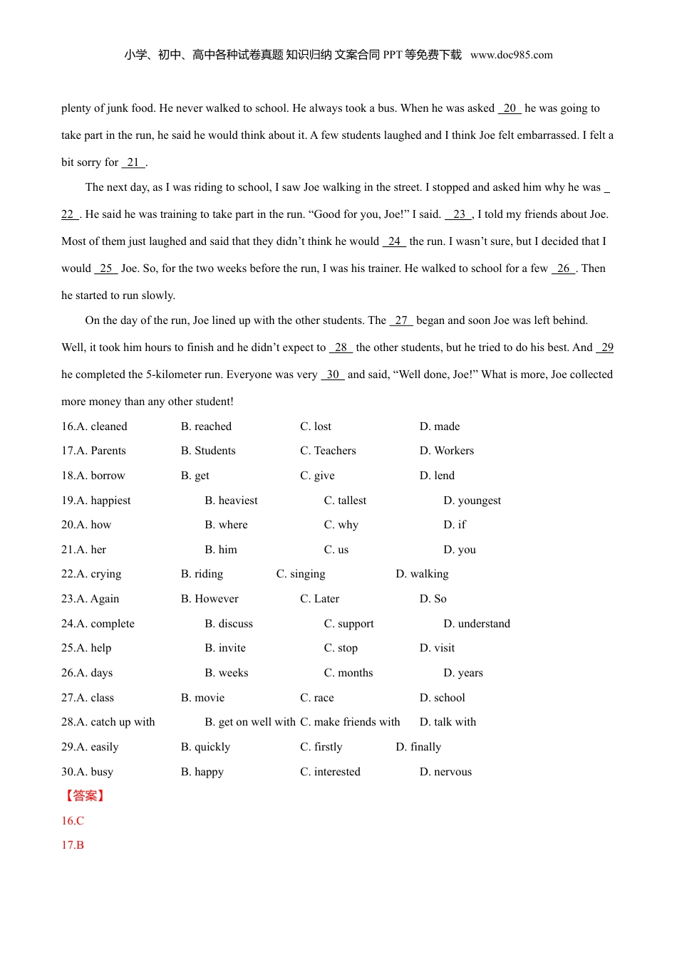 小学、初中、高中各种试卷真题知识归纳文案合同PPT等免费下载www.doc985.com考生须知:1.全卷共七大题,76小题,满分为120分。考试时间为100分钟。2.全卷分为卷I(选择题)Ⅱ和卷(非选择题)两部分,全部在“答题纸”上作答。卷I的答案必须用2B铅笔填涂;Ⅱ卷的答案必须用黑色墨水签字笔写在“答题纸”的相应位置上。3.请用黑色墨水签字笔在“答题纸”上先填写姓名和准考证号。卷Ⅰ说明:本卷共有三大题,45小题,满分70分。请用2B铅笔在“答题纸”上将你认为正确的选项所对应的小方框涂黑、涂满。第一部分听力部分一、听力(共15小题,满分25分)第一节:听小对话,从A、B、C三个选项中选出正确的选项,回答问题。(共5小题;每小题1分,满分5分)1.Wheredoesthemanwanttogo?A.Tothebank.B.Tothelibrary.C.Tothepostoffice.2.Howdoesthewomangotowork?A.Onfoot.B.Bybike.C.Bycar.3.WhattimedoesMaryoftengotobedonweekends?A.At10:00.B.At10:30.C.At11:00.4.What’stherelationshipbetweenthetwospeakers?A.Fatheranddaughter.B.Teacherandstudent.C.Doctorandpatient.5.WhydoesTonywanttoleaveschoolearlier?A.Becauseheisgoingtoseeadoctor.B.Becausehehastomeethisgrandpa.C.Becausehewantstocatchthetrain.第二节:听长对话,从A、B、C三个选项中选出正确的选项,回答问题。(共5小题;每小题2分,满分10分)听下面一段较长对话,回答6、7两个问题。6.Whatdidthemanbuyforhiswife?A.Ascarf.B.Aring.C.Awatch.7.Howmuchdidthemanpayforthegift?A.$150.B.$180.C.$200.听下面一段较长对话,回答8~10三个问题。小学、初中、高中各种试卷真题知识归纳文案合同PPT等免费下载www.doc985.com8.WhatdoesJimthinkofhispart-timejob?A.Hethinksit’sgreat.B.Hethinksit’seasy.C.Hethinksit’sboring.9.HowmanydaysdoesJimworkeveryweek?A.One.B.Two.C.Three.10.Whenisthewomangoingtobuysomebooks?A.OnTuesdaymorning.B.OnTuesdaynight.C.OnSaturdaymorning.第三节:听下面一段独白,从A、B、C三个选项中选出正确的选项,回答问题。(共5小题;每小题2分,满分10分)11.Wheredidtheaccidenthappen?A.OnBrownStreet.B.OnMainStreet.C.OnGreenStreet.12.Whowasthedriverofthebus?A.GeorgeGreen.B.BenJackson.C.DavidLee.13.Whydidtheaccidenthappen?A.Becausethedrivertriedtoavoidamancrossingthestreet.B.Becausethedrivertriedtoavoidadogrunningacrossthestreet.C.Becausethedriverwastalkingonthephonewhilehewasdriving.14.WhatdidMrs.Jacksonsuggest?A.Driversshouldbecareful.B.Peopleshouldcontroltheirdogs.C.Driversshouldstopbytheroadwhencalling.15.WhichofthefollowingisTRUEabouttheaccident?A.Somepeoplewerehurtbadly.B.Nobodysawtheaccidenthappen.C.Abusbrokeintotheyardofthehouse.第二部分笔试部分二、完形填空(共15小题;每小题1分,满分15分)阅读下面短文,掌握其大意,然后从每题所给的A、B、C、D四个选项中选出最佳选项。Twomonthsago,therewasaseriousearthquakeinmycountry.Manypeoplewerehurtand16theirhomes.Inmyschool,wedecidedtoorganizea5-kilometerruntocollectmoneyforthepeople.17signedupfortherunandaskedtheirrelativesandneighborstosupportthem.Thesepeopleagreedto18somemoney—50centsoradollar,forexample,foreverykilometerthatthestudentscompleted.Joewasmyclassmate.Hewasthe19studentinmyclassbecauseheseldomdidanyexerciseandheate小学、初中、高中各种试卷真题知识归纳文案合同PPT等免费下载www.doc985.complentyofjunkfood.Heneverwalkedtoschool.Healwaystookabus.Whenhewasasked20hewasgoingtotakepartintherun,hesaidhewouldthinkaboutit.AfewstudentslaughedandIthinkJoefeltembarrassed.Ifeltabitsorryfor21.Thenextday,asIwasridingtoschool,IsawJoewalkinginthestreet.Istoppedandaskedhimwhyhewas22.Hesaidhewastrainingtotakepartintherun.“Goodforyou,Joe!”Isaid.23,ItoldmyfriendsaboutJoe.Mostofthemjustlaughedandsaid...
