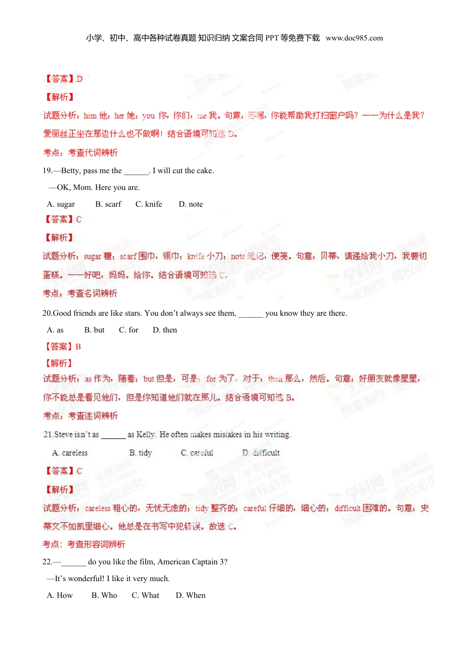 小学、初中、高中各种试卷真题知识归纳文案合同PPT等免费下载www.doc985.com第二部分笔试部分二、单项填空(共15小题;每小题1分,满分15分)从每题所给的A、B、C、D四个选项中选出可以填入空白处的最佳选项。16.Mrs.Smithhas______8-year-olddaughterwhohaswontwonationalpaintingprizes.A.aB.anC.theD.不填考点:考查冠词17.allhispocketmoney,DanboughtapresentforhismotheronMother’sDay.A.WithB.ForC.ByD.In18.—Susan,canyouhelpcleanthewindow?—Why______?Aliceissittingtheredoingnothing.A.himB.herC.youD.me小学、初中、高中各种试卷真题知识归纳文案合同PPT等免费下载www.doc985.com19.—Betty,passmethe______.Iwillcutthecake.—OK,Mom.Hereyouare.A.sugarB.scarfC.knifeD.note20.Goodfriendsarelikestars.Youdon’talwaysseethem,______youknowtheyarethere.A.asB.butC.forD.then【答案】B【解析】考点:考查形容词辨析22.—______doyoulikethefilm,AmericanCaptain3?—It’swonderful!Ilikeitverymuch.A.HowB.WhoC.WhatD.When小学、初中、高中各种试卷真题知识归纳文案合同PPT等免费下载www.doc985.com考点:考查疑问词辨析23.Hereismyphonenumber.You______callmeanytimeyoulike.A.mustB.canC.shouldD.need考点:考查情态动词24.It’sabadhabitto______whatyoucandotodayuntiltomorrow.A.writedownB.talkaboutC.worryaboutD.putoff考点:考查短语辨析25.Theskirt______softasifitismadeofsilk.A.soundsB.tastesC.feelsD.smells【答案】C【解析】小学、初中、高中各种试卷真题知识归纳文案合同PPT等免费下载www.doc985.com考点:考查时态辨析27.—DoyouoftenwatchManandNatureonTV?—Sometimes.It’saninterestingprogram,butI______SportsNews.A.preferB.wantC.knowD.review【答案】A【解析】28.—DoesMaryonlyhaveanappleforbreakfast?—Yes.Sheeatslikeabird______.A.towakeupB.tobestrongC.toloseweightD.tofallasleep考点:考查短语辨析29.Frankleftschoolat16,hestillbecameasuccessfulwriter.A.EversinceB.InfactC.AfterallD.Eventhough小学、初中、高中各种试卷真题知识归纳文案合同PPT等免费下载www.doc985.com考点:考查短语辨析30.—I’mterriblysorrythatI’vekeptyouwaitingforsolong.—______.A.NevermindB.It’sapityC.You’rewelcomeD.That’sright考点:考查A三、完形填空(共15小题;每小题1分,满分15分)阅读下面短文,掌握其大意,然后从每题所给的A、B、C、D四个选项中选出最佳选项。Itbeganayearago,aroundChristmas.EverytimeIdrovedownourstreet,I【小题1】anoldmansittinginhisfrontyard.Hewasusuallysmokingordrinking,andlookingratherunhappy.Oneday,whileIwasdrivingpasthimwithmy【小题2】,Idecidedtowaveathimwithalotofexcitement.【小题3】,whenhenoticedmewavingathim,helookedabitshocked.Then,Isawhishandgoupandhewavedback.“【小题4】didyouwaveathim?”mydaughterasked.Itoldherit’sjustanactofkindnessthatdoesn’t【小题5】anything.Itgivesbothhimandmeafeelingofjoy.Mydaughterrepliedthatshefeltabituncomfortabletowavetoa【小题6】,butnexttimeshewouldtryitaswell.Welikedclosetotheoldman,【小题7】wesawhimratheroften.Wheneverwedroveby,bothofuswouldstartwavingathimand,prettysoon,theoldmanstarted【小题8】ateveryonewhopassedbyhishouse.Onetime,mydaughter’sfriendcametovisitandshetoldmydaughterthatshesawthisstrangeoldmannearourhomewaveathervery【小题9】.Shementionedthatshewavedback,althoughshedidn’tknow【小题10】,anditfeltreallygood.小学、初中、高中各种试卷真题知识归纳文案合同PPT等免费下载www.doc985.comAssoonasmydaughterheardthis,shetoldherfriendthe【小题11】ofhowallthewavingbegan.Herfriendanswered:“Tellyourmomthat’sreallycool!”Otherfriendsgavesimilar【小题12】.Thistaughtmydaughterthatanactofkindnesscanbenaturaland【小题13】,ifyoureallywanttodoit...