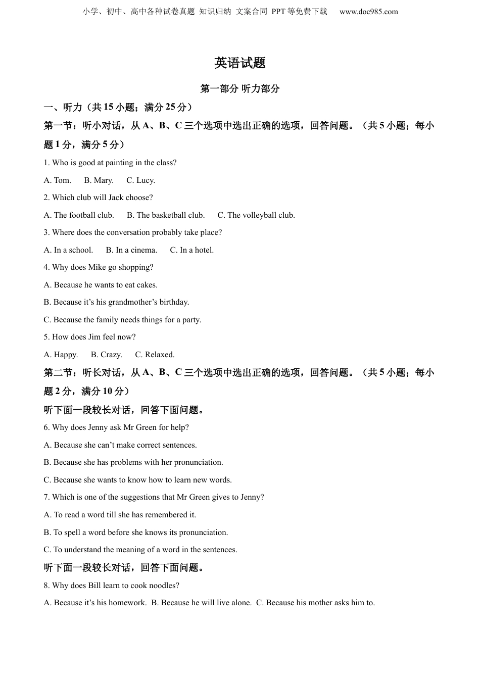 小学、初中、高中各种试卷真题知识归纳文案合同PPT等免费下载www.doc985.com英语试题第一部分听力部分一、听力(共15小题;满分25分)第一节:听小对话,从A、B、C三个选项中选出正确的选项,回答问题。(共5小题;每小题1分,满分5分)1.Whoisgoodatpaintingintheclass?A.Tom.B.Mary.C.Lucy.2.WhichclubwillJackchoose?A.Thefootballclub.B.Thebasketballclub.C.Thevolleyballclub.3.Wheredoestheconversationprobablytakeplace?A.Inaschool.B.Inacinema.C.Inahotel.4.WhydoesMikegoshopping?A.Becausehewantstoeatcakes.B.Becauseit’shisgrandmother’sbirthday.C.Becausethefamilyneedsthingsforaparty.5.HowdoesJimfeelnow?A.Happy.B.Crazy.C.Relaxed.第二节:听长对话,从A、B、C三个选项中选出正确的选项,回答问题。(共5小题;每小题2分,满分10分)听下面一段较长对话,回答下面问题。6.WhydoesJennyaskMrGreenforhelp?A.Becauseshecan’tmakecorrectsentences.B.Becauseshehasproblemswithherpronunciation.C.Becauseshewantstoknowhowtolearnnewwords.7.WhichisoneofthesuggestionsthatMrGreengivestoJenny?A.Toreadawordtillshehasrememberedit.B.Tospellawordbeforesheknowsitspronunciation.C.Tounderstandthemeaningofawordinthesentences.听下面一段较长对话,回答下面问题。8.WhydoesBilllearntocooknoodles?A.Becauseit’shishomework.B.Becausehewilllivealone.C.Becausehismotheraskshimto.小学、初中、高中各种试卷真题知识归纳文案合同PPT等免费下载www.doc985.com9.HowlongdoesittakeBilltocookthenoodles?A.3minutes.B.6minutes.C.9minutes.10.HowdoesBillfeelwhenthenewnoodlesarecooked?A.Excited.B.Sad.C.Surprised.第三节:听下面一段独白,从A、B、C三个选项中选出正确的选项,回答问题。(共5小题;每小题2分,满分10分)11.Whatisthespeakermainlytalkingabout?A.HerexperienceofSpringFestival.B.HerexperienceofDragonBoatFestival.C.HerexperienceofMid-AutumnFestival.12.WhydidHelengotoChina?A.Becauseshehadsomebusinesstodothere.B.Becauseshereceivedaninvitationfromherfriend.C.BecauseshewantedtolearnaboutChineseculture.13.WhatdotheChinesepeoplecallthefestival?A.Themoonfestival.B.Thedumplingfestival.C.Thewaterfestival.14.WheredidHelenspendthefestival?A.Inherownhouse.B.InLiMing’shome.C.Intherestaurant.15.WhydidHelenmissherfamilythatday?A.Becauseshethoughtofthetimeshespentwiththem.B.Becauseshehadbeenawayfromherfamilyforalongtime.C.Becauseshewasinfluencedbywhatshesawandexperienced.第二部分笔试部分二、完形填空(共15小题;每小题1分,满分15分)阅读下面短文,掌握其大意,然后从每题所给的A、B、C、D四个选项中选出最佳选项。“PoorGrandma!Iwishwecoulddosomethingtocheerherup.”AmysaidtoherbrotherMark.Grandmahadfallenandbrokenher___1___.Thedoctorsaidshewouldbeinbedforsixweeks.Grandmawasveryactiveandlovedto___2___inhergarden,soshewouldnotlikesittinginherchair___3___herlegtobecomewellagain.“Ihavea(n)___4___,”saidMark.“Isawsomepicturesofterrariums(栽培盒)inamagazine.Terrariumsarelittleindoorgardensthatcanbe___5___inglassbottles.Let’smakeaterrariumforGrandma,soshecanenjoyagardeninherhouse.”小学、初中、高中各种试卷真题知识归纳文案合同PPT等免费下载www.doc985.comAmyagreed,___6___thetwoofthemfoundthemagazinewhichtoldthemhowtomakeaterrariumandshoweditto___7___mother.Shesaidthataterrariumwouldbeaperfect___8___forGrandma.ShehelpedAmyandMarkfindalarge,clearglassbottle.Afteratriptothegardenshoptobuythematerials,theybeganto___9___theterrarium.First,theyputsomedrainagematerial(排水材料)atthebottomofthebottle.Thiswouldkeepthesoil(土壤)fromgettingtoo____10____.Next,theyaddedsomedark,richsoil.Nowtheywerereadyt...
