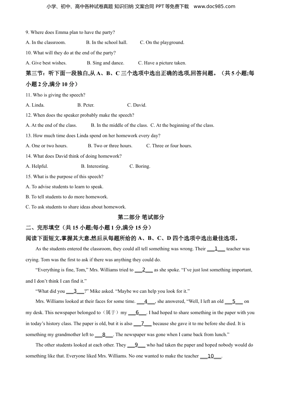 小学、初中、高中各种试卷真题知识归纳文案合同PPT等免费下载www.doc985.com2021年浙江省金华市中英语试题卷I说明:本卷共有三大题,45小题,满分70分。第一部分听力部分一、听力(共15小题;满分25分)第一节:听小对话,从A、B、C三个选项中选出正确的选项,回答问题。(共5小题;每小题1分,满分5分)1.WhatkindofsportsdoesJacklikebest?A.Running.B.Swimming.C.Skating.2.Whenwillthemoviestart?A.At7:30.B.At8:00.C.At8.303.Whowonthefirstprizeinthewritingcompetition?A.Mary.B.Mary’sfather.C.Mary’sbrother.4.Wheredoestheconversationmostprobablytakeplace?A.Inthemuseum.B.Intherestaurant.C.Inthehospital.5.WhydoesTonylookworried?A.Becausehedidn’tmeetTinaattheairport.B.Becausehegotuptoolateandmissedtheplane.C.Becausehelosthismobilephoneandcouldn’tfindit.第二节:听长对话,从A、B、C三个选项中选出正确的选项,回答问题。(共5小题;每小题2分,满分10分)听下面一段较长对话,回答下列问题。6.Whatistheprobablerelationshipbetweenthetwospeakers?A.Teacherandstudent.B.Doctorandpatient.C.Fatheranddaughter.7.Howdidtheaccidenthappen?A.Thecarwasrunningtoofast.B.Theyoungmanfelloffhisbicycle.C.Theyoungmandidn’tstopattheredlight.听下面一段较长对话,回答下列问题。8.HowdoesEmmafeeaboutplanningfortheparty?A.Surprised.B.Happy.C.Terrible.小学、初中、高中各种试卷真题知识归纳文案合同PPT等免费下载www.doc985.com9.WheredoesEmmaplantohavetheparty?A.Intheclassroom.B.Intheschoolhall.C.Ontheplayground.10.Whatwilltheydoattheendoftheparty?A.Givebestwishes.B.Singanddance.C.Haveapicturetaken.第三节:听下面一段独白,从A、B、C三个选项中选出正确的选项,回答问题。(共5小题;每小题2分,满分10分)11.Whoisgivingthespeech?A.Linda.B.Pcter.C.David.12.Whendoesthespeakerprobablymakethespeech?A.Attheendoftheclass.B.Inthemiddleoftheclass.C.Atthebeginningoftheclass.13.HowmuchtimedoesLindaspendonherhomeworkeveryday?A.Oneortwohours.B.Twoorthreehours.C.Threeorfourhours.14.WhatdoesDavidthinkofdoinghomework?A.Helpful.B.Interesting.C.Boring.15.Whatisthepurposeofthisspeech?A.Toadvisestudentstolearntospeak.B.Totellstudentstodomorehomework.C.Toaskstudentstoshareideasabouthomework.第二部分笔试部分二、完形填空(共15小题;每小题1分,满分15分)阅读下面短文,掌握其大意,然后从每题所给的A、B、C、D四个选项中选出最佳选项。Asthestudentsenteredtheclassroom,theycouldalltellsomethingwaswrong.Their___1___teacherwascrying.Tomwasthefirsttoaskiftherewasanythingtheycoulddo.“Everythingisfine,Tom,”Mrs.Williamstriedto___2___asshespoke.“I’vejustlostsomethingimportant,andIdon’tthinkIcanfindit.”“Whatdidyou___3___?”Mikeasked.“Maybewecanhelpyoulookforit.”Mrs.Williamslookedattheirfacesforsometime.___4___,sheanswered,“Well,Ileftanold___5___onmydesk.Thisnewspaperbelongedto(属于)my___6___.Ihadhopedtosharesomethinginthepaperwithyouintoday’shistoryclass.Thepaperisold,butitisalso___7___becauseshegaveittomebeforeshedied.Itissomethingmygrandmotherleftto___8___.ThenewspaperwasgonewhenIcamebackfromlunch.”Theotherstudentslookedateachother.They___9___whohadtakenthepaperandhopednobodywoulddosomethinglikethat.EveryonelikedMrs.Williams.Noonewantedtomaketheteacher___10___.小学、初中、高中各种试卷真题知识归纳文案合同PPT等免费下载www.doc985.comTrevorwentoverandspokeupforthewholeclass.“___11___,Mrs.Williams.Wewillallhelpyou.We’resuretofindit___12___weworktogether.”Mrs.Williamssmiledagainatherstudents.Sheknewtheymightnotfindthemissingpaper,buteveniftheydidn’t,shewould___13___feelverylucky.Shehadagroupofstudent...