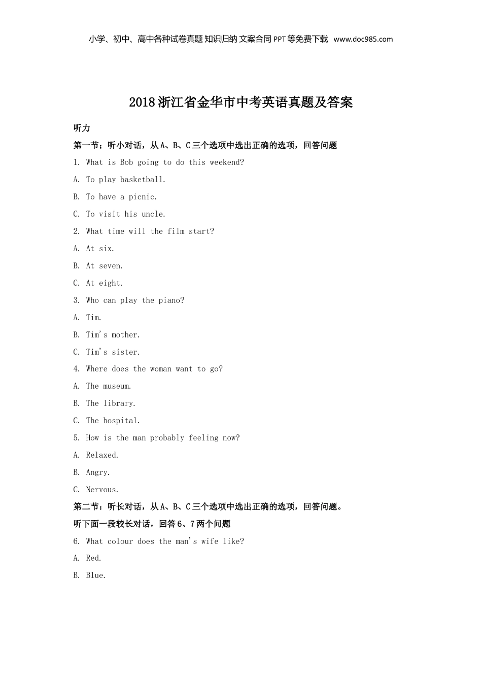 小学、初中、高中各种试卷真题知识归纳文案合同PPT等免费下载www.doc985.com2018浙江省金华市中考英语真题及答案听力第一节;听小对话,从A、B、C三个选项中选出正确的选项,回答问题1.WhatisBobgoingtodothisweekend?A.Toplaybasketball.B.Tohaveapicnic.C.Tovisithisuncle.2.Whattimewillthefilmstart?A.Atsix.B.Atseven.C.Ateight.3.Whocanplaythepiano?A.Tim.B.Tim'smother.C.Tim'ssister.4.Wheredoesthewomanwanttogo?A.Themuseum.B.Thelibrary.C.Thehospital.5.Howisthemanprobablyfeelingnow?A.Relaxed.B.Angry.C.Nervous.第二节:听长对话,从A、B、C三个选项中选出正确的选项,回答问题。听下面一段较长对话,回答6、7两个问题6.Whatcolourdoestheman'swifelike?A.Red.B.Blue.小学、初中、高中各种试卷真题知识归纳文案合同PPT等免费下载www.doc985.comC.Purple.7.Howmuchisthescarf?A.$29.B.$39C.$49.听下面一段较长对话,回答8~10三个问题。8.WhodidJohnmeetyesterdayevening?A.Australianmusicians.B.Australianstudents.C.Australianteachers.9.WhatdidJohntalkaboutwiththeforeigners?A.Chinesefood.B.Englishlearning.C.Popmusic.10.WhenwillJohngototheEnglishclubagain?A.NextFridayevening.B.NextSaturdaymorning.C.NextSundayafternoon.第三节:听下面一段独白,从A、B、C三个选项中选出正确的选项,回答问题。11.WheredoesSamcomefrom?A.France.B.America.C.England.12.WhendidSamgototheoldvillage?A.Yesterdaymorning.B.Yesterdayafternoon.C.Yesterdayevening.13.WhathappenedtoSaminthevillage?A.Hewaslost.小学、初中、高中各种试卷真题知识归纳文案合同PPT等免费下载www.doc985.comB.Hegothurt.C.Helostabag.14.WhocametoseeSamwiththehotelmanager?A.Aschoolboy.B.Ateacher.C.Apoliceman.15.WhydidSamwritetheletter?A.Tomakeaninvitation.B.Toaskforhelp.C.Togivesomeadvice.二、完形填空阅读下面短文,掌握其大意,然后从每题所给的A、B、C、D四个选项中选出最佳选项Onemorning,whenIwasleavingformybusiness,amiddle-agedmancameupandaskedmeforhelp.Hesaidhehadno____1____togetfoodforhislargefamily.Youlook____2____.Whydon’tyouwork?”Iasked.“SimplybecauseIcannotgetwork,sir.”“IfIgiveyouwork,whatpaydoyouwant?”“____3____Icangetbreadformyfamily,sir.”heanswered.Idecidedtofindoutifhe___4___meantwhathesaid."OK.I'llgiveyouonepoundanhour,ifyouwill___5___abrick(砖)underyourarmandwalkaroundthesquareforfivehourswithoutstopping.“”Thankyou,sir.Iwill.“IfoundabrickandstartedhimonhiswalkbeforeIwenttomy____6____.Ineverthoughthewouldhehad____7____.WhenIcamebackfivehourslater,Isawhim____8____walking,withthebrickunderhisarm.Istoppedhimandgavehim____9____pounds.Hethankedmeandtoldmethatsomepeoplehad_____10_____tohelphimwhentheyknewwhyhewasdoingallthis.Hewouldgoandask_____11_____forwork.Beforeleaving,heaskedifI小学、初中、高中各种试卷真题知识归纳文案合同PPT等免费下载www.doc985.comwouldgivehimthe_____12_____.Idid.Severalyearslater,awell-dressedmangreetedmeonatrain.SeeingIwasnotsurewhohewas,he____13____thathewasthebrickmanandhadhisownbusinessnow.“Youknow,Istillkeepthatbrickandalwaysvalueitasthemost_____14_____thingIhaveasithasbroughtmeluckandsuccess.”_____15_____,itwasnotthebrickthatmadethemansuccessful,buthisfaithfulness(坚定)indoingevenaverylittlething.1.A.courageB.moneyC.planD.time2.A.funnyB.sickC.seriousD.strong3.A.AslongasB.AssoonasC.EvenifD.Eversince4.A.certainlyB.simpleC.reallyD.usually5.A.breakB.carryC.fixD.hide6.A.businessB.lessonC.programmeD.research7.A.plannedB.preparedC.promisedD.suggested8.A.alsoB.alreadyC.evenD.still9.A.fourB.fiveC.sixD.seven10.A.continuedB.forgottenC.offeredD.refused11.A.himB.them...