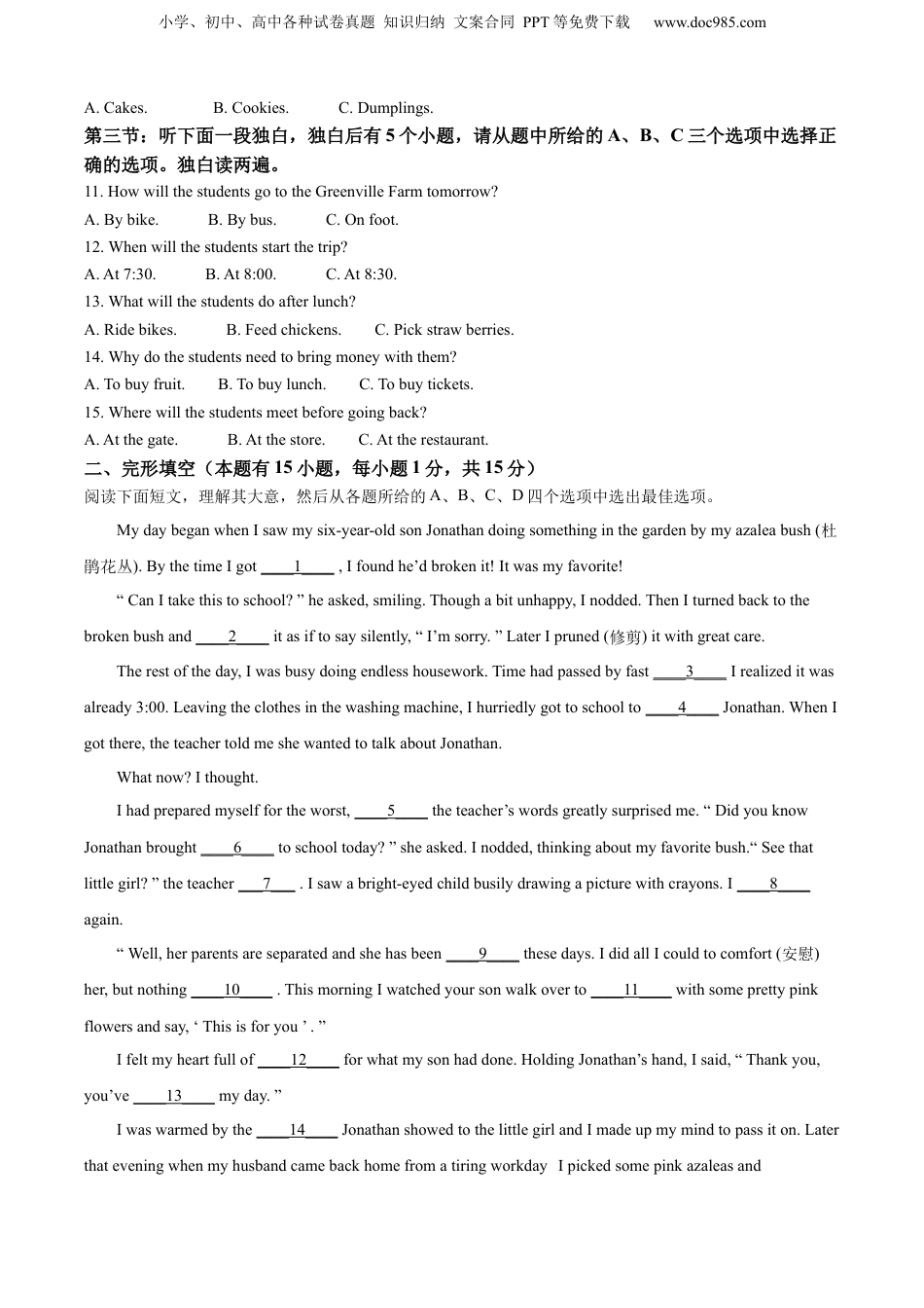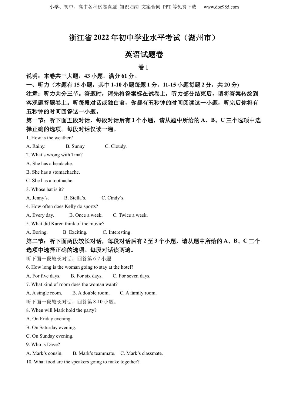 小学、初中、高中各种试卷真题知识归纳文案合同PPT等免费下载www.doc985.com浙江省2022年初中学业水平考试(湖州市)英语试题卷卷Ⅰ说明:本卷共三大题,43小题,满分61分。一、听力(本题有15小题,其中1-10小题每题1分,11-15小题每题2分,共20分)注意:听力共分三节。答题时,请先将答案标在试卷上,听力部分结束后,请将答案转涂到客观题答题卷上。听每段对话或独白前,你都有五秒钟的时间阅读这一小题,听完后你将有五秒钟的时间回答这一小题。第一节:听下面五段对话,每段对话后有1个小题,请从题中所给的A、B、C三个选项中选择正确的选项。每段对话仅读一遍。1.Howistheweather?A.Rainy.B.SunnyC.Cloudy.2.What’swrongwithTina?A.Shehasaheadache.B.Shehasastomachache.C.Shehasatoothache.3.Whosehatisit?A.Jenny’s.B.Stella’s.C.Cindy’s.4.HowoftendoesKellydosports?A.Everyday.B.Onceaweek.C.Twiceaweek.5.WhatdidKarenthinkofthemovie?A.Boring.B.Exciting.C.Interesting.第二节:听下面两段较长对话,每段对话后有2至3个小题,请从题中所给的A、B、C三个选项中选择正确的选项。每段对话读两遍。听下面一段较长对话,回答第6-7小题。6.Howlongisthewomangoingtostayatthehotel?A.Forfivedays.B.Forsixdays.C.Forsevendays.7.Whatkindofroomdoesthewomanwant?A.Asingleroom.B.Adoubleroom.C.Afamilyroom.听下面一段较长对话,回答第8-10小题。8.WhenwillMarkholdtheparty?A.OnFridayevening.B.OnSaturdayevening.C.OnSundayevening.9.WhoisDave?A.Mark’scousin.B.Mark’steammate.C.Mark’sclassmate.10.Whatfoodarethespeakersgoingtomaketogether?小学、初中、高中各种试卷真题知识归纳文案合同PPT等免费下载www.doc985.comA.Cakes.B.Cookies.C.Dumplings.第三节:听下面一段独白,独白后有5个小题,请从题中所给的A、B、C三个选项中选择正确的选项。独白读两遍。11.HowwillthestudentsgototheGreenvilleFarmtomorrow?A.Bybike.B.Bybus.C.Onfoot.12.Whenwillthestudentsstartthetrip?A.At7:30.B.At8:00.C.At8:30.13.Whatwillthestudentsdoafterlunch?A.Ridebikes.B.Feedchickens.C.Pickstrawberries.14.Whydothestudentsneedtobringmoneywiththem?A.Tobuyfruit.B.Tobuylunch.C.Tobuytickets.15.Wherewillthestudentsmeetbeforegoingback?A.Atthegate.B.Atthestore.C.Attherestaurant.二、完形填空(本题有15小题,每小题1分,共15分)阅读下面短文,理解其大意,然后从各题所给的A、B、C、D四个选项中选出最佳选项。MydaybeganwhenIsawmysix-year-oldsonJonathandoingsomethinginthegardenbymyazaleabush(杜鹃花丛).BythetimeIgot____1____,Ifoundhe’dbrokenit!Itwasmyfavorite!“CanItakethistoschool?”heasked,smiling.Thoughabitunhappy,Inodded.ThenIturnedbacktothebrokenbushand____2____itasiftosaysilently,“I’msorry.”LaterIpruned(修剪)itwithgreatcare.Therestoftheday,Iwasbusydoingendlesshousework.Timehadpassedbyfast____3____Irealizeditwasalready3:00.Leavingtheclothesinthewashingmachine,Ihurriedlygottoschoolto____4____Jonathan.WhenIgotthere,theteachertoldmeshewantedtotalkaboutJonathan.Whatnow?Ithought.Ihadpreparedmyselffortheworst,____5____theteacher’swordsgreatlysurprisedme.“DidyouknowJonathanbrought____6____toschooltoday?”sheasked.Inodded,thinkingaboutmyfavoritebush.“Seethatlittlegirl?”theteacher___7___.Isawabright-eyedchildbusilydrawingapicturewithcrayons.I____8____again.“Well,herparentsareseparatedandshehasbeen____9____thesedays.IdidallIcouldtocomfort(安慰)her,butnothing____10____.ThismorningIwatchedyoursonwalkoverto____11____withsomeprettypinkflowersandsay,‘Thisisforyou’.”Ifeltmyheartfullof____12____forwhatmysonhaddone.HoldingJonathan’shand,Isaid,“Thankyou,you’ve____13____myday.”Iwaswarmedbythe____14____JonathanshowedtothelittlegirlandImad...