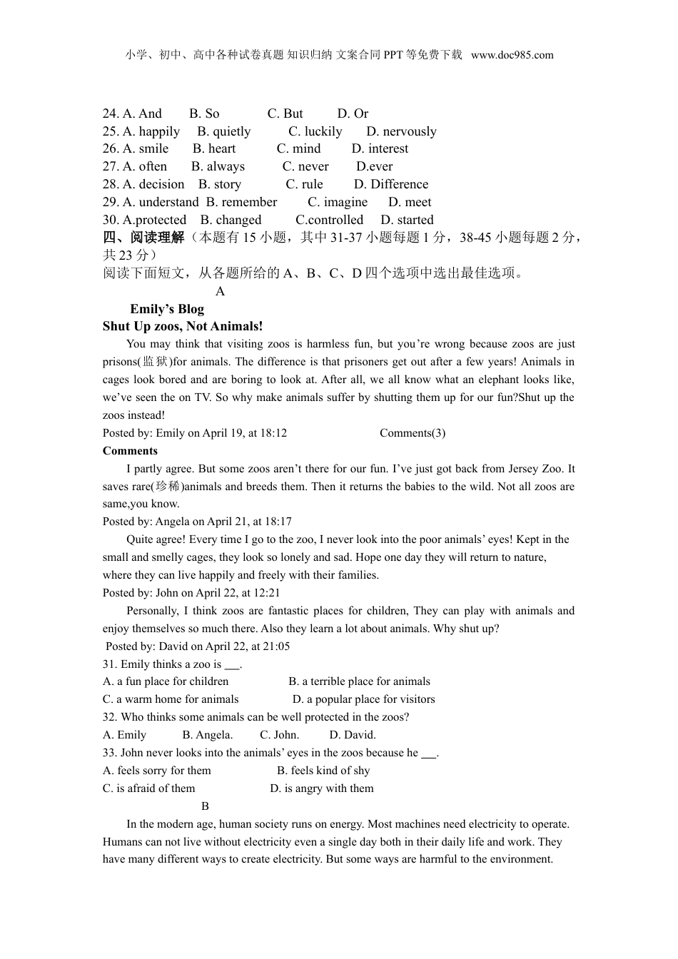 小学、初中、高中各种试卷真题知识归纳文案合同PPT等免费下载www.doc985.com2016湖州中考英语试卷卷Ⅰ考生须知:1.全卷分试卷和答题卷两部分,试卷共8页,答题卷共2页。全卷满分为100分,考试时间为100分钟。2.试卷分卷Ⅰ和卷Ⅱ两部分,卷Ⅰ中试卷(1-66小题)的答案填涂在答卷上,卷Ⅱ中试题的答案写在答题卷相应的位置上,写在试卷上无效。说明:本卷共六大题,66小题,满分76分。一、听力(本题有15小题,其中1—10小题每题1分,11—15小题每题2分,共20分)注意:听力共分三节,答题时,请先将答案标在试卷上,听力部分结束后,请将答案转涂到客观题答题卷上。听每段对话或独白前,你都有五秒钟时间阅读这一小题,听完后你将有五秒钟时间回答这一小题。第一节:听下面的对话,每段对话后有1个小题,请从题中所给的A、B、C三个选项中选择正确的选项,每段对话仅读一遍。1.Whenwillthemangivethereport?A.NextSunday.B.NextMonday.C.NextFriday.2.WhatdoesLindalikeabouttherestaurant?A.Thefood.B.Theservice.C.Theenvironment.3.Whowenttothemoviewiththewoman?A.Hersister.B.Herbrother.C.Hercousin.4.WhyisthemangoingtoLondon?A.Toworkthere.B.TovisitafriendC.Tohaveavacation.5.WherearethespeakersgoingtonextSunday?A.Tothepark.B.Tothezoo.C.Tothemuseum.第二节:听下面两段较长对话,每段对话后有2至3个小题,请从题中所给的A、B、C、三个选项中选择正确的选项,每段对话读两遍。请听下面一段较长对话,回答6—7小题。6.WhereisDaisyatthemoment?A.Intheschool.B.Onabus.C.Atabusstop.7.HowmightDaisygohome?A.Bytaxi.B.Bycar.C.Onfoot.请听下面一段较长对话,回答8—10小题。8.WhatdoyouknowaboutSam?A.Heislazy.B.Heisimpolite.C.Heiscareless.9.WheremaySamfindhisglasses?A.Inthebathroom.B.Inthelivingroom.C.Inthebedroom.10.What’stherelationshipbetweenthespeaker?A.Motherandson.B.Teacherandstudent.C.Wifeandhusband.第三节:听下面一段独白,独白后有5个小题,请从题中给所的A、B、C三个选项中选择正确的选项,独白要读两遍。11.What’sthemainruleTomhastofollow?小学、初中、高中各种试卷真题知识归纳文案合同PPT等免费下载www.doc985.comA.Studyinghard.B.Goingtobedearly.C.Cleaninghisroom.12.WhattimedoesTomhavetogotobedonschoolnights?A.By10p.m.B.By11p.m.C.By12p.m.13.HowwillTom’sparentsfeelifheleavesthingseverywhere?A.Bored.B.Angry.C.Sad.14.WhatdoesTomoftenputonthewall?A.Maps.B.Rules.C.Posters.15.What’sthepassagemainlyabout?A.FamilyphotosB.FamilyrulesC.Familymembers.二、完形填空(本小题有15小题,每小题1分,共15分)阅读下面短文,理解其大意,然后从各题所给的A、B、C、D四个选项中选出最佳选项。Istronglybelievetherightwordsatjusttherighttimecouldchangesomeone’slife.WhenIwas3yearsold,myparents16Iwastotallydeaf.Butfromthethirdgrade,theydecidedtoputmeina“mainstream”schoolwhereallofmyclassmateshad17hearing.SoIwastheonlydeafchildatBlueCreekElementarySchool.Fromthefirstdaythere,theotherkidsoften18meandcalledmenamesmainlybecauseofmyhearingaid(助听器)andthewayItalked.Iwas19throughoutelementaryschool.Besidestheproblemsof“fittingin”withtheotherstudents,Ialsohad20withmostofmyschoolwork.Onemorning,MrsJordan,myfifth-gradeteacher,asked21aquestioninhermathclass.Shewasalargewomanwitha22thatbouncedoffthewallsofhertinyclassroom,anditcouldevenspreadtothehallway.I23herlips(嘴唇)andimmediatelyraisedmyhand.ForonceIknewtheanswer!24Iwasafraidwhenshecalledonme.ThenIansweredherquestion25Iwillneverforgetwhathappenednext.MrsJordanpointeddirectlyatme.Withsparkling(闪光的)eyesandawide26,shecried,“THAT’SRIGHT,STEPHEN!”Forthefirsttimeinmyyounglife,Ibecameashiningstar.Ihad27beensoexcitedbefore!RightthenandthereImadea28thatIwouldmakea...